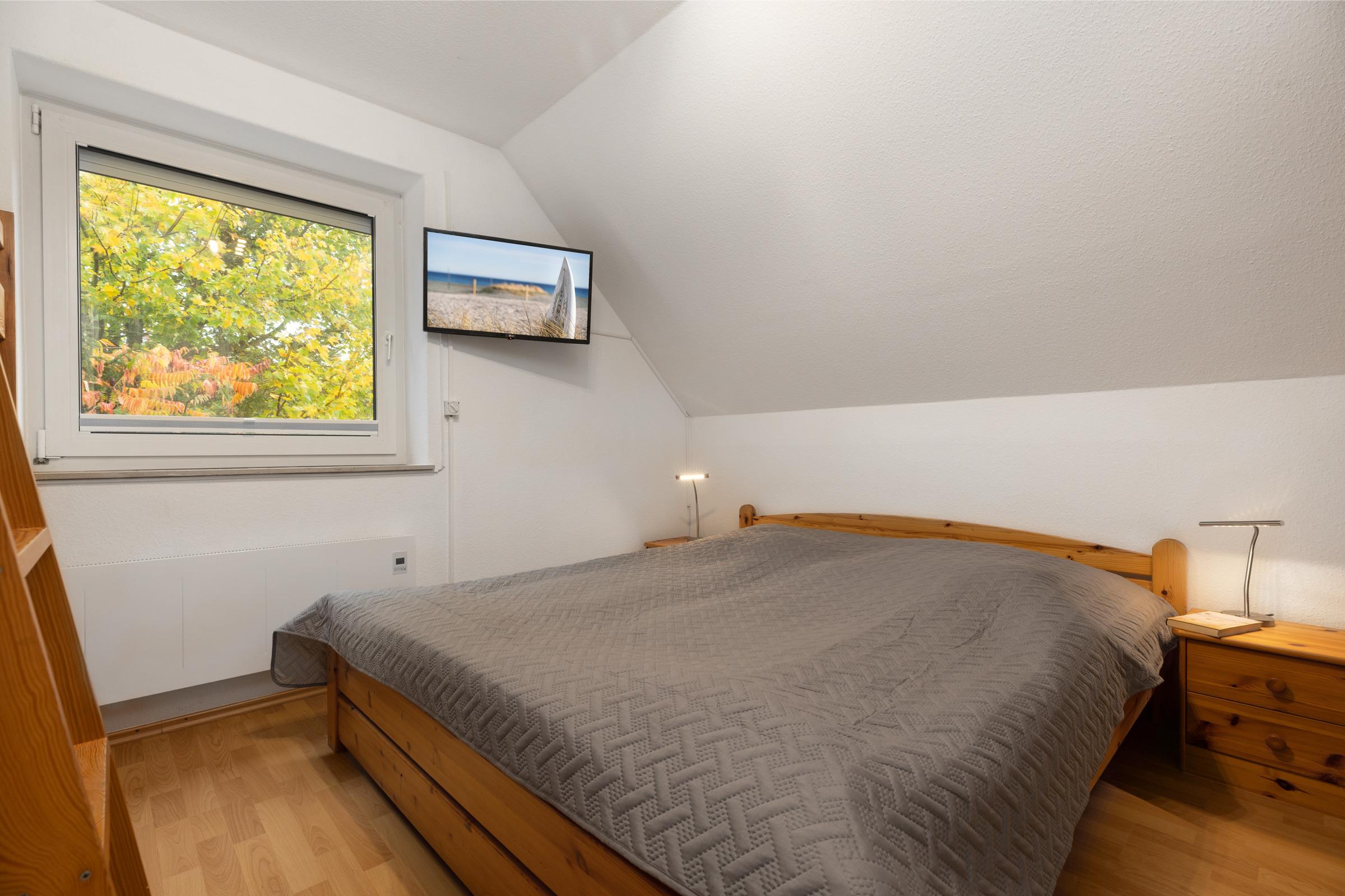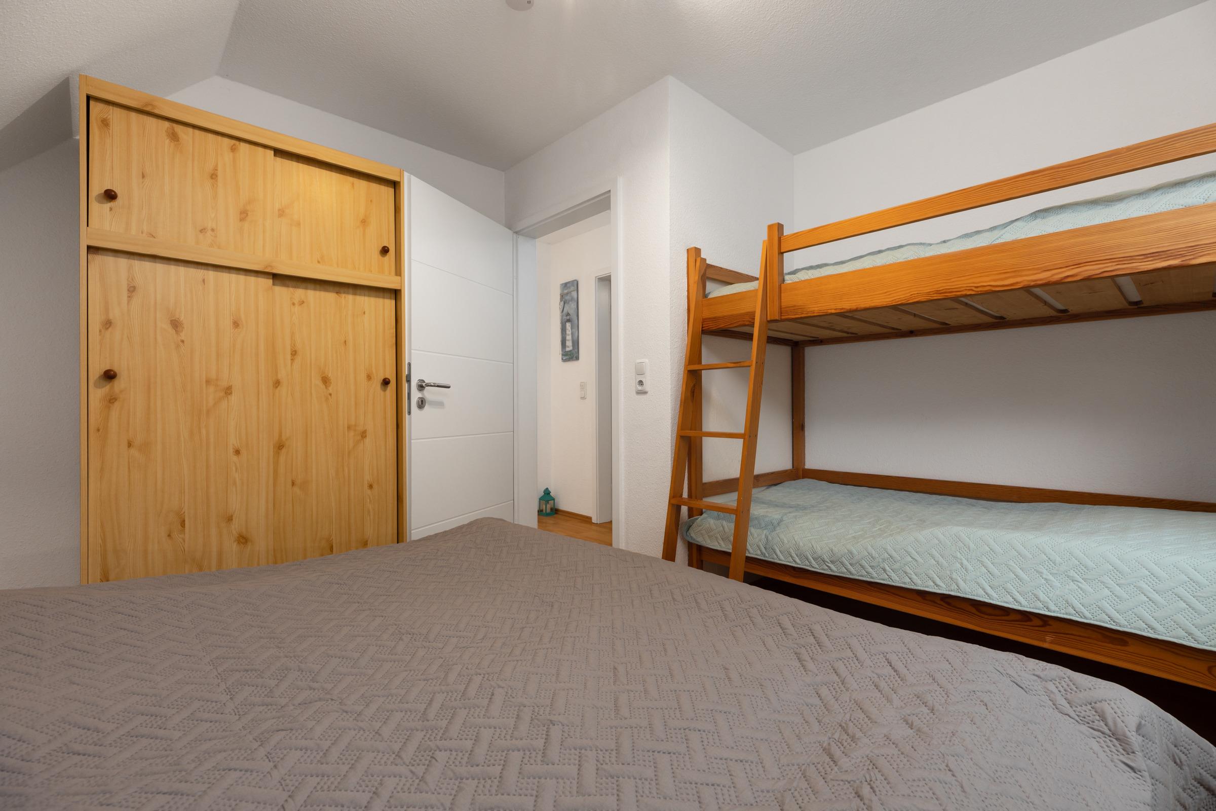 Schlafzimmer 2: Doppelbett, Etagenbett, TV, Verdunkelung (Außenjalousien)