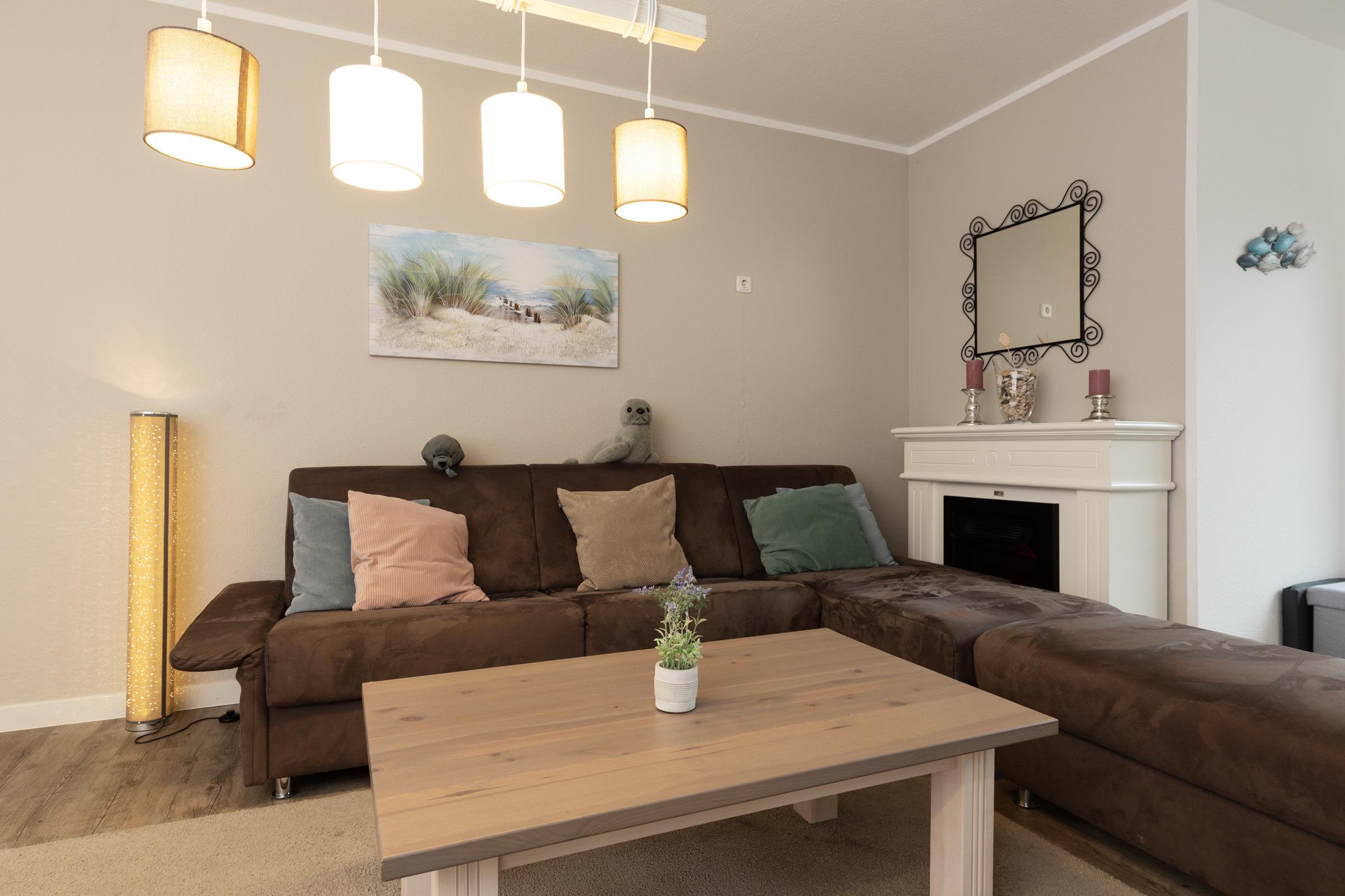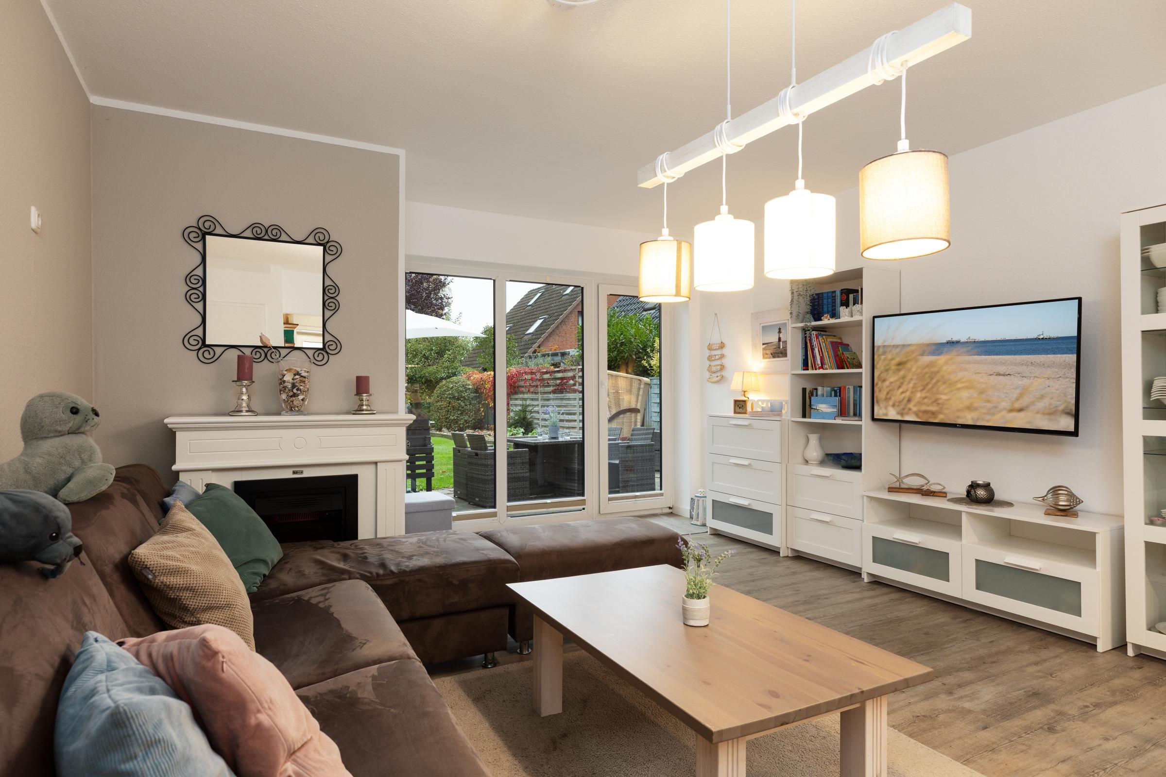 Im geräumigen Wohnzimmer sorgt ein E-Kamin neben der Heizung an kühlen Tagen für eine gemütliche Wärme. Die 2 Schlafzimmer sind mit elektrischen Rollläden und ebenfalls mit 2 weiteren Smart-TV-Fernsehern ausgestattet. Weiterhin gibt es 2 Doppelbetten sowie einem Etagenbett für Kinder. Genießen Sie die Abende mit Ihren Lieblingsfilmen aus der Mediathek oder lassen Sie sich es mit einem Fondue-Abend gut gehen (ein Elektro-Fondue gehört zur Ausstattung).