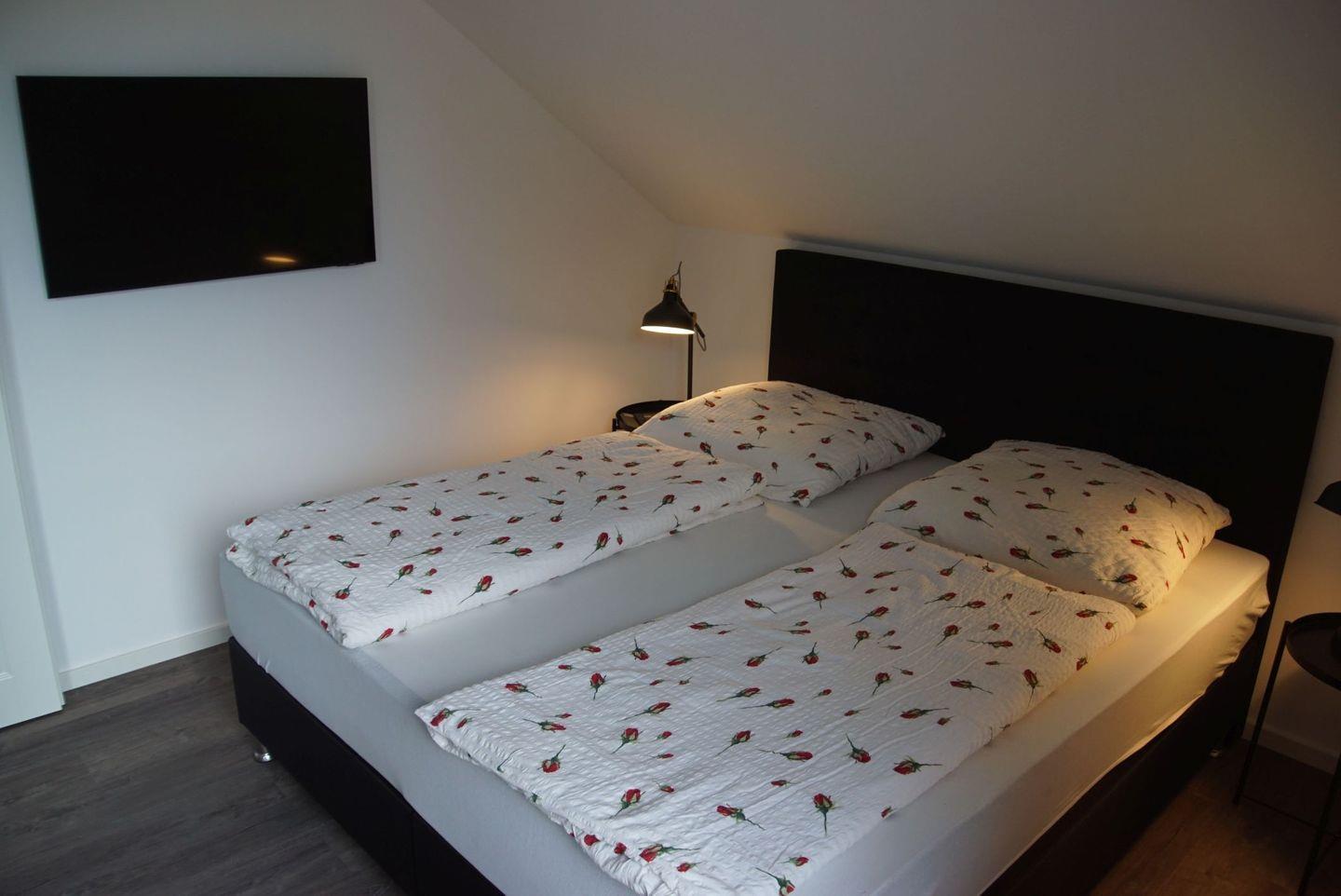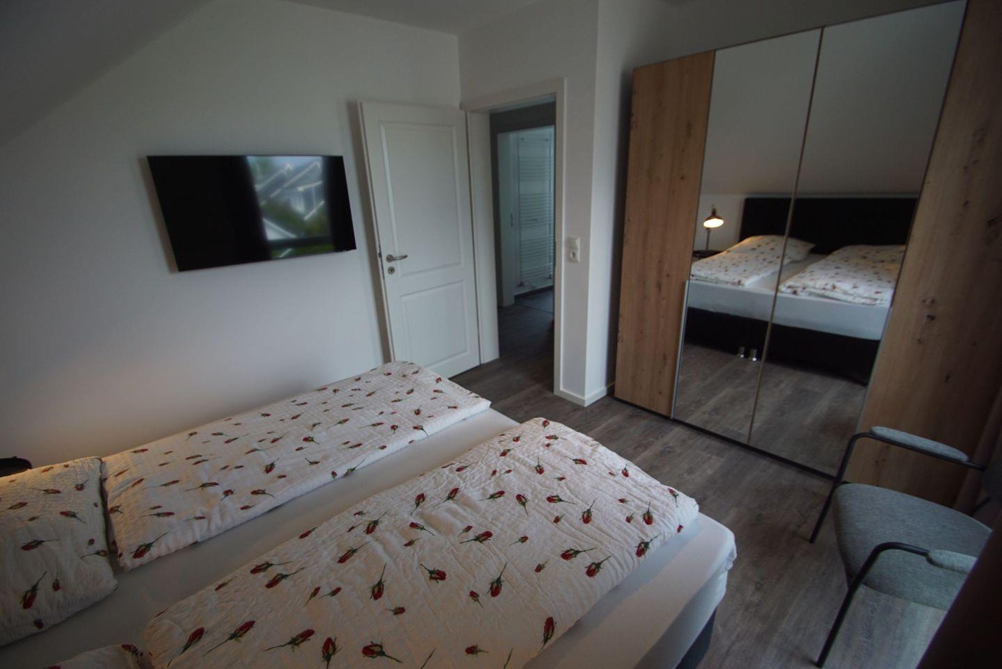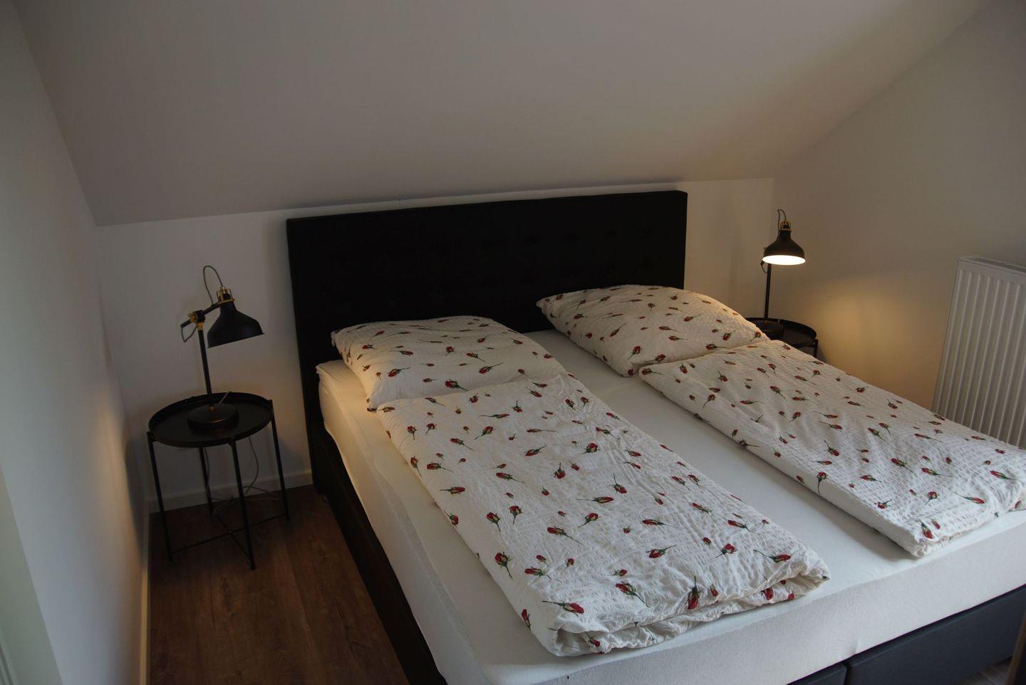 Insgesamt stehen Ihnen drei geschmackvoll eingerichtete Schlafzimmer zur Verfügung. Das erste Schlafzimmer im Obergeschoss verfügt über ein komfortables Doppelbett mit einer großen Matratze, einen geräumigen Kleiderschrank und einen Fernseher. Das zweite Schlafzimmer bietet Ihnen denselben Komfort und Stil. Im dritten Schlafzimmer steht ebenfalls ein Doppelbett mit einer großen Matratze und ein Kleiderschrank bereit.