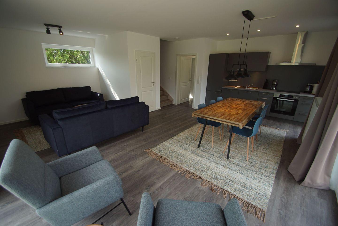 Das Wohnzimmer lädt zum Entspannen ein. Nehmen Sie auf dem bequemen Sofa Platz und genießen Sie einen Film oder Ihre Lieblingsserie auf dem Flachbildfernseher.