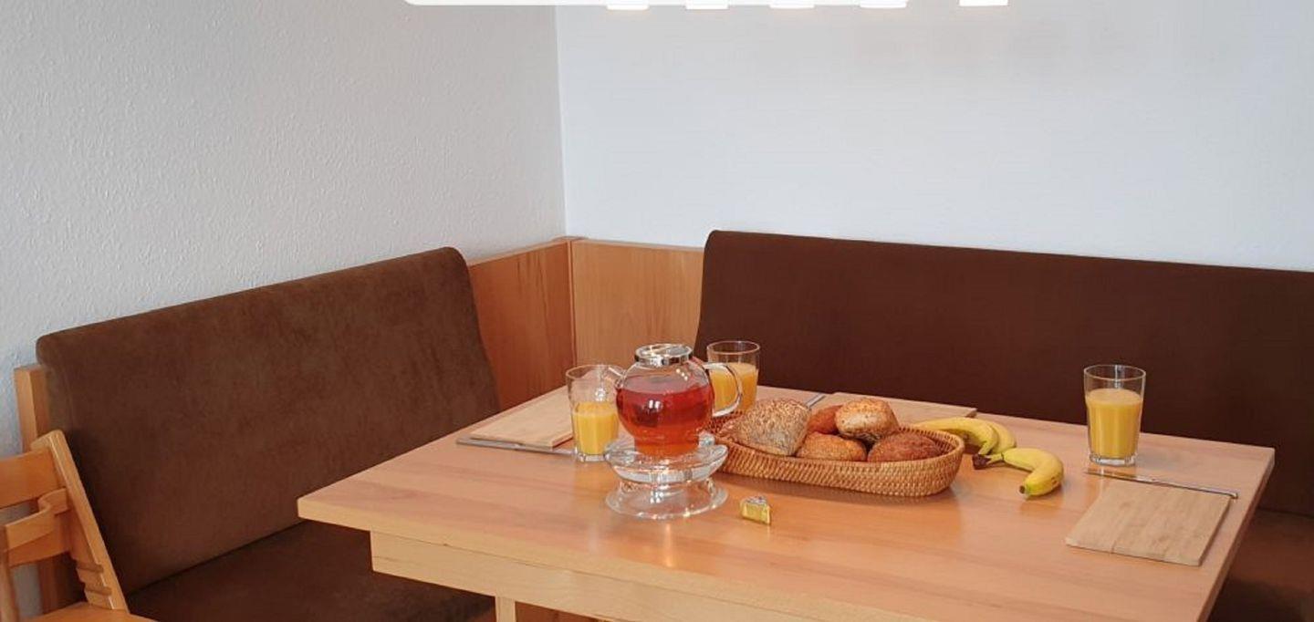 Der Essbereich bietet einen großzügigen Esstisch, eine gemütliche Eckbank und zwei Stühle. Auch ein Kinderhochstuhl vom Typ Tripp-Trapp steht für die kleinen Gäste bereit.