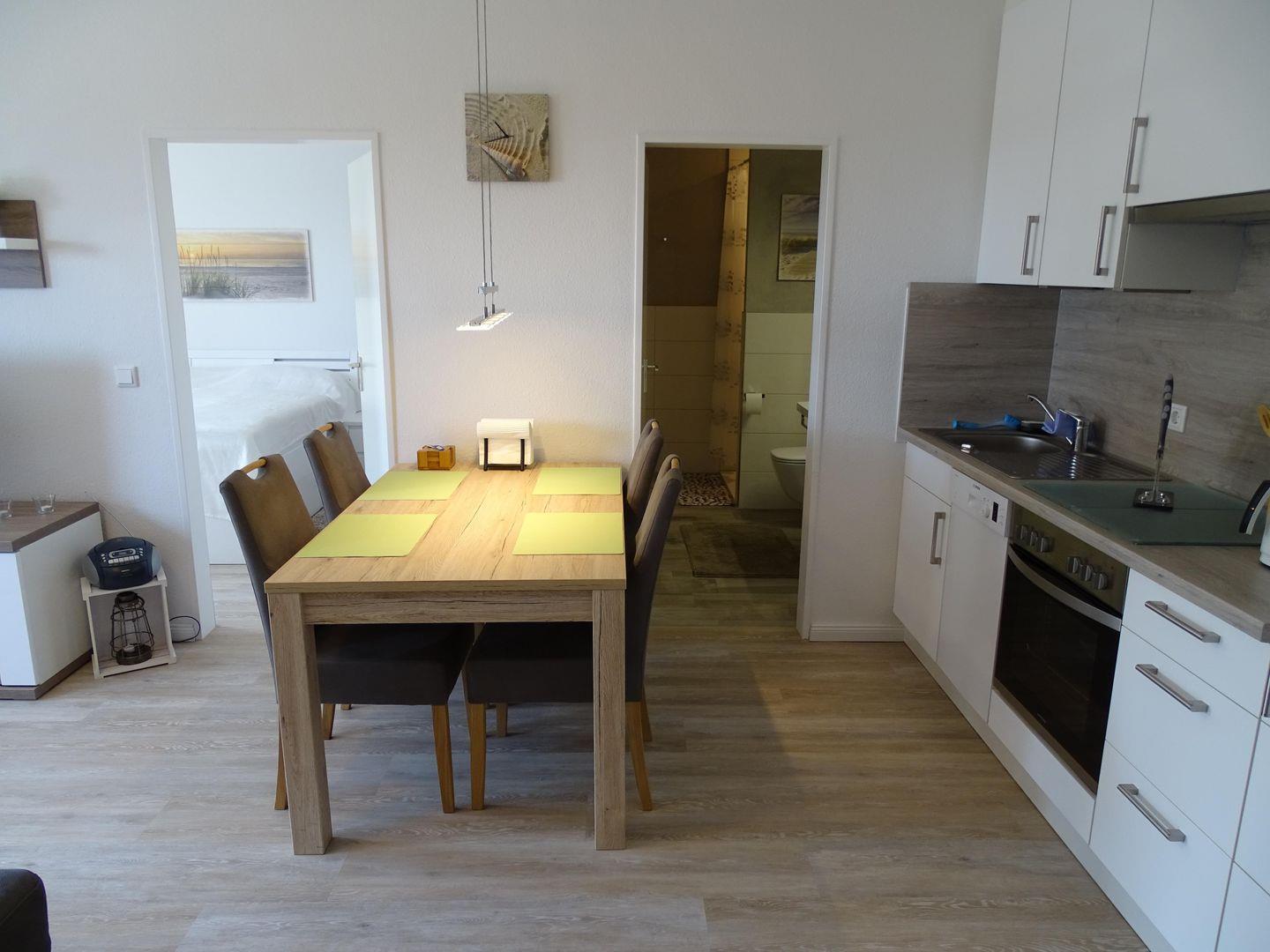 Im Inneren erwartet Sie ein offener und einladender Raum, der Küche, Essbereich und Wohnzimmer vereint. Die komplett eingerichtete Einbauküche bietet Ihnen alle Annehmlichkeiten, die Sie für die Zubereitung Ihrer Mahlzeiten benötigen. Ein 4-Platten-Herd, Backofen, Kühlschrank mit Gefrierfach, Mikrowelle, Geschirrspüler und weitere Küchenutensilien stehen Ihnen zur Verfügung. Starten Sie den Tag mit einer Tasse frisch gebrühtem Kaffee aus der Kaffeemaschine und genießen Sie Ihr Frühstück am Esstisch mit vier Stühlen.
