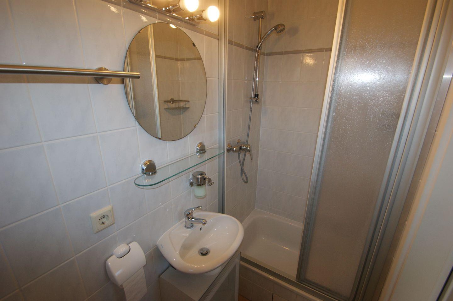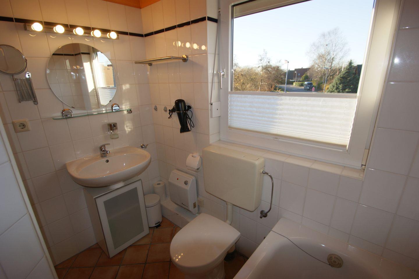 Das Badezimmer im Obergeschoss lädt mit einer einladenden Badewanne zum Entspannen ein. Ein WC, ein Waschbecken und ein Fön stehen Ihnen ebenfalls zur Verfügung. Im Erdgeschoss befindet sich ein Gäste-WC mit Dusche, das Ihnen zusätzlichen Komfort bietet.