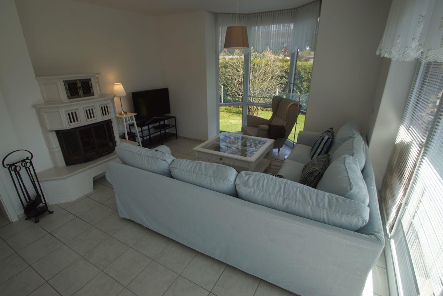 Das Wohnzimmer lädt mit seinem gemütlichen Sofa und dem einladenden Kamin zum Entspannen ein. Hier können Sie sich zurücklehnen, einen Film auf dem Flachbildfernseher schauen oder einfach nur die wohlige Atmosphäre genießen. Der angrenzende Essbereich bietet Platz für vier Personen und lädt zu gemeinsamen Mahlzeiten ein. Ein Kinderhochstuhl steht Ihnen hier kostenfrei zur Verfügung, um auch den kleinen Gästen gerecht zu werden.