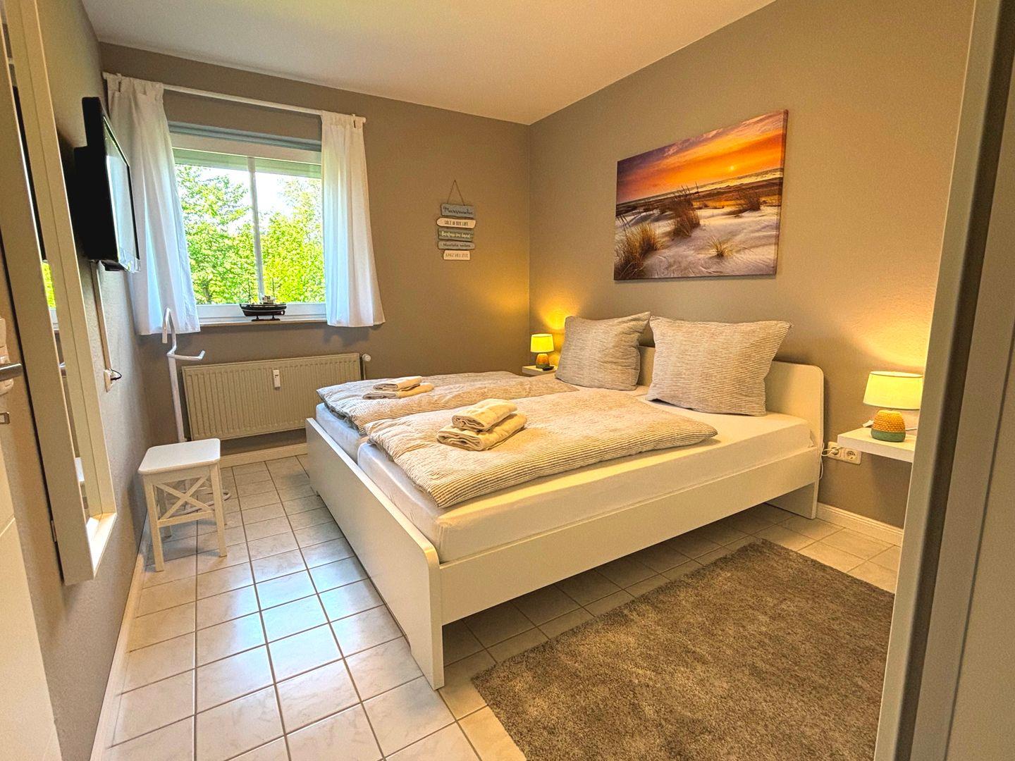 Im Schlafzimmer erwartet Sie ein komfortables Doppelbett für erholsame Nächte. Ein geräumiger Kleiderschrank bietet ausreichend Platz für Ihre Garderobe, und ein weiterer Fernseher sorgt für Unterhaltung auch im Schlafzimmer.