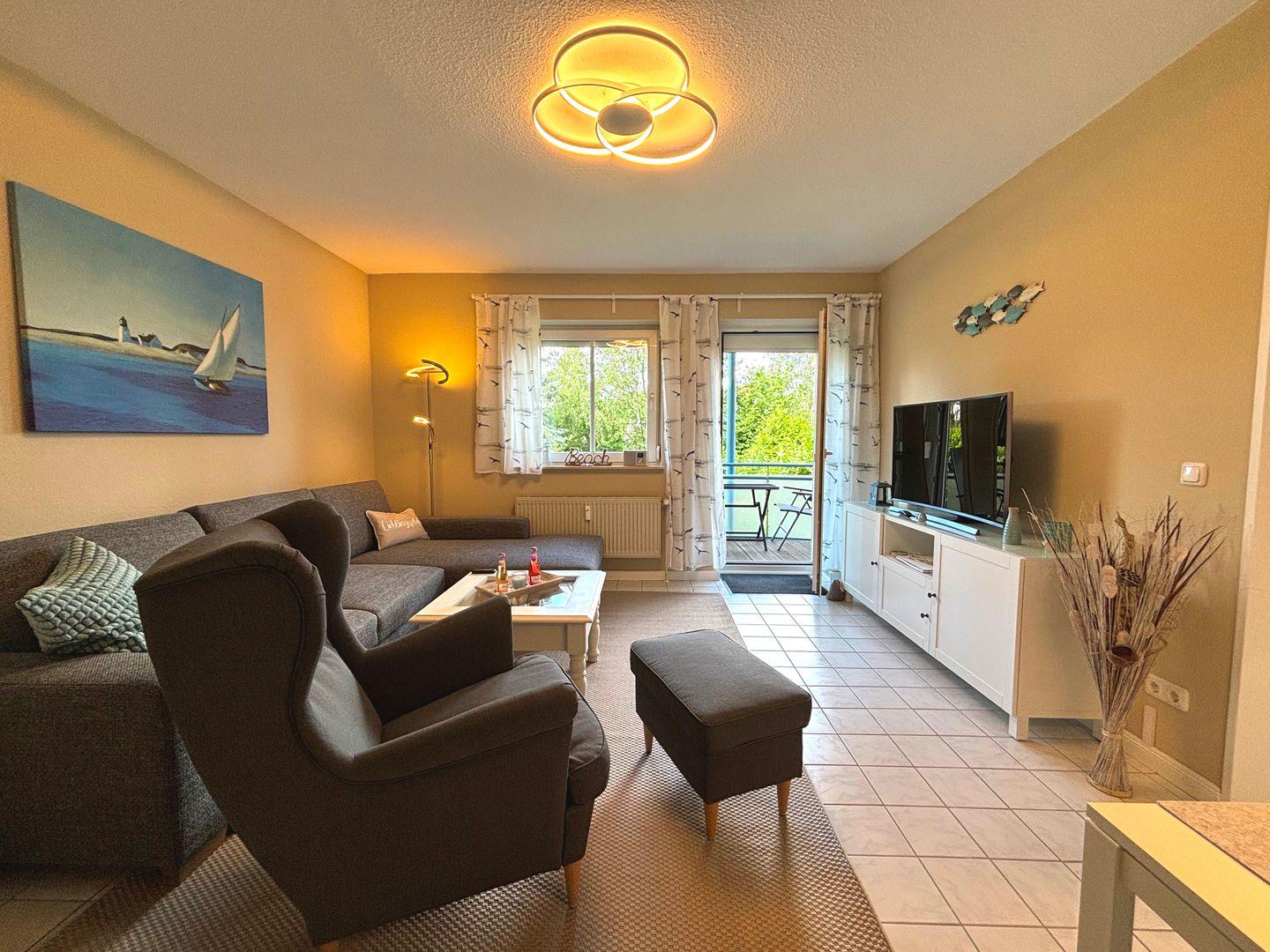 Das helle und freundliche Wohnzimmer lädt zum Entspannen ein. Ein bequemes Schlafsofa, ein gemütlicher Sessel und ein stilvoller Tisch bieten viel Platz zum Relaxen. Ein großer Fernseher sorgt für beste Unterhaltung.