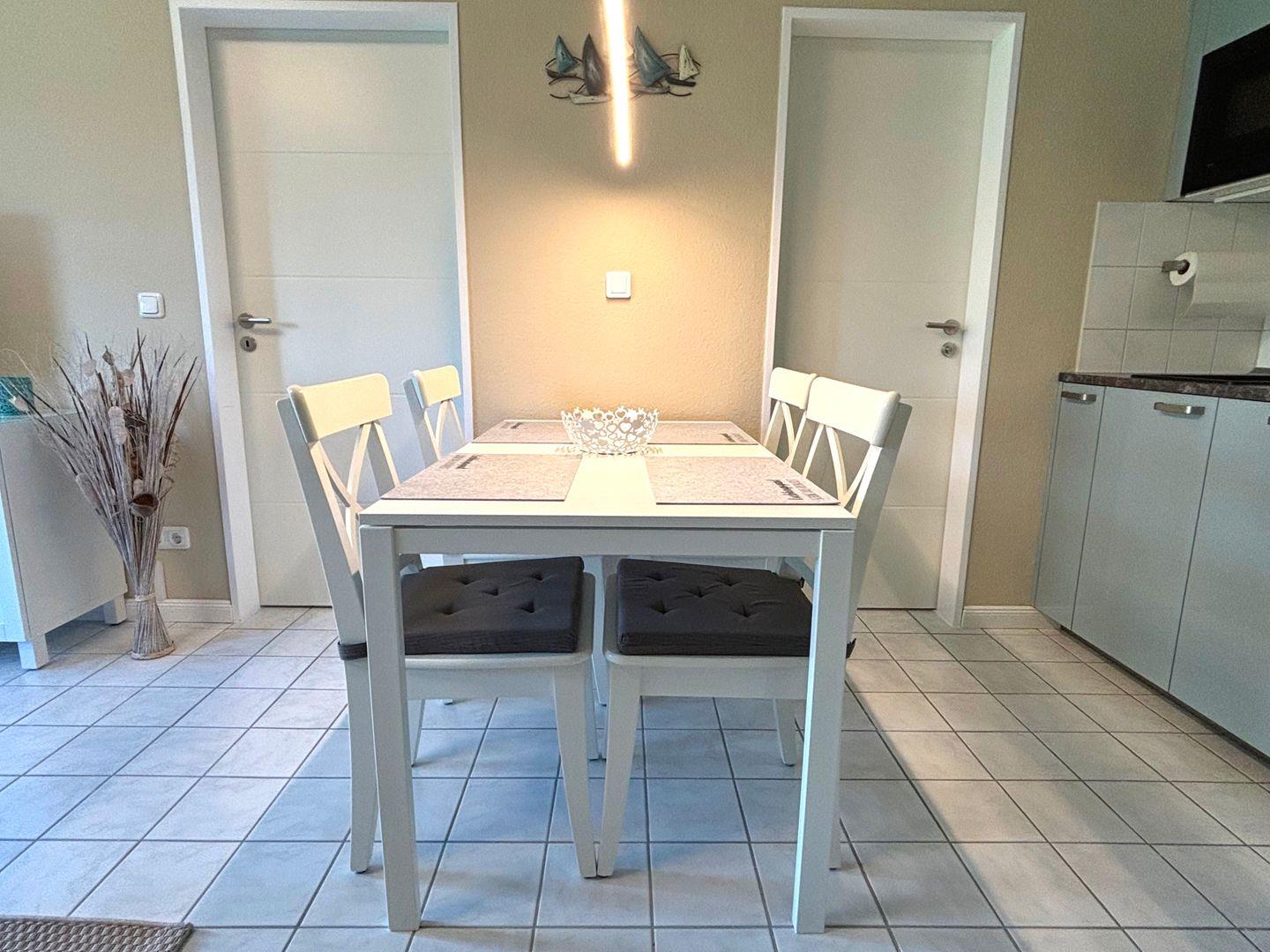 Der Essbereich ist mit einem eleganten Tisch und vier bequemen Stühlen ausgestattet – ideal für gemeinsame Mahlzeiten und gemütliche Spieleabende.