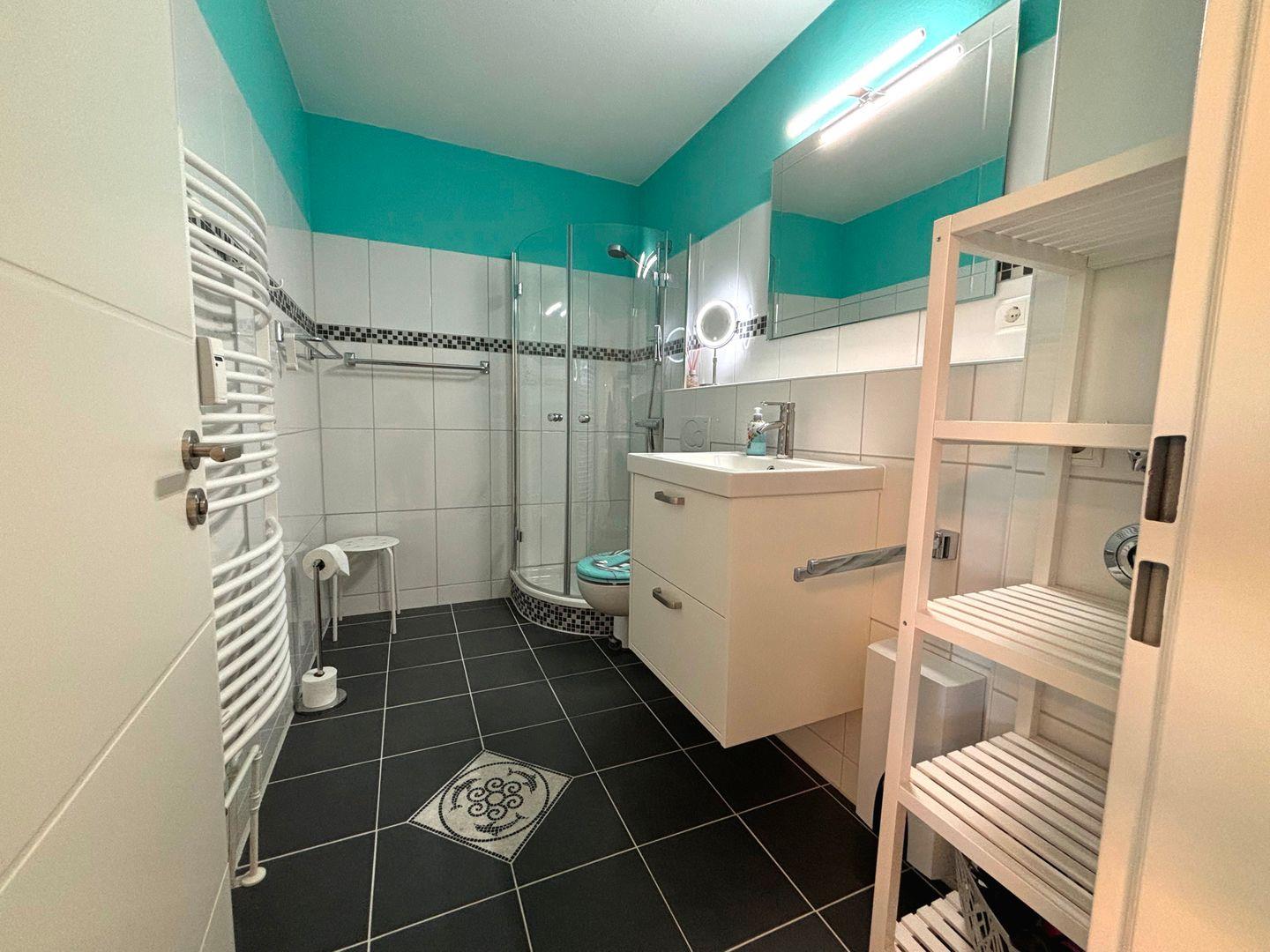 Das Badezimmer ist modern und stilvoll gestaltet. Es verfügt über eine erfrischende Dusche, einen Handtuchheizkörper und einen praktischen Kosmetikspiegel. Hier können Sie Ihren Tag entspannt beginnen und ausklingen lassen.