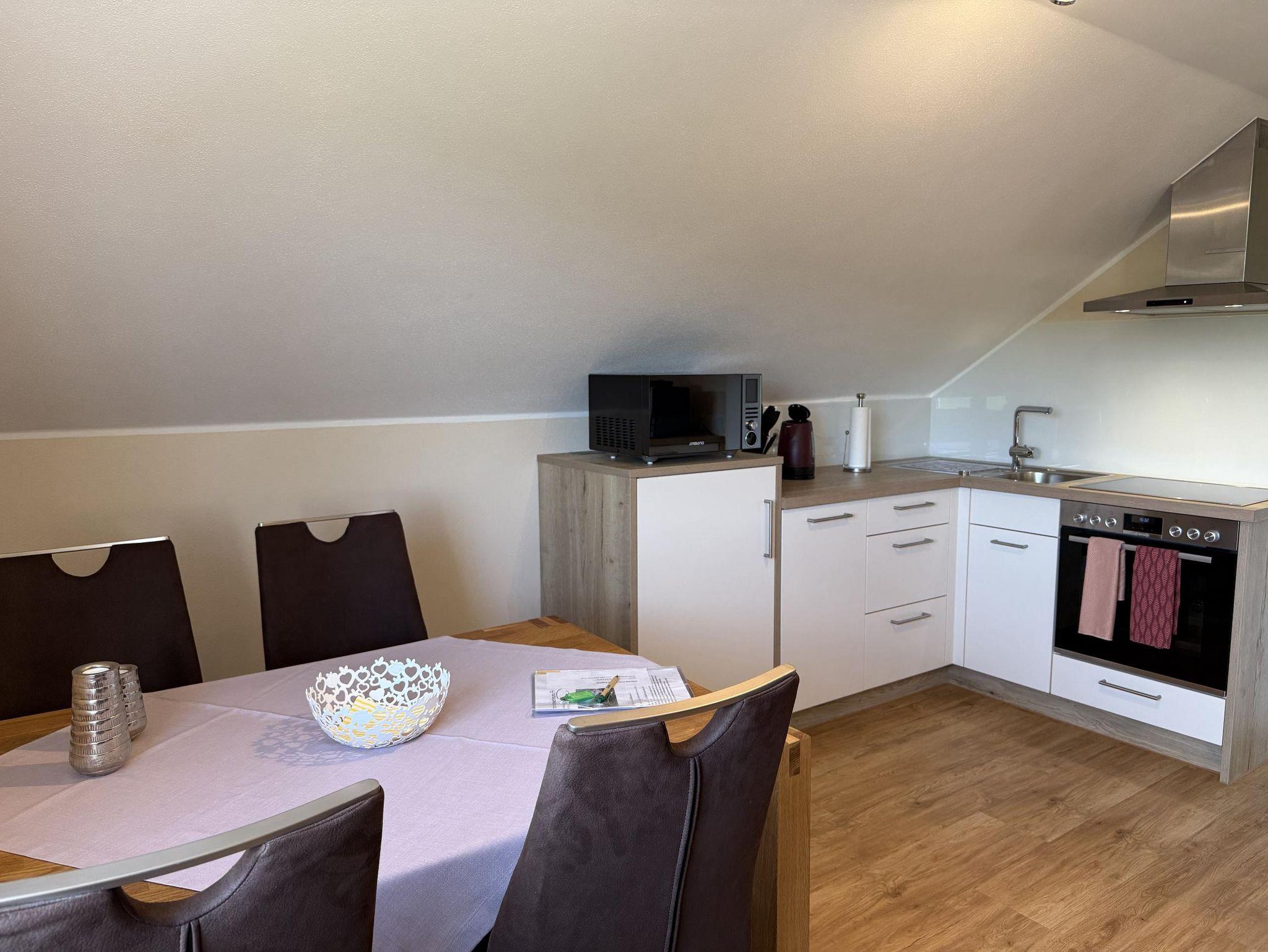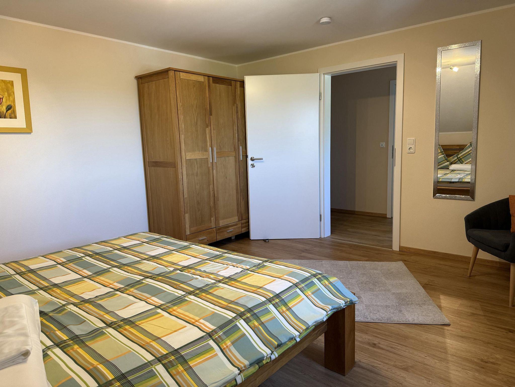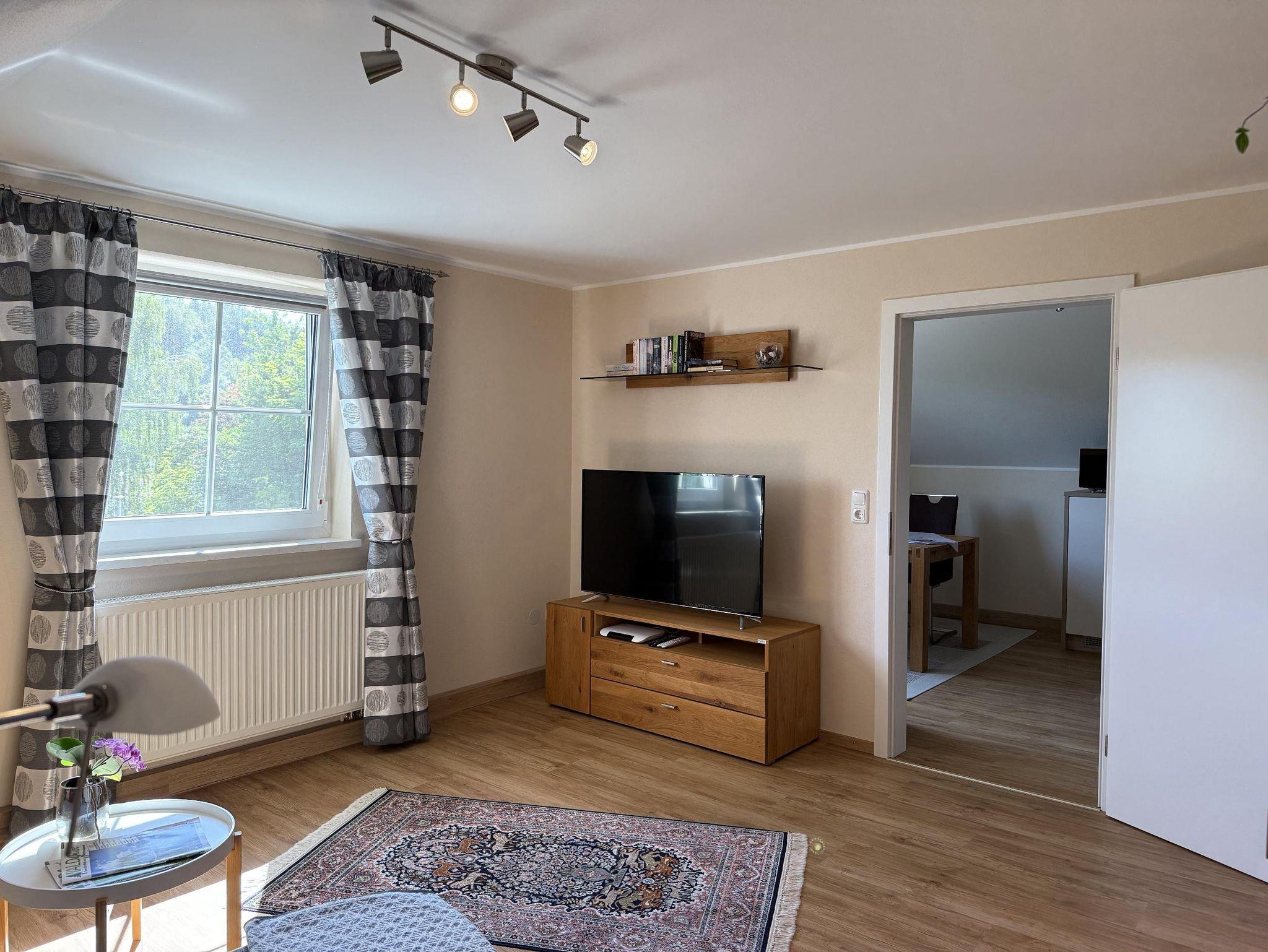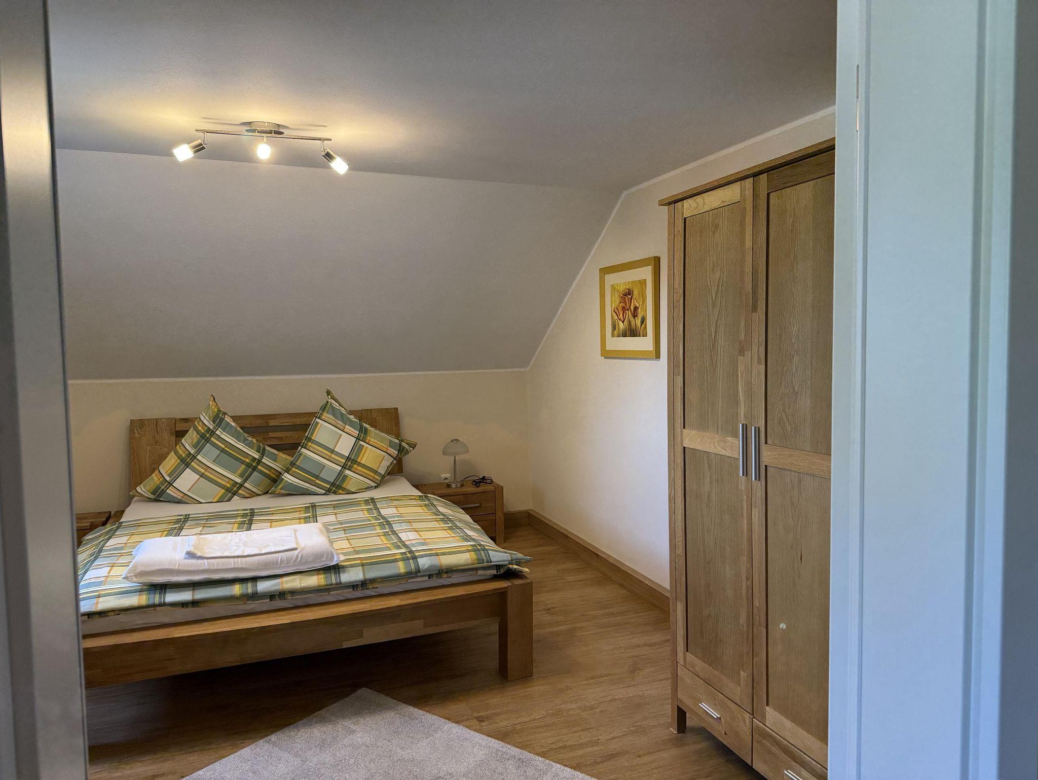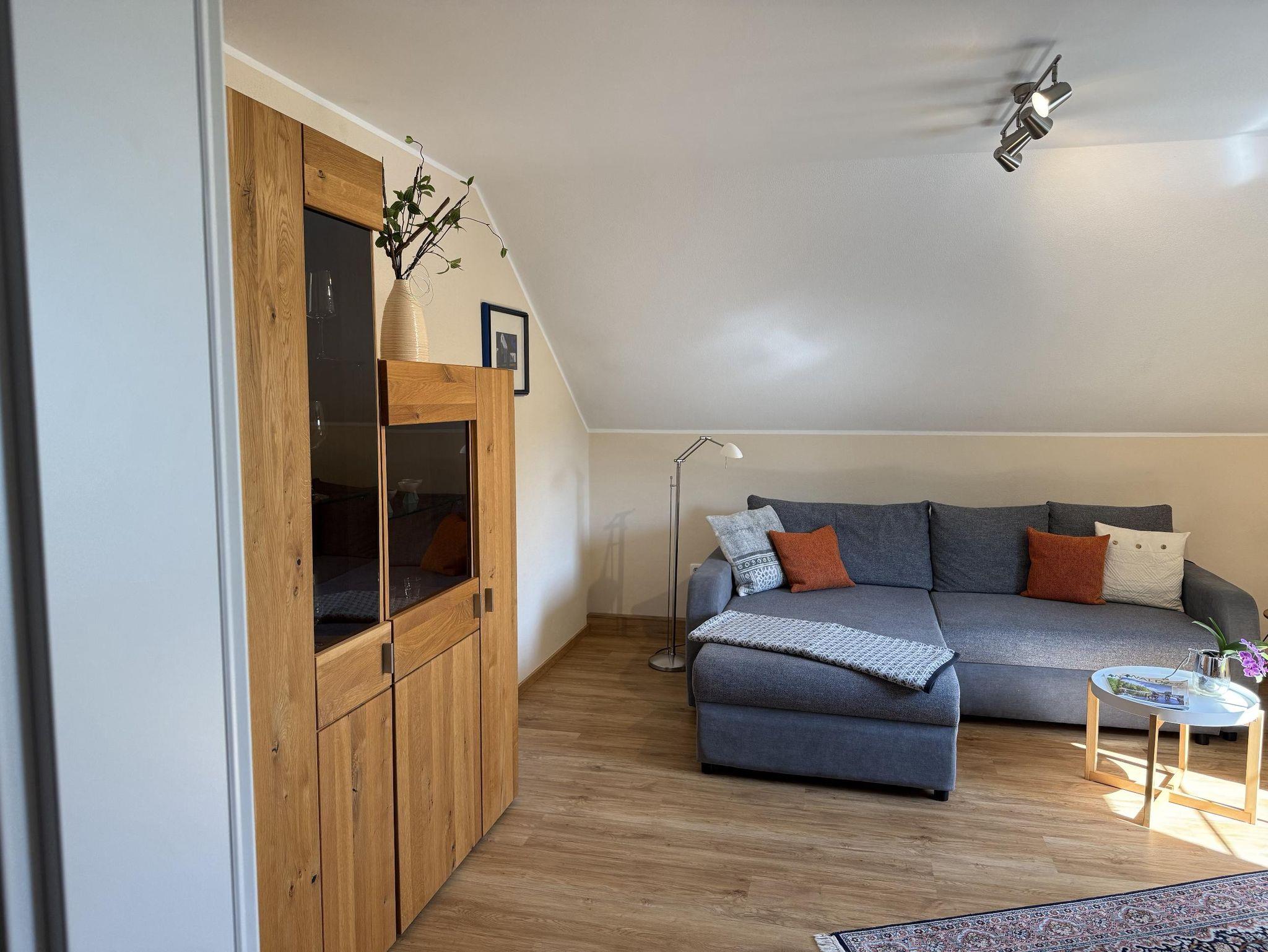 Unsere liebevoll eingerichtete Dachgeschoss-Ferienwohnung bietet auf 51 Quadratmetern den perfekten Rückzugsort für Paare, kleine Familien oder Freunde. Der charmante Mix aus Komfort und Funktionalität sorgt für entspannte Urlaubstage in heimeliger Atmosphäre. Die Wohnung verfügt über ein separates Schlafzimmer mit einem bequemen Doppelbett für erholsamen Schlaf. Im großzügigen Wohn-/Schlafraum lädt ein gemütliches Schlafsofa zum Entspannen ein – ideal als zusätzliche Schlafgelegenheit für die dritte Person. Die voll ausgestattete Küche lässt keine Wünsche offen: Kühlschrank, Gefrierfach, Spülmaschine sowie ein praktischer Essplatz stehen Ihnen zur Verfügung – perfekt für gemeinsame Mahlzeiten. Das moderne Badezimmer ist mit Dusche, WC, Waschbecken und einem Fön ausgestattet.