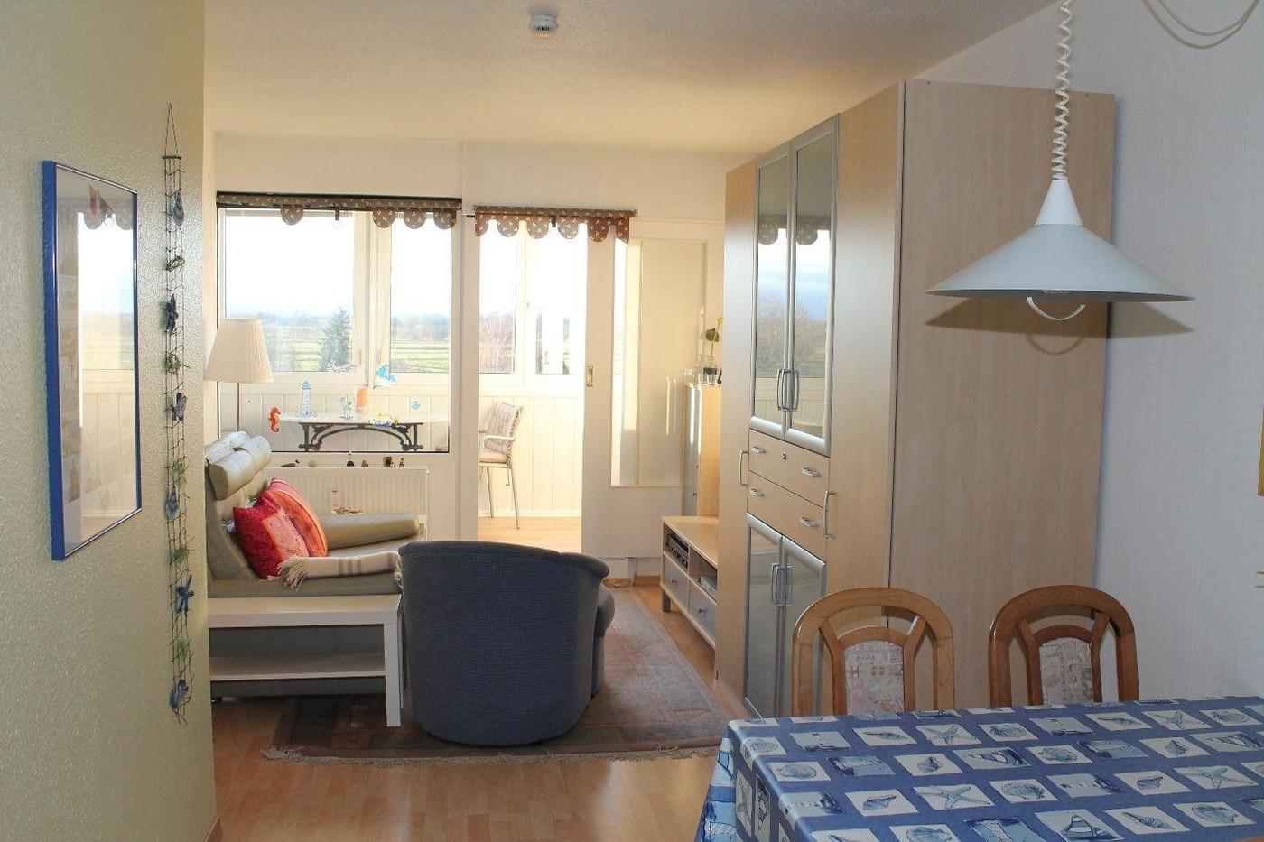Die Fewo (Westseite), ist 40 m² groß und befindet sich auf der 4. Etage im "Haus Flensburg". Sie ist für max. 4 Personen geeignet.