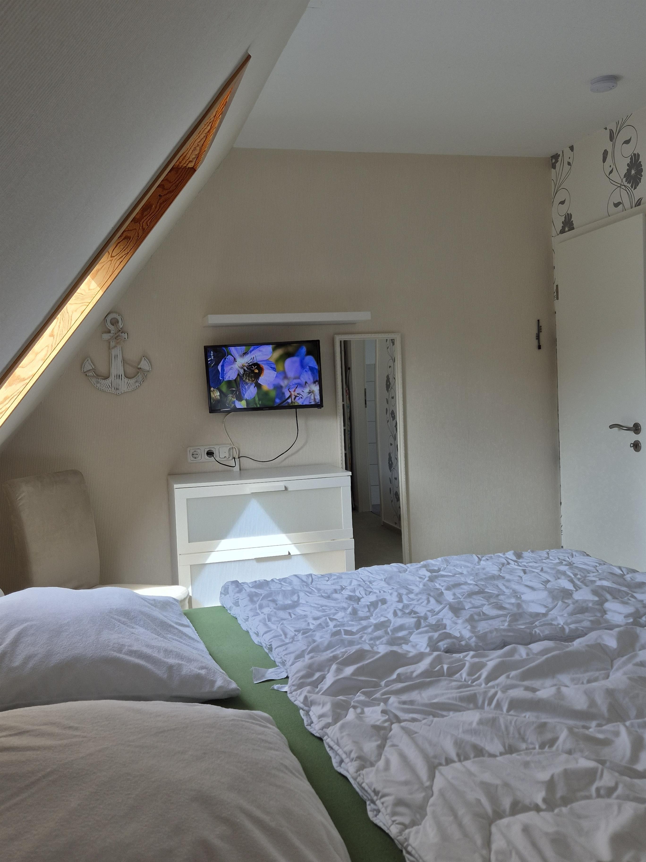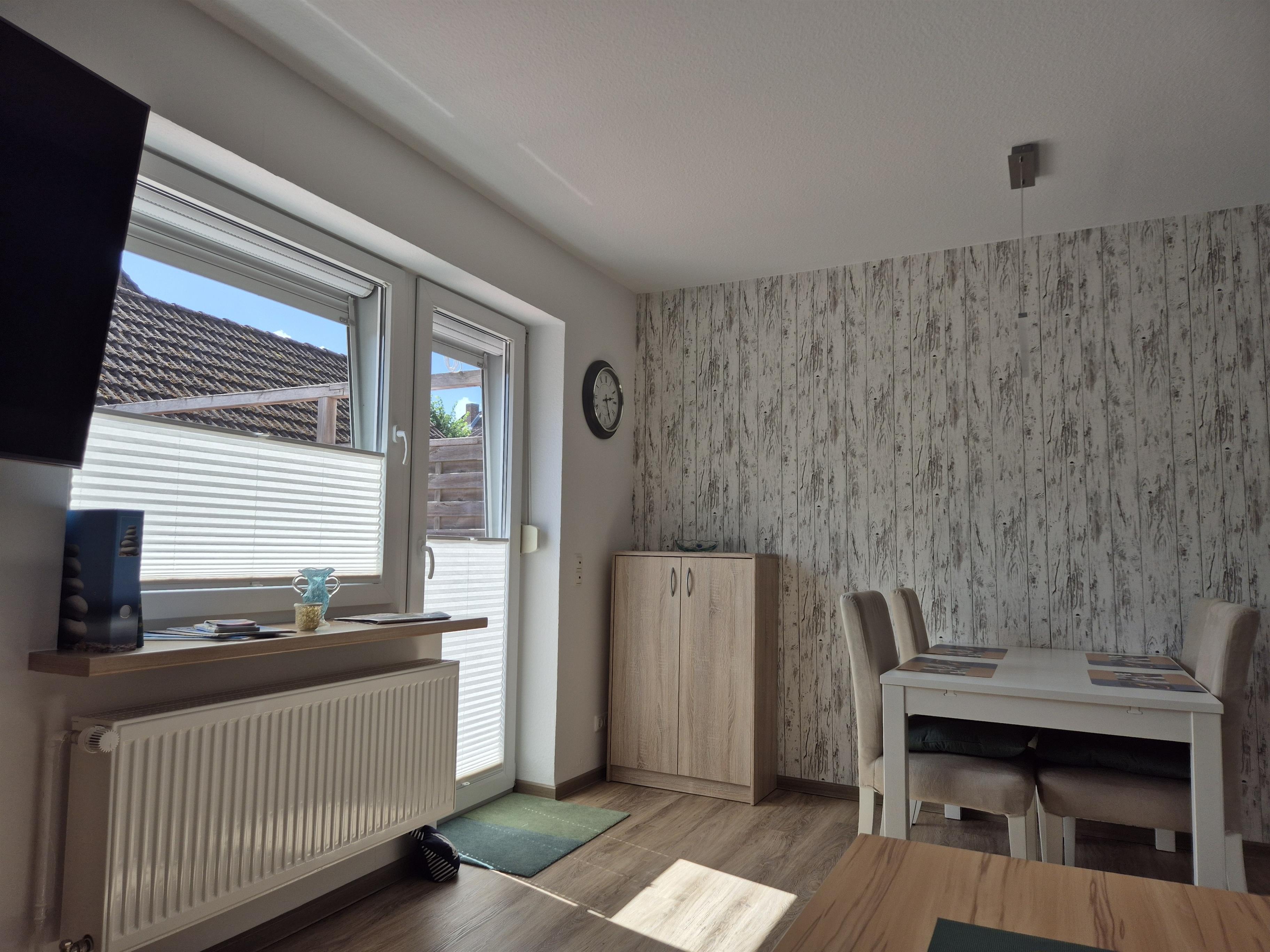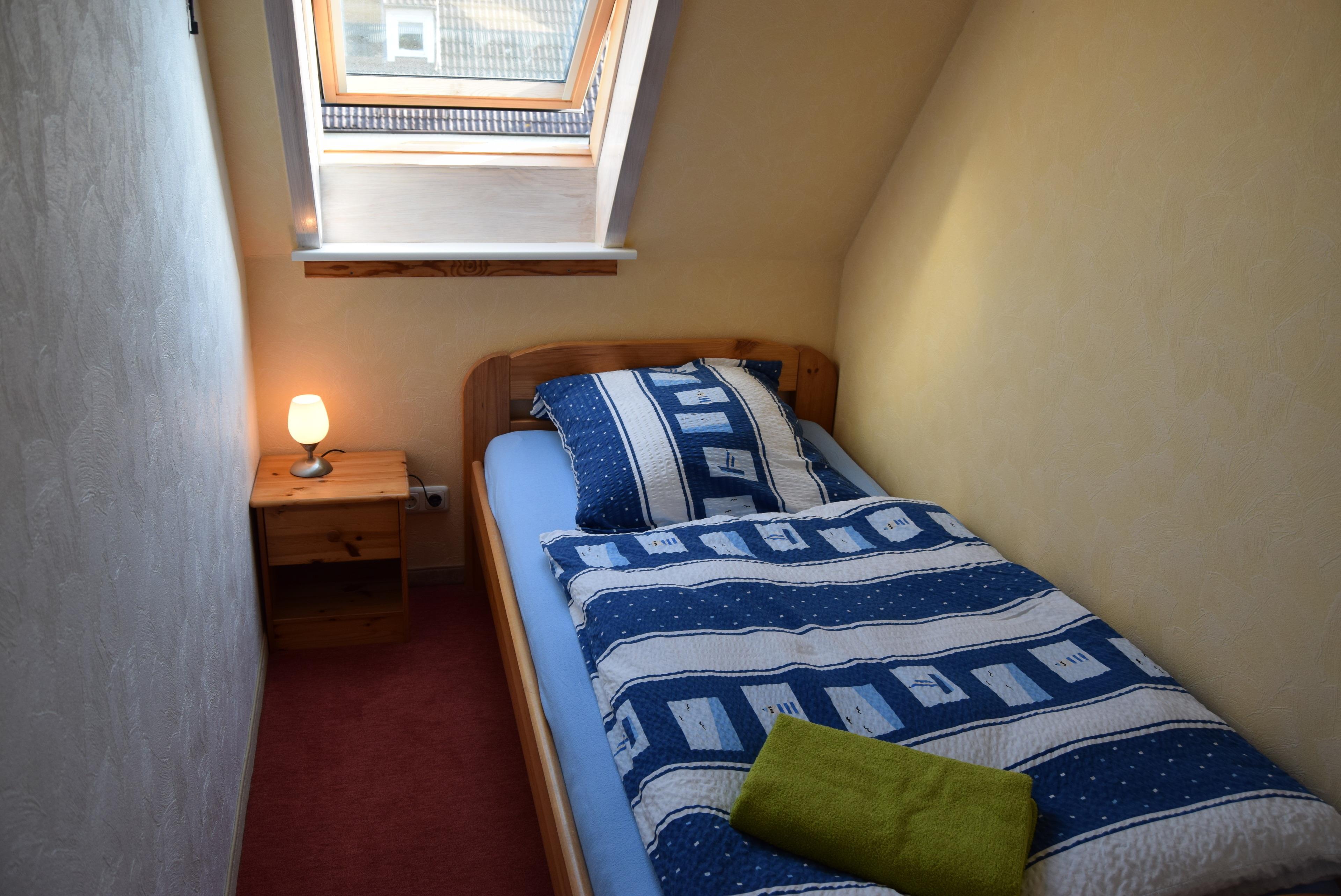 Im Erdgeschoss ist der Wohn-/ Essbereich mit einem Flachbild TV und dem Ausgang zur Terrasse. Eine gut ausgestattete separate Küche, sowie ein Duschbad mit WC. Im Obergeschoss befinden sich ein Wannenbad mit WC und zwei Schlafräume. Der große Schlafraum hat ein Doppelbett(180x200cm) und einen Flachbild TV, der kleine Schlafraum ein Einzelbett (100x200cm).