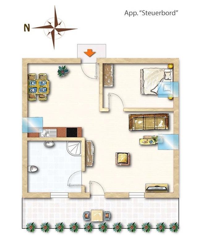 Backbord/Steuerbord , schön für Eltern und Kids! Die Apartments sind großzügig geschnitten – und hell und freundlich eingerichtet. Der Wohnbereich mit Sofa und Flachbild-TV bietet viel Raum für gemütliche Fernsehabende. Die angrenzende Küchenzeile mit einem Esstisch für bis zu 4 Personen ist bestens geeignet für Lunch und Dinner in gemeinsamer Runde. Im Eltern-Schlafzimmer findet ihr ein Doppelbett. Die Schlafcouch im Wohnzimmer kann für zwei weitere Personen aufgebettet werden. Auf dem Balkon gönnt ihr euch eine Portion Ostseebrise und schaut auf unseren Garten. Die Apartments befinden sich auf der 2. Etage des Gebäudes "Heimathafen"