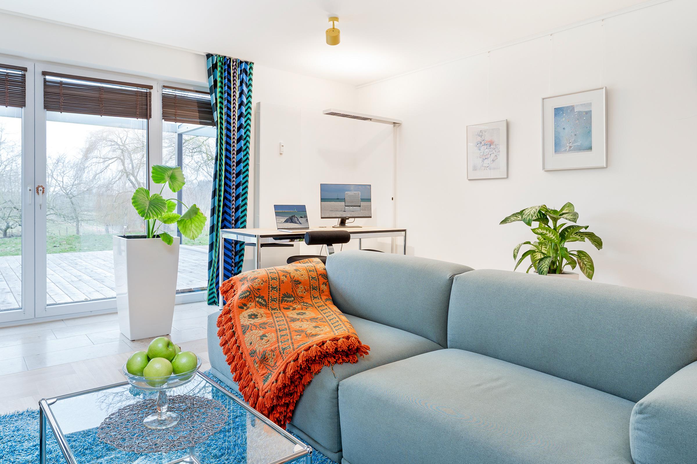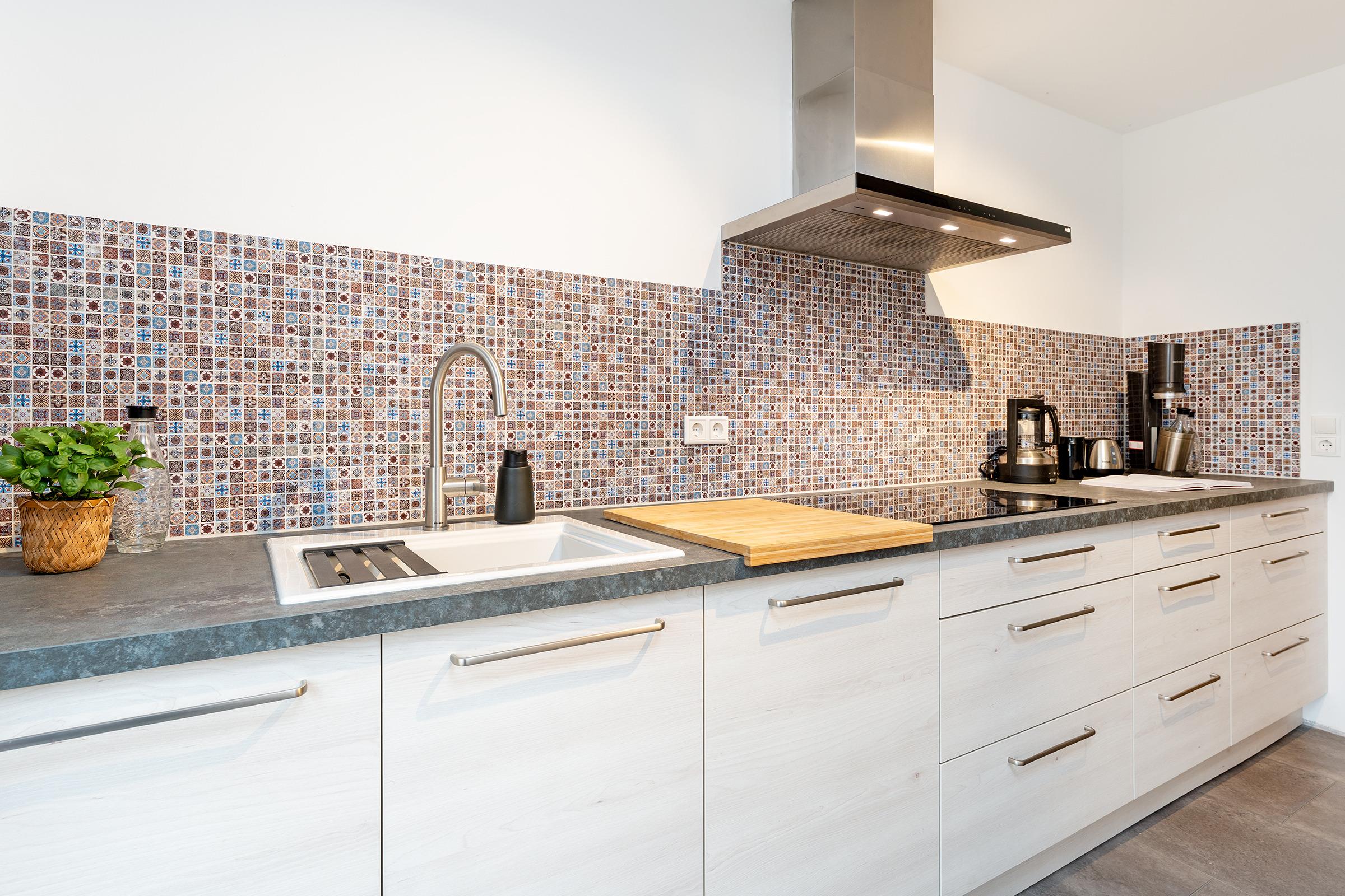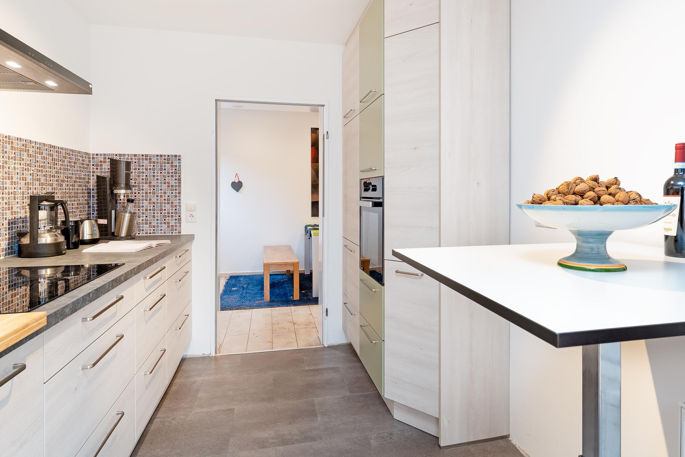 Der helle Wohnbereich empfängt Sie mit einem gemütlichen Elektrokamin sowie einer Musikbox und einem Plattenspieler zur Erholung bei – ideal für ruhige Abende nach einem erlebnisreichen Tag an der Ostsee. Zusätzlich befindet sich im Wohnzimmer ein Bildschirmarbeitsplatz. Von hier aus gelangen Sie auf die schöne, teilüberdachte Nord-Terrasse, die mit Sonnenliegen, Gartenmöbeln, Kohlegrill und einem eigenen Strandkorb am Objekt zum Entspannen einlädt. Anschließend führt der Rundgang in die voll ausgestattete Küche mit Backofen, Ceranherd, Geschirrspüler, Wasserkocher, Toaster, Kaffeemaschine sowie zusätzlicher Kapselmaschine. Der Essbereich bietet großzügig Platz für gemeinsame Mahlzeiten.
