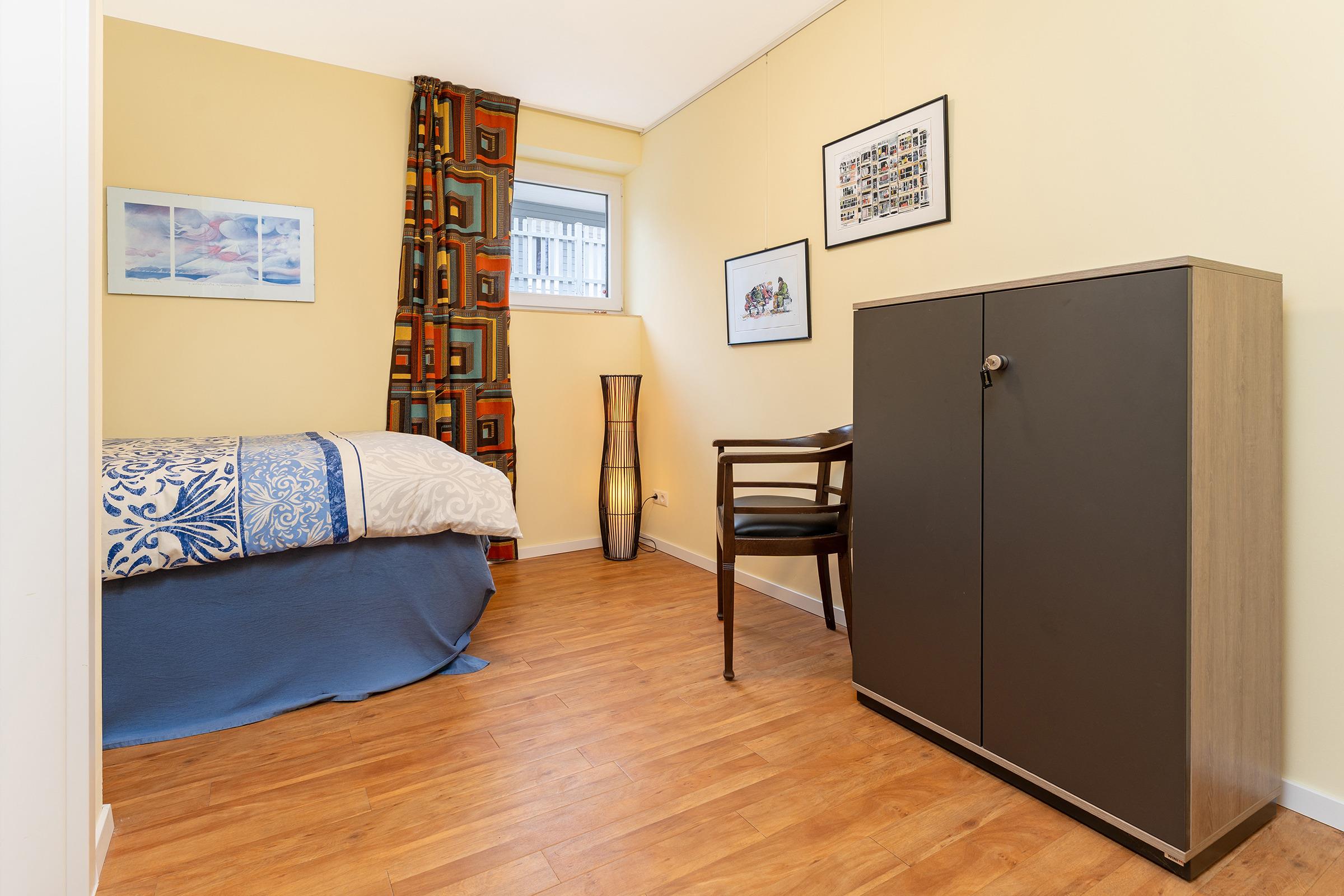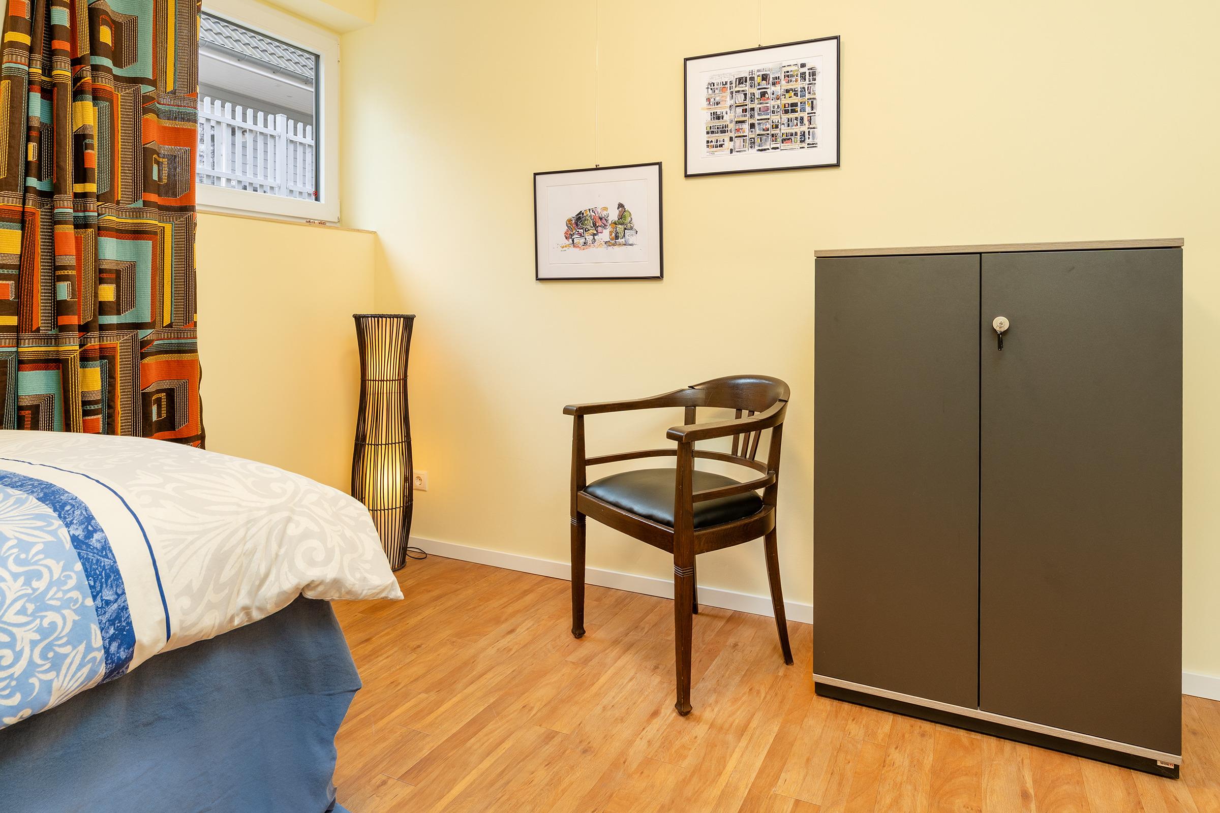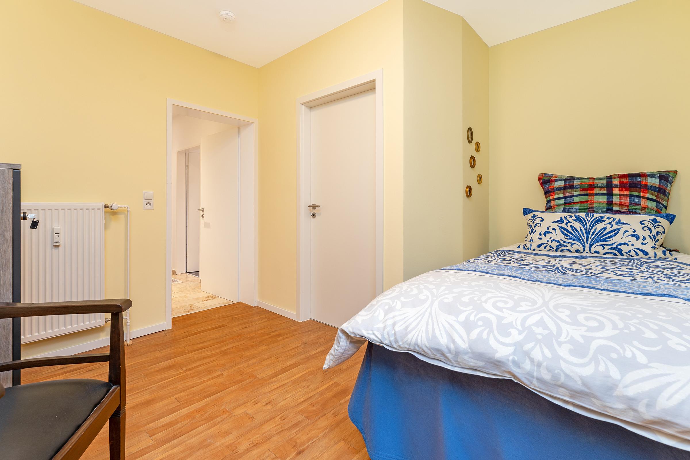 Schlafzimmer 2: 1 Boxspringdoppelbett (2x 70x200 cm, durchgehender Topper), Kleiderschrank, Verdunkelung: Rollo und Vorhang, Platz für ein Babybett vorhanden