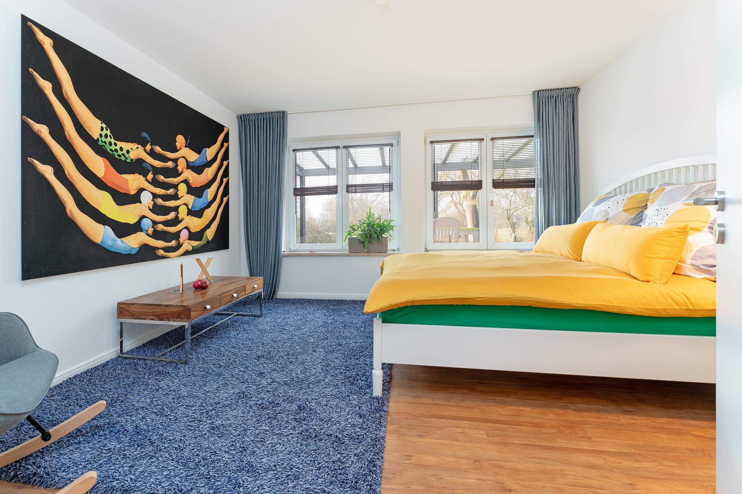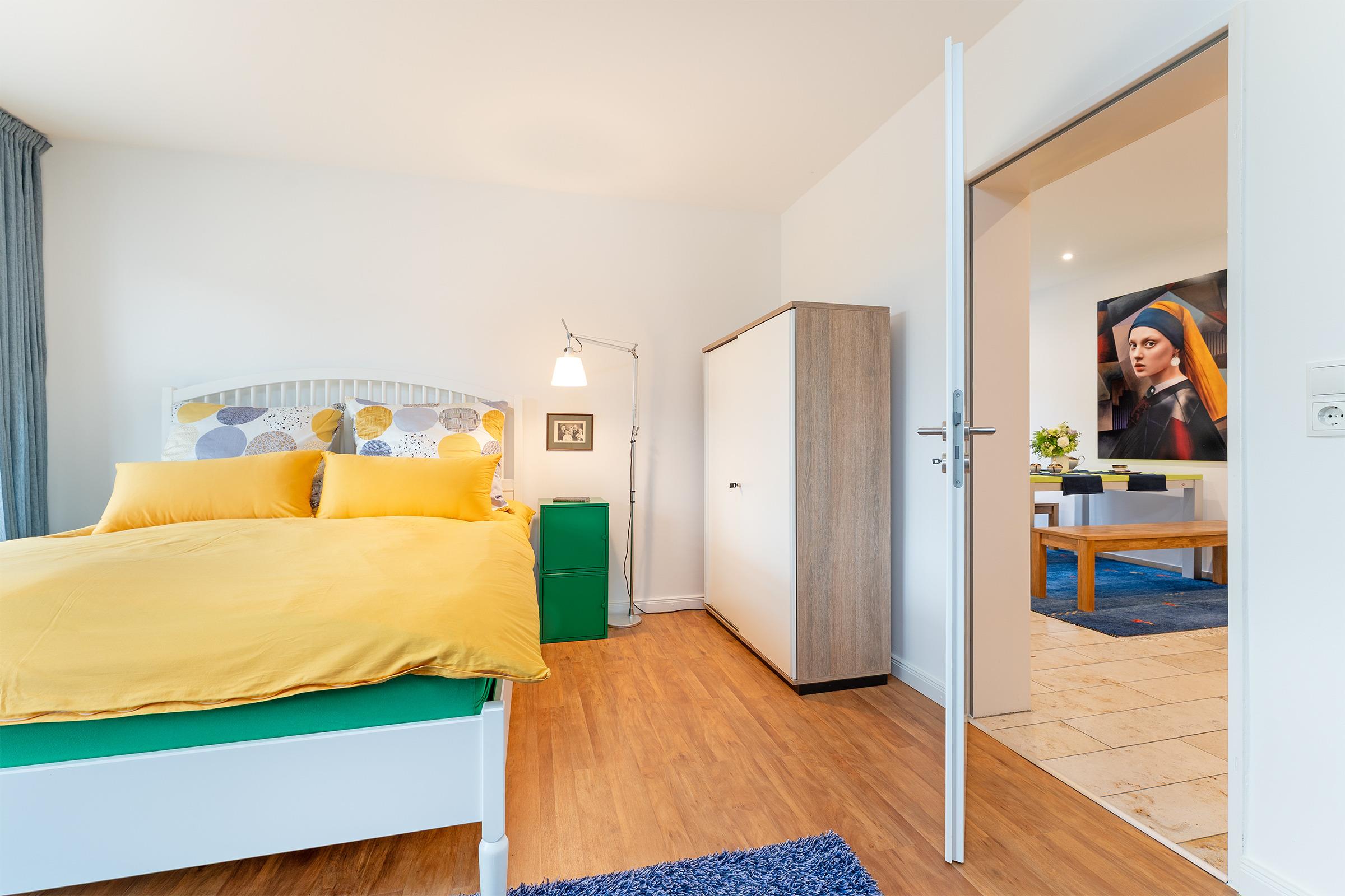 Schlafzimmer 1: 1 Boxspringdoppelbett (2x 80x200 cm, durchgehender Topper), Kleiderschrank, Verdunkelung: Rollo und Vorhang, Platz für ein Babybett vorhanden