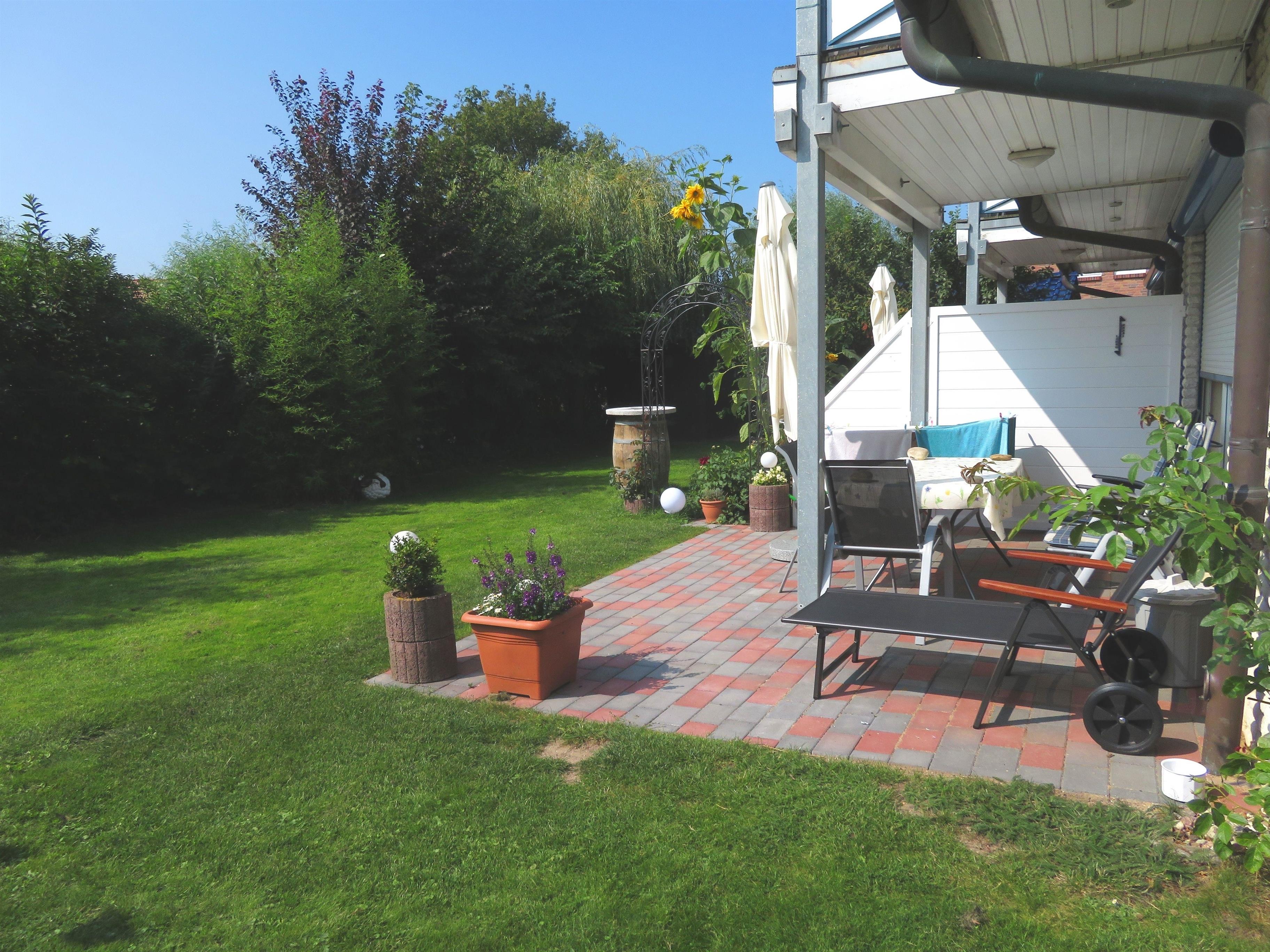 Auf der Terrasse stehen Gartenmöbel und Liegen für Sie bereit.