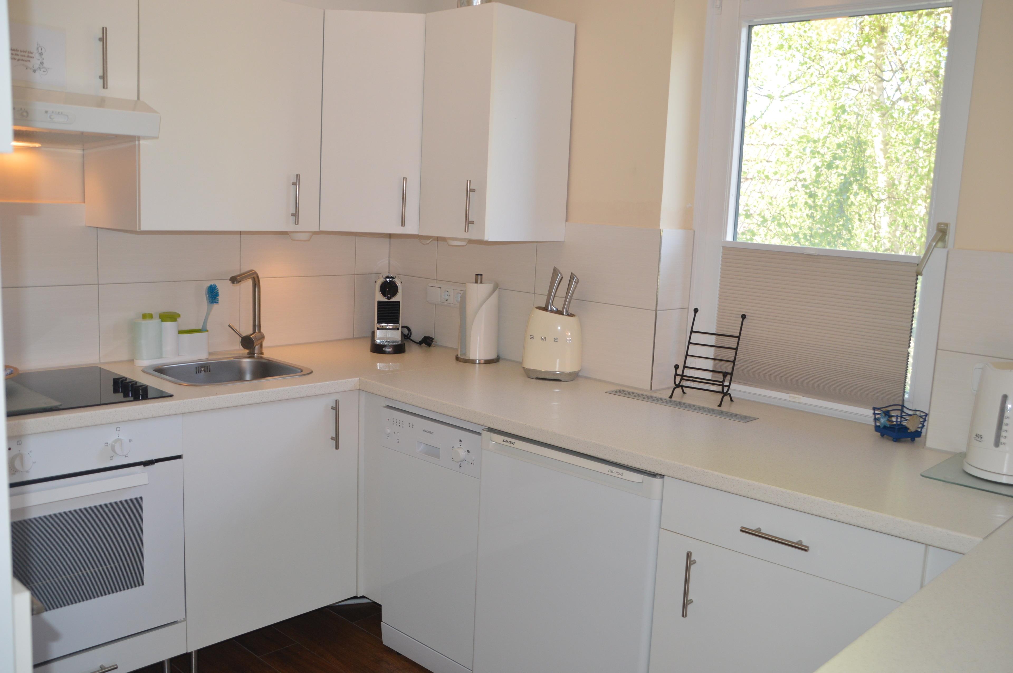 Der optimal geschnittene Wohnraum mit Essbereich bietet einen direkten Zugang zum Balkon. Die offene Küche ist mit Backofen, Cerankochfeld, Mikrowelle, Geschirrspüler sowie einem Kühlschrank mit Gefrierfach ausgestattet. Ausreichend Geschirr sowie diverse Küchenutensilien wie z.B. Mixer, Toaster, Wasser- und Eierkocher, Kaffeemaschine und Kaffeekapselautomat sind ebenfalls vorhanden.