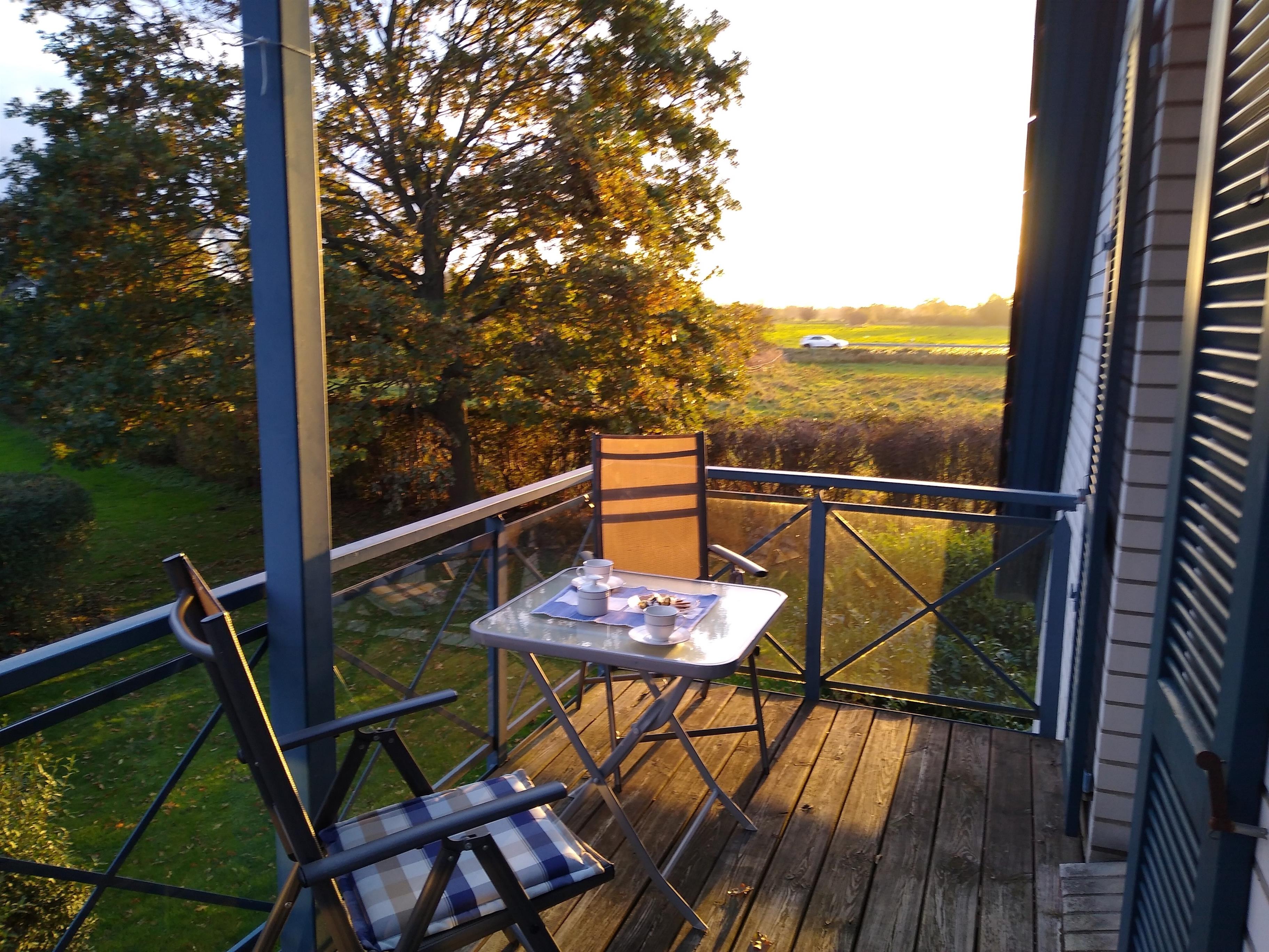 Der große nach Südosten ausgerichteten Balkon lädt dazu ein in der Morgensonne zu frühstücken. Genießen Sie den Blick über die Felder und entspannen Sie am Nachmittag in den letzten Sonnenstrahlen nach einer schönen Radtour oder einem Badetag.