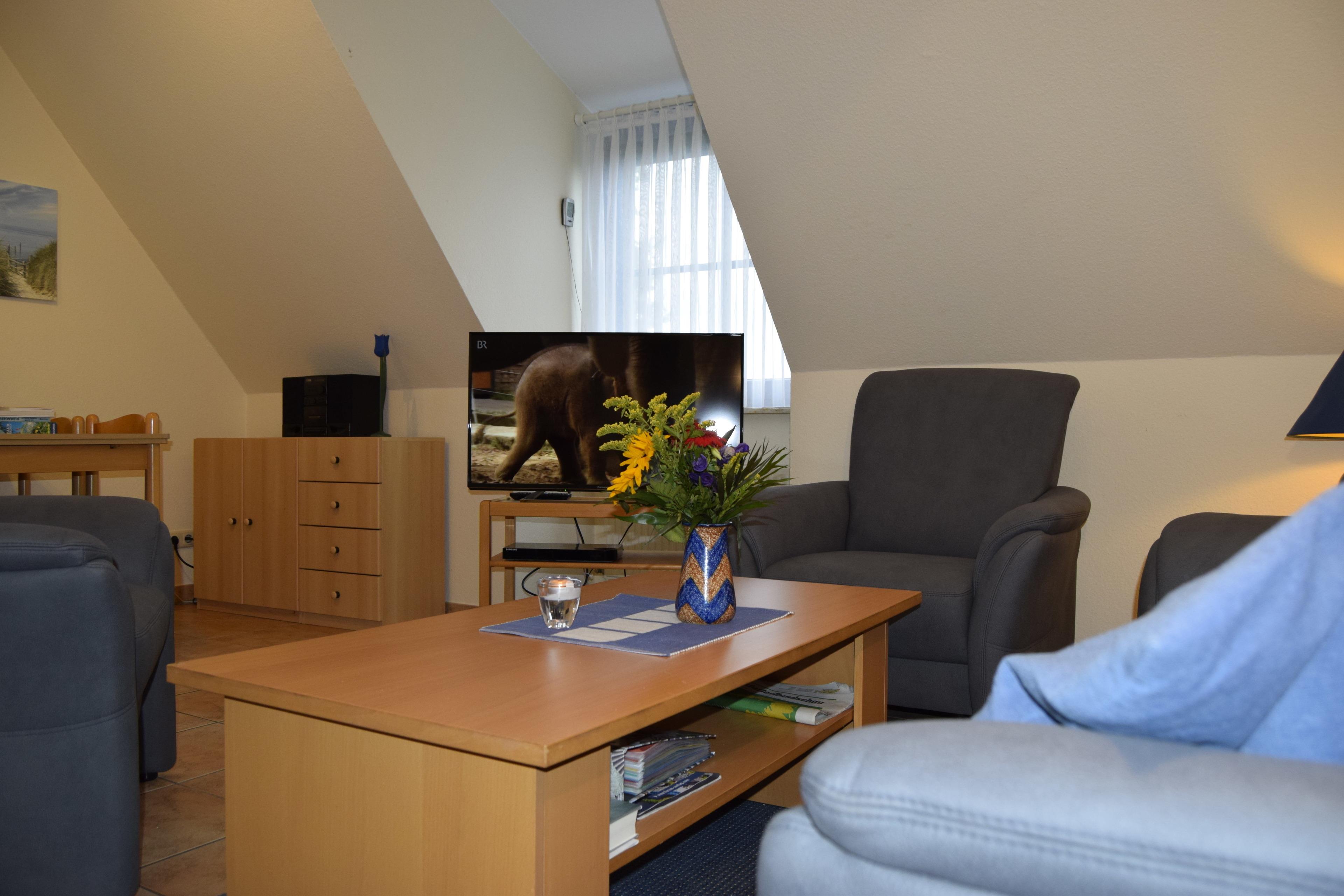 Im offen gestalteten Wohnraum finden Sie ein gemütliches Sofa, zwei Sessel sowie einen Flachbildfernseher vor. Der Essbereich lädt zu gemeinsamen Spiele- und Kochabenden ein.