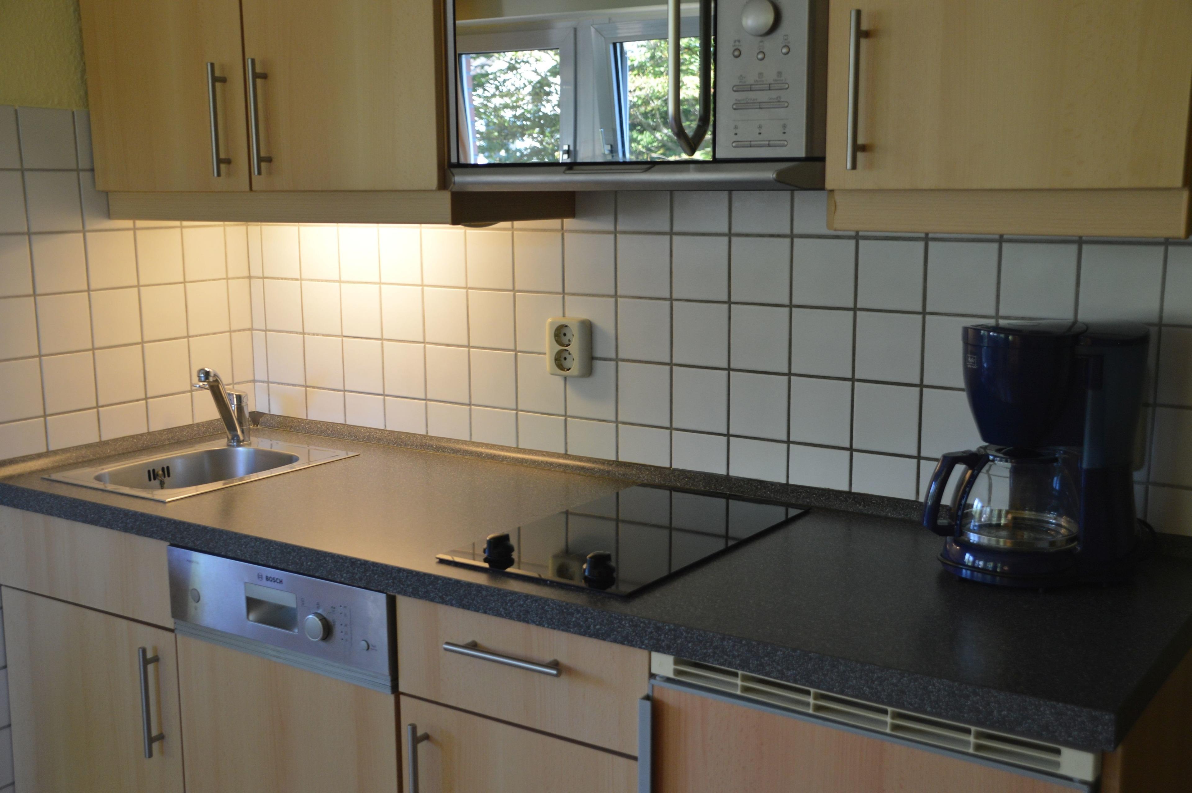 Das Wohnzimmer besticht in seiner Freundlichkeit durch seine Fensterfronten und bietet aufgrund der gemütlichen Couch und der Sitzgruppe beste Voraussetzungen zum Entspannen und ein behagliches Ambiente für einen Spieleabend. Die Kochnische ist ausgestattet mit einem 2-Platten-Herd nebst Dunstabzugshaube, einer Mikrowelle (mit Backfunktion) und einem Geschirrspüler. Das kleine Schlafzimmer verfügt über ein Doppelbett (160 x 200 ) und das innen liegende, helle Badezimmer über eine Dusche sowie WC.
