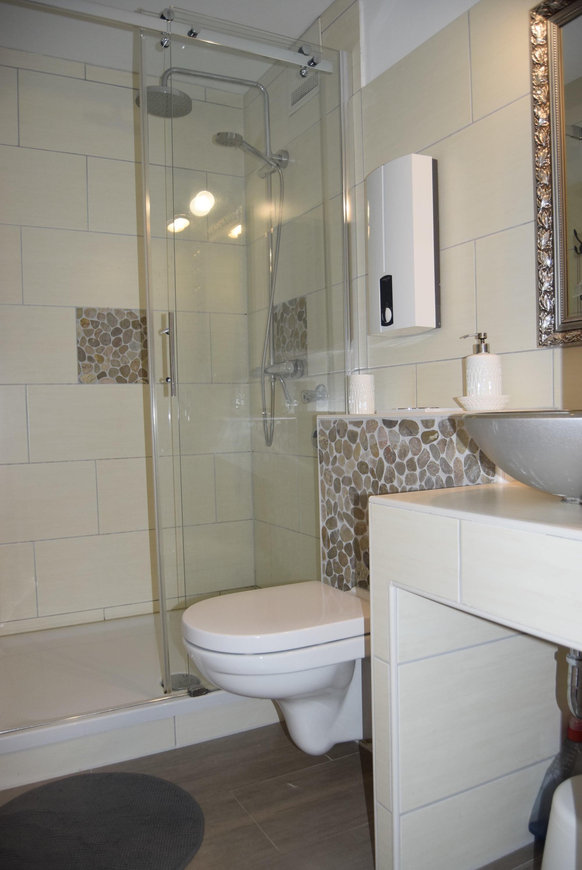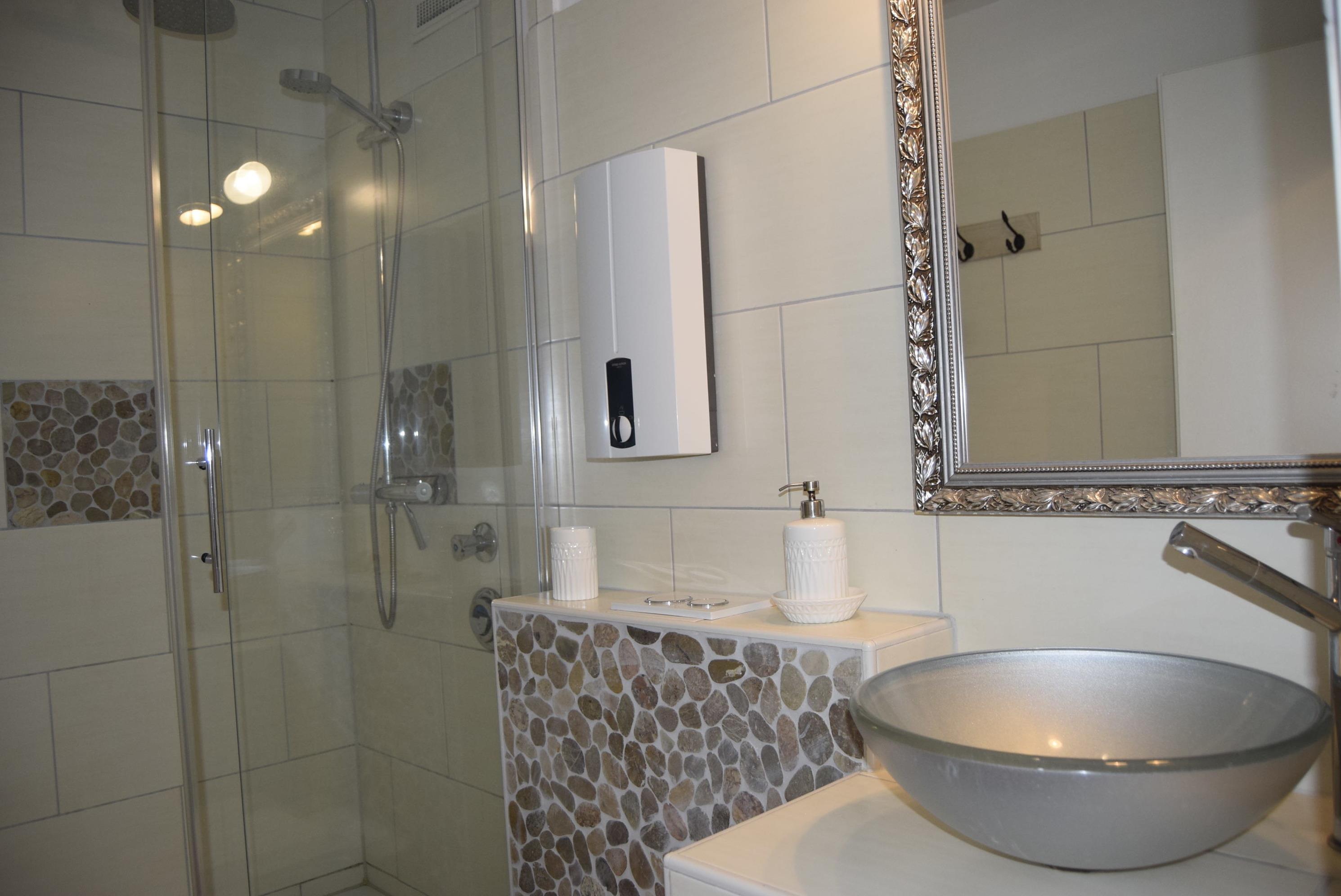 Im Duschbad erwartet Sie ein Duschbereich von 120 x 90 cm die mit einer Regendusche ausgestattet wurde. Das Waschbecken steht frei und besticht durch das zeitlose Design.