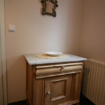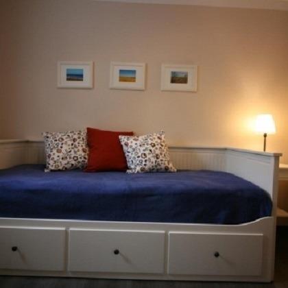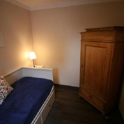 Im Kinderzimmer stehen antike Kieferschränke und ein Hemnes-Bett. Das Bett ist ausziehbar und bietet auf einer Liegefläche von 2 x 80 cm x 200 cm ausreichend Platz für 2 Personen. Im Schlafzimmer erwartet Sie neben einem Doppelbett mit einer Liegefläche von 160 x 200 cm ein großer Kleiderschrank im zeitlosen Design.