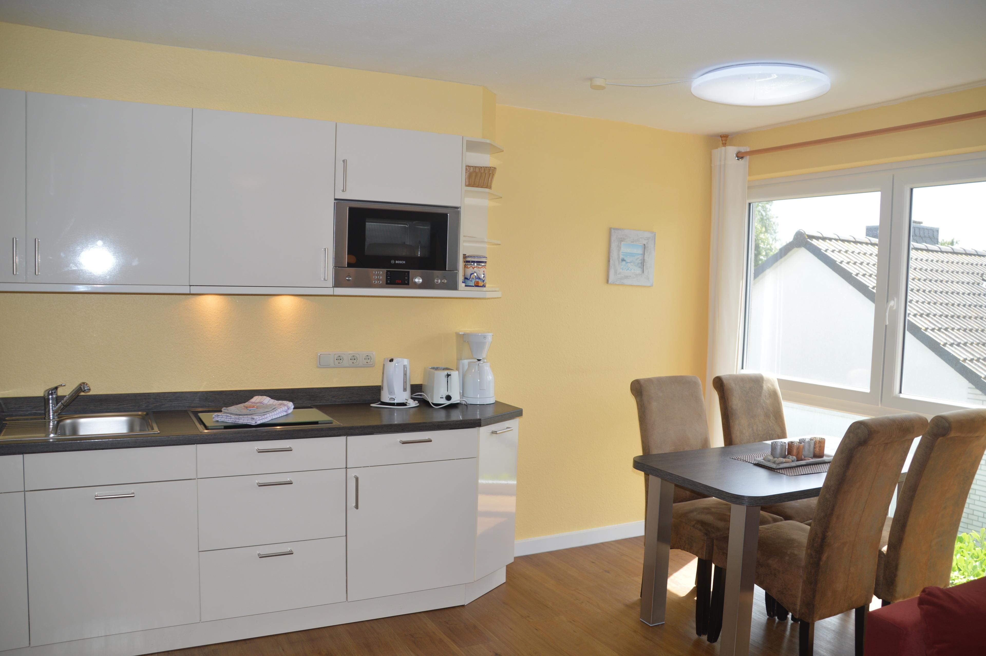 Die Küchenzeile ist natürlich komplett ausgestattet mit 4-Plattenherd, Mini-Backofen, Mikrowelle, Kühlschrank und natürlich Kaffeemaschine, Toaster und Wasserkoche, ausreichend Geschirr, Besteck, Pfannen, Töpfen.