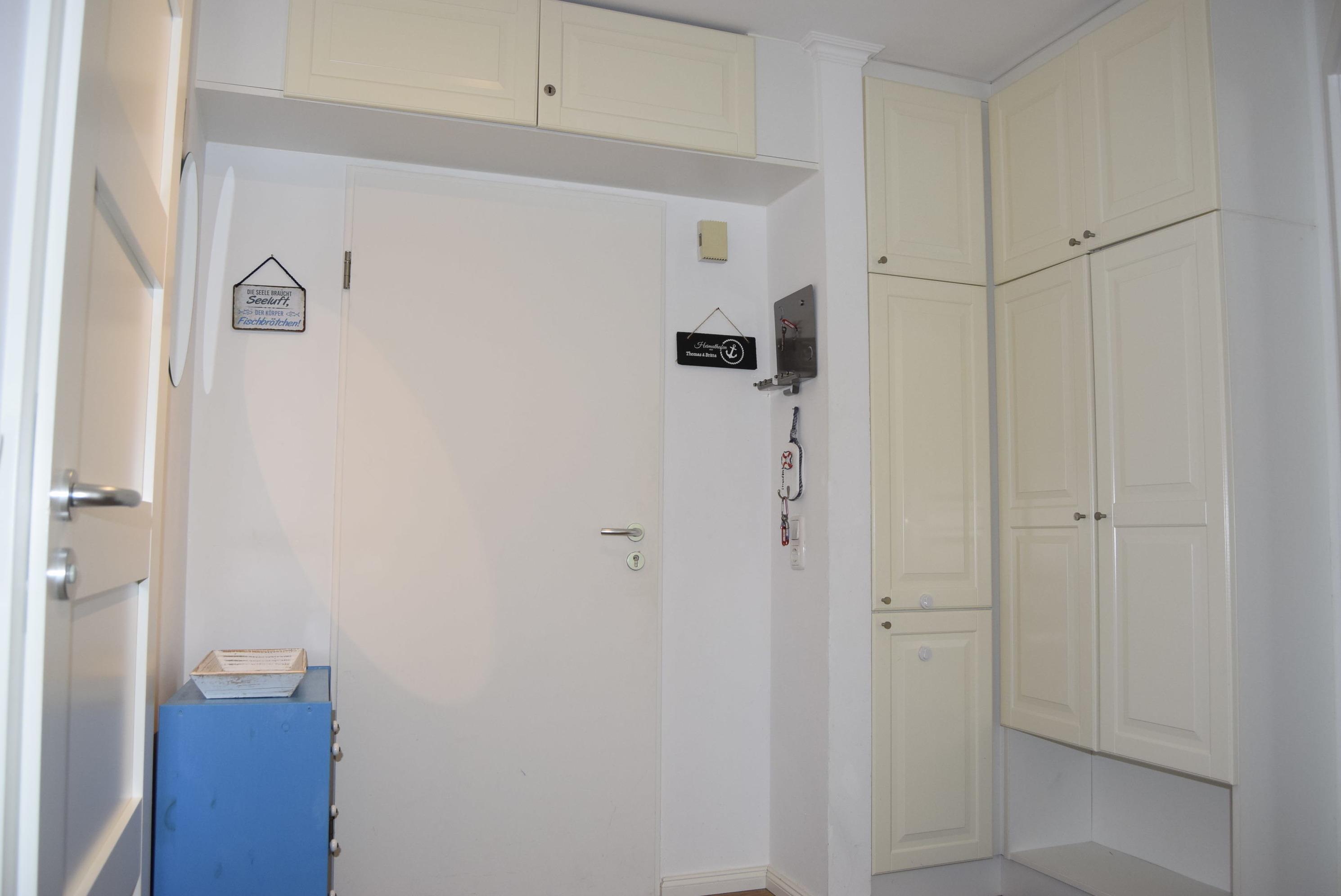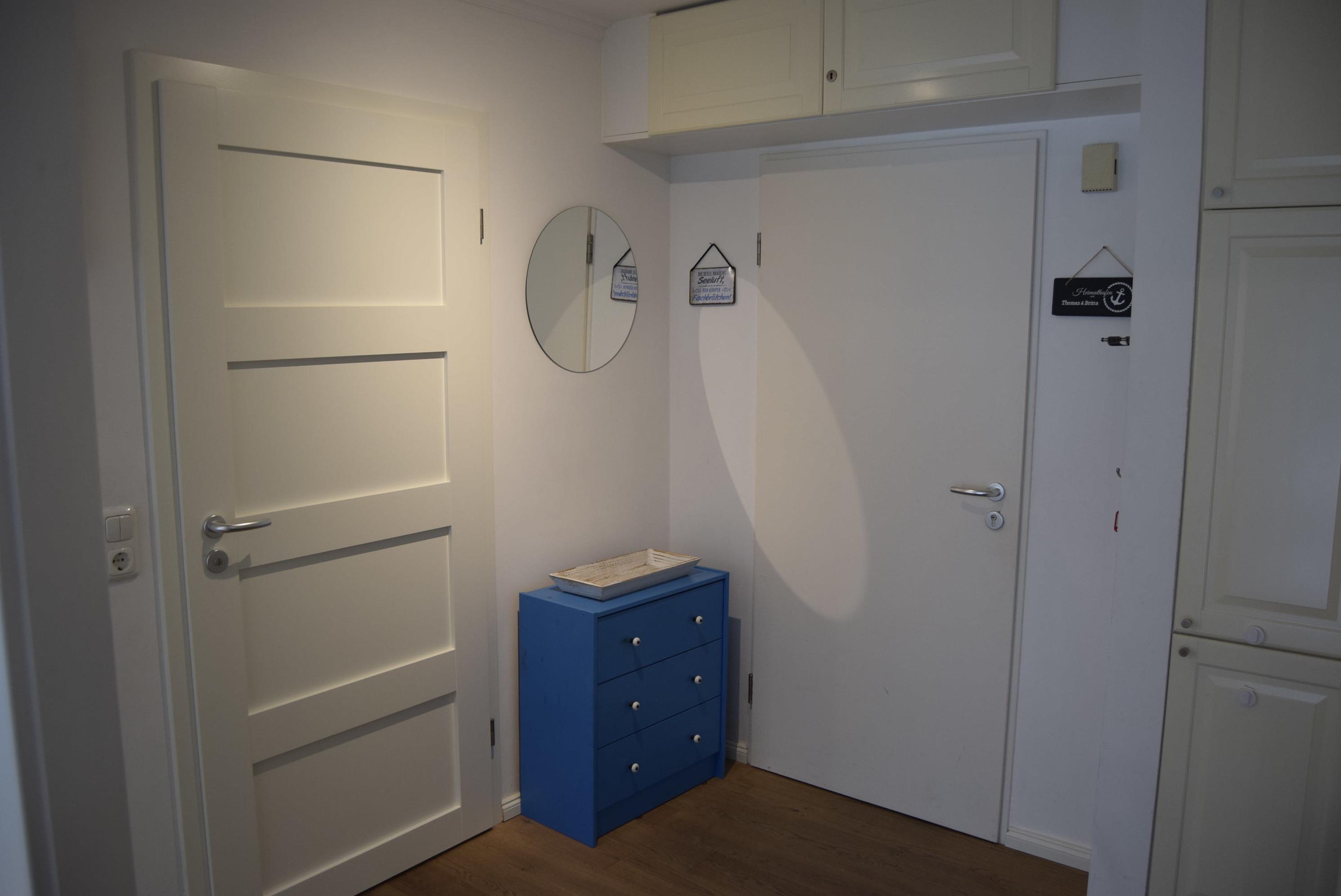Das Badezimmer verfügt über eine Dusche und einen Haartrockner. Zur Wohnung gehört ein eigener kostenloser PKW-Parkplatz, direkt vor dem Wohnhaus. In der Sommersaison gehört ein kostenloser Strandkorb am Strand zur Ferienwohnung dazu. Beide Räume können im Sommer über einen elektrischen Außenrollladen komplett verdunkelt werden.