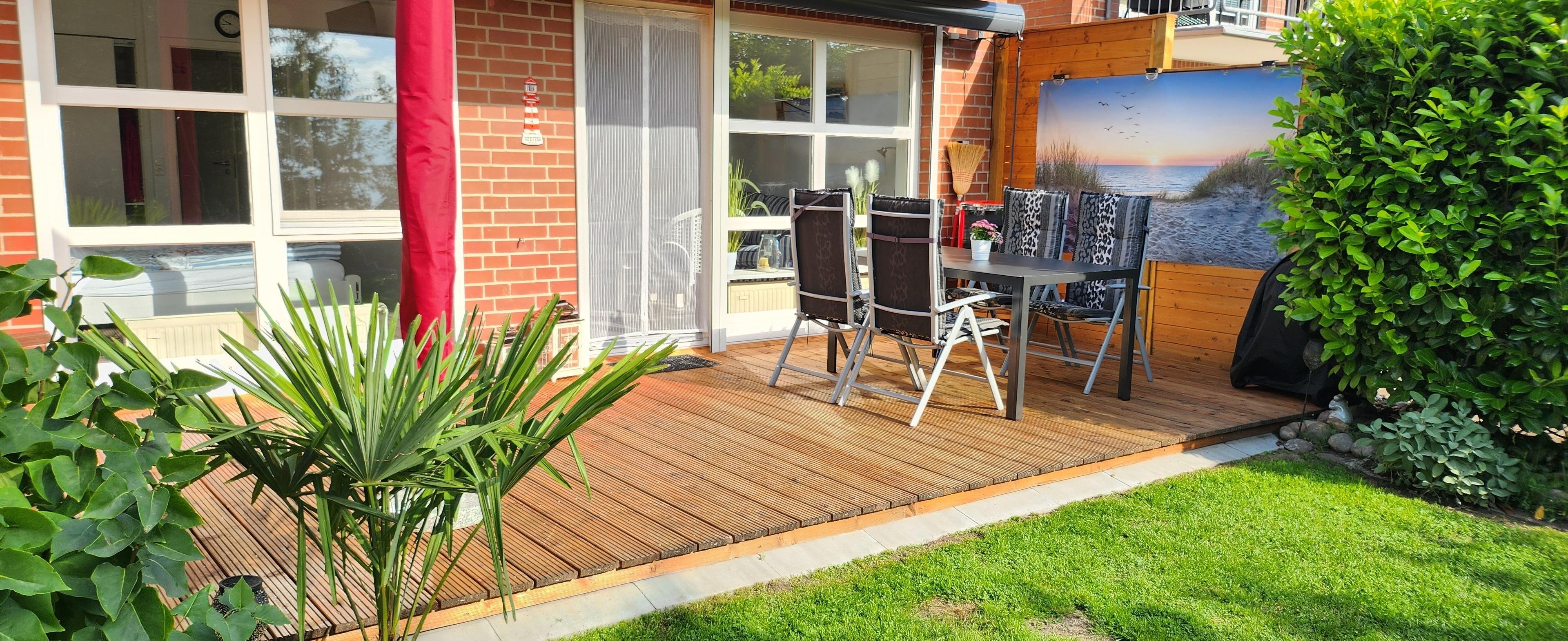 Genießen Sie Ihren Urlaub in vollen Zügen, bei schönem Wetter auch draußen auf der Terrasse. Gartenmöbel stehen dort bereit.