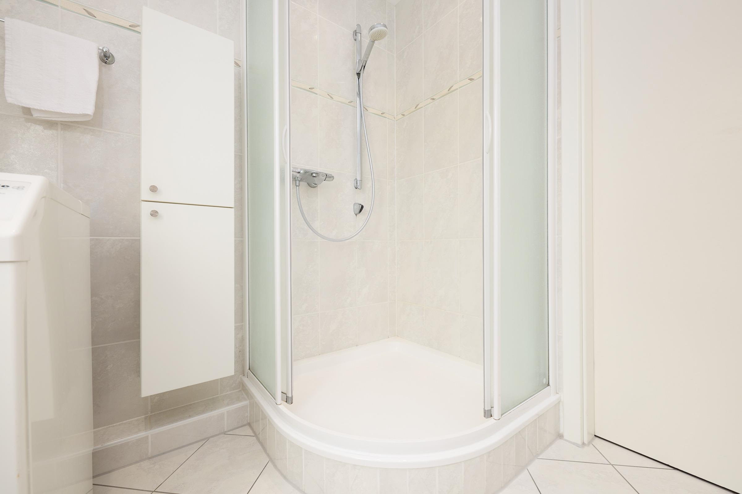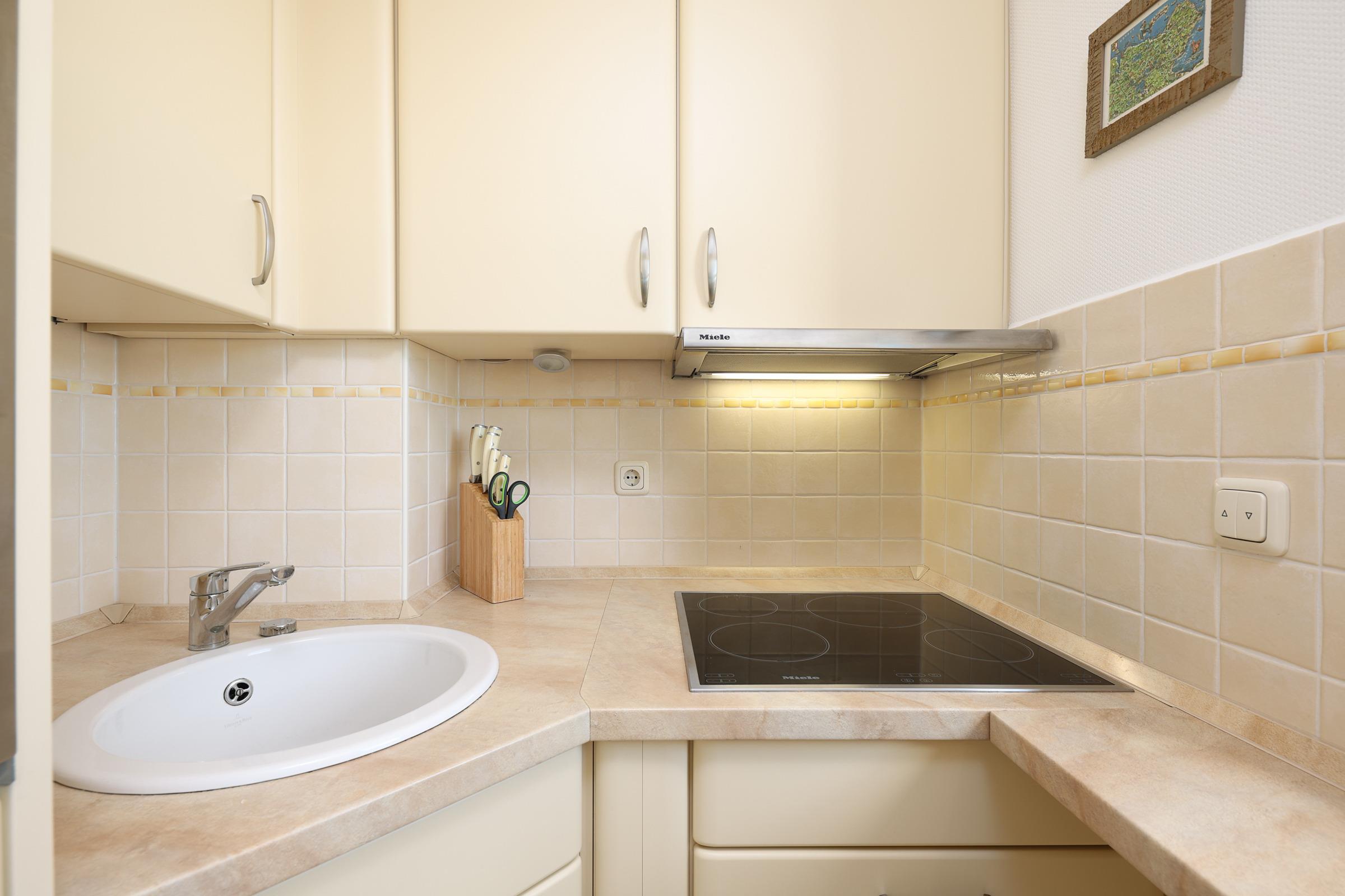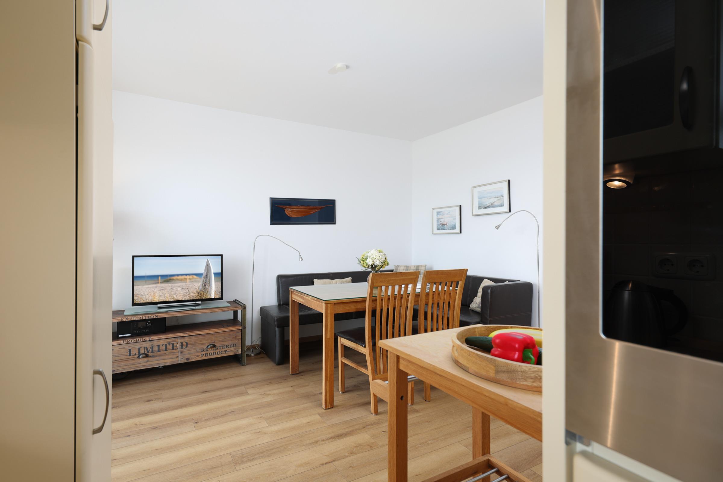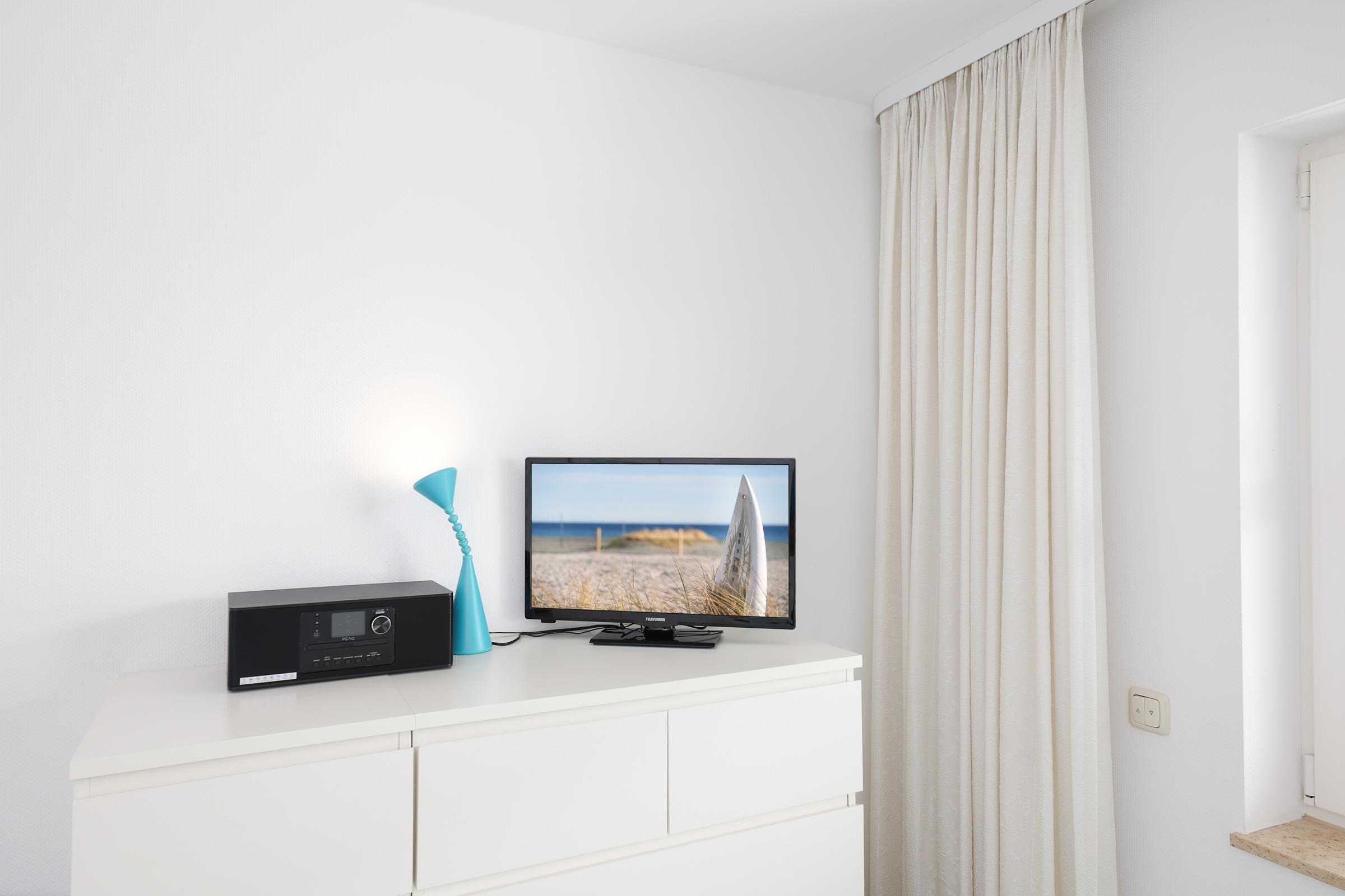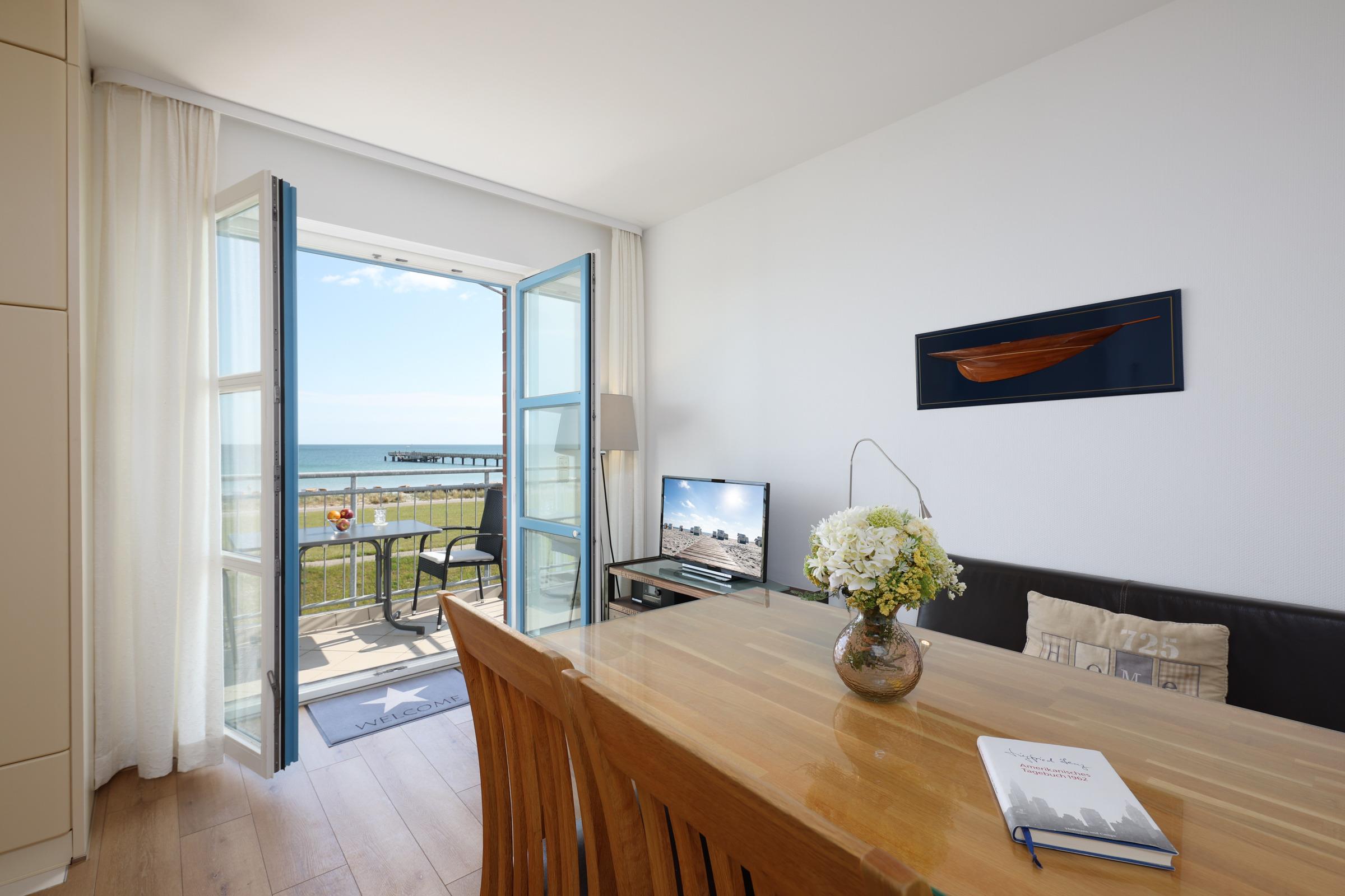 Vom großen Wohnzimmer-Balkon, können Sie nicht nur den Blick bis zum Horizont schweifen lassen, sondern auch das bunte Treiben auf der Promenade beobachten. Ein zweiter, überdachter Balkon befindet sich am Schlafzimmer auf dem Sie gleich nach dem Aufstehen kräftig durchatmen können. Ein modern eingerichtetes Wohnzimmer und eine sehr gut ausgestattete offene Küche mit hochwertigen Einbaugeräten macht das Kochen und Speisen zu einem Vergnügen. Zwei helle, freundliche Schlafzimmer stehen Ihnen zur Verfügung. Eines ist mit einem Doppelbett, das Andere mit zwei Einzelbetten ausgestattet. In allen Räumen befinden sich Flatscreen-Fernseher sowie eine kompakte Musikanlage kompakte Musikanlage mit DAB, Bluetooth und CD. Durch eine in allen Zimmern regulierbare Fußbodenheizung haben Sie stets warme Füße und elektrische Rollläden sorgen für optimale Abdunkelung in der Nacht.