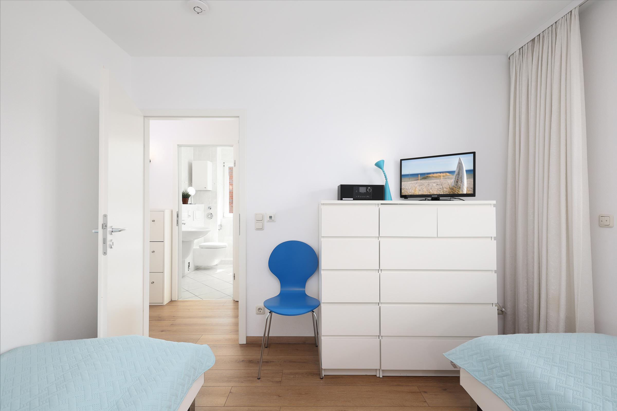 Schlafzimmer 2: 2 Einzelbetten (90x200 cm), Kommode, TV, Verdunkelung: elektrische Rollläden