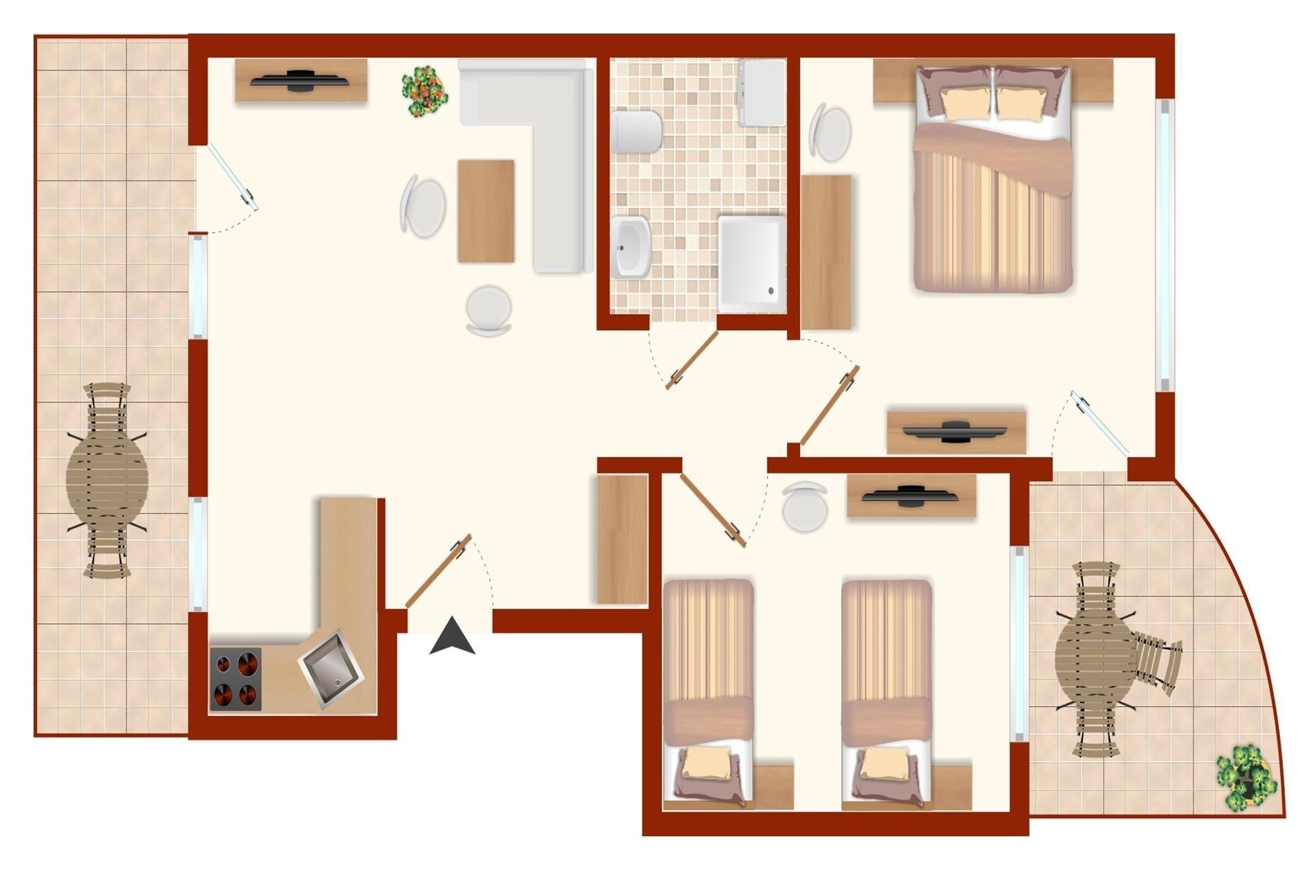 Schöne Ferienwohnung mit ca. 52m² Wohnfläche und zwei Balkonen mit elektrischen Markisen für bis zu 2 Erwachsene und 2 Kinder.