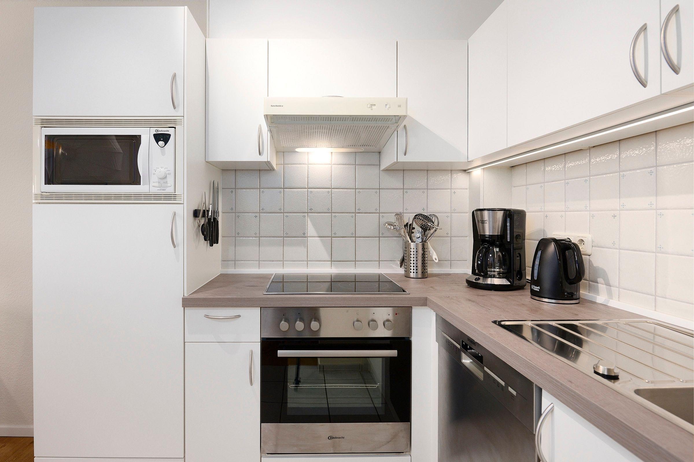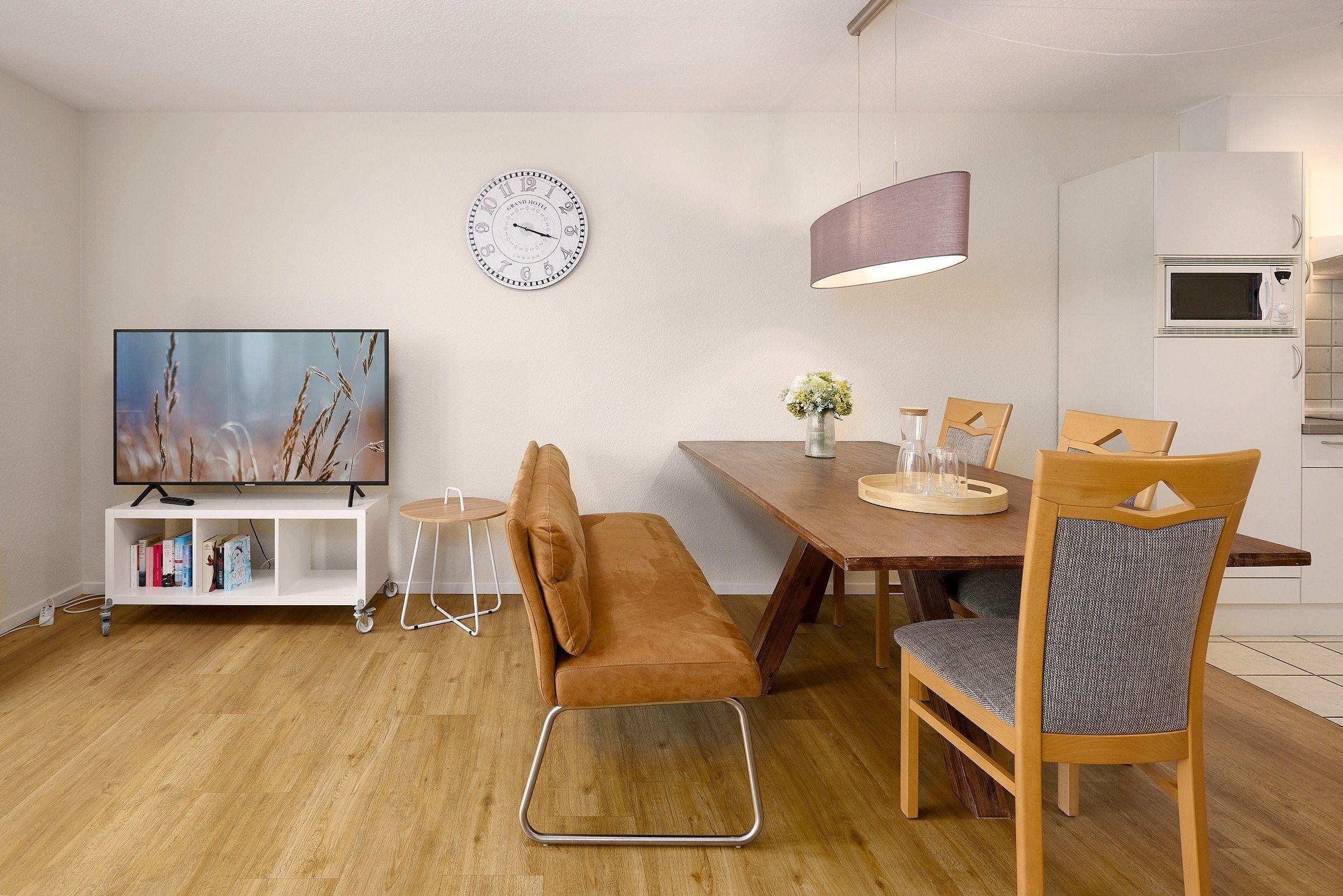 Das Wohnzimmer ist mit einer gemütlichen Couch, einem grossen modernen Flachbildfernseher, Mini-Stereoanlage und einem kostenfreien Wlan-Anschluss ausgestattet. In beiden separaten Schlafzimmern erwartet Sie jewels ein Boxspringbett (180x200 cm). Das Duschbad bietet viel Bewegungsfreiheit.