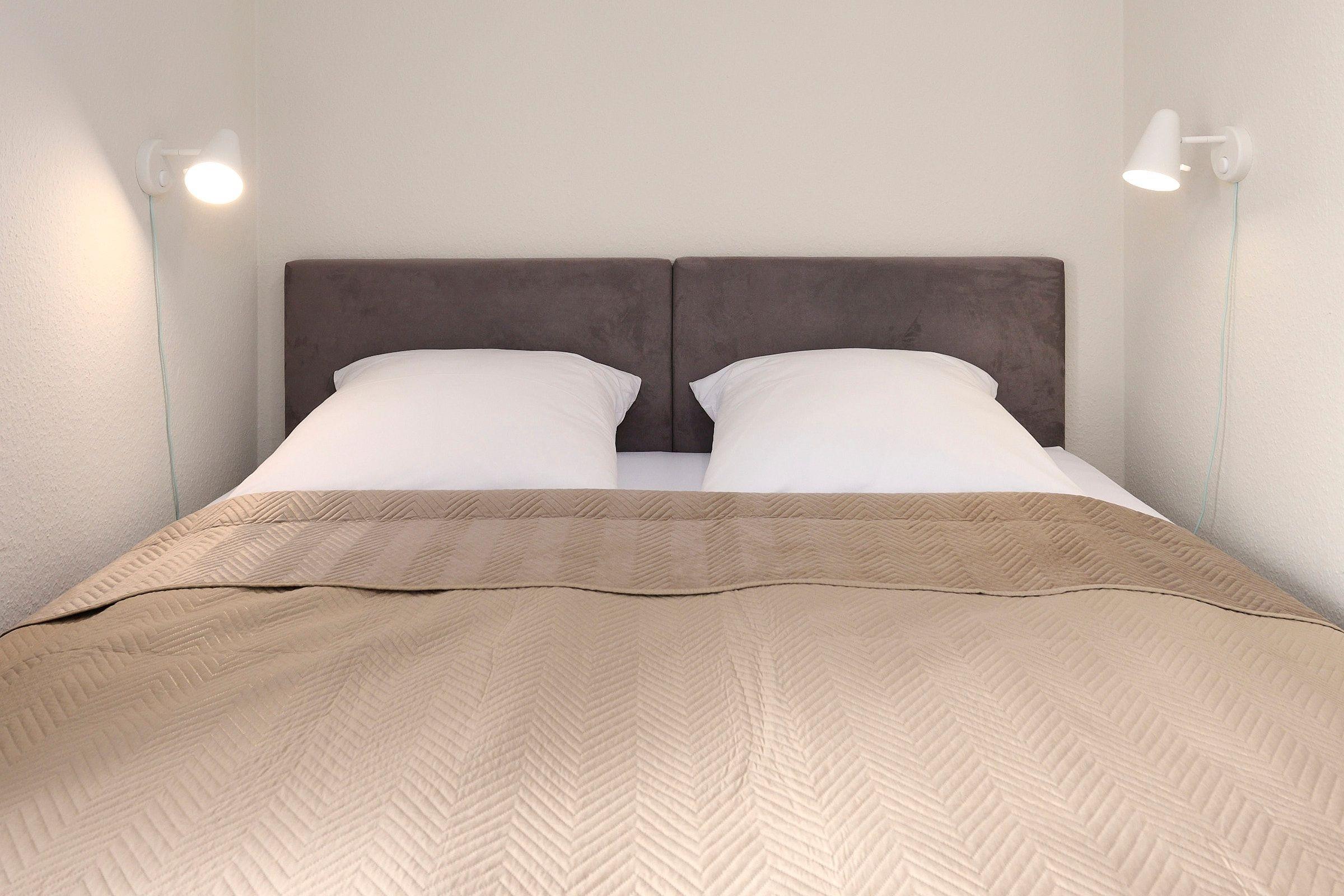 Schlafzimmer 2: 1 Boxspring-Doppelbett (2x 90x200 cm), Verdunkelung: Gardinen