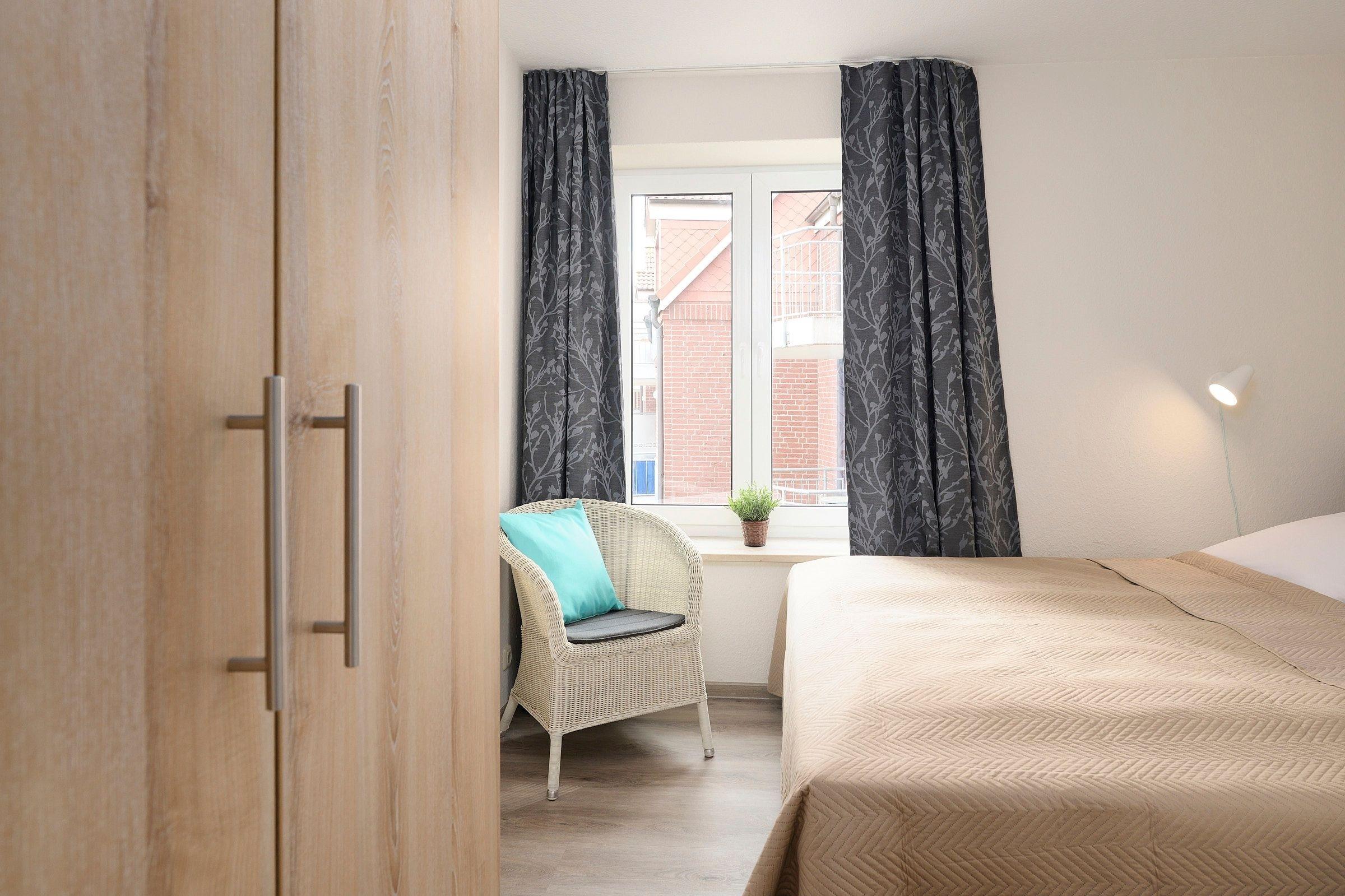 Schlafzimmer 1: 1 Boxspring-Doppelbett (2x 90x200 cm), Kleiderschrank, Verdunkelung: Gardinen