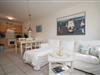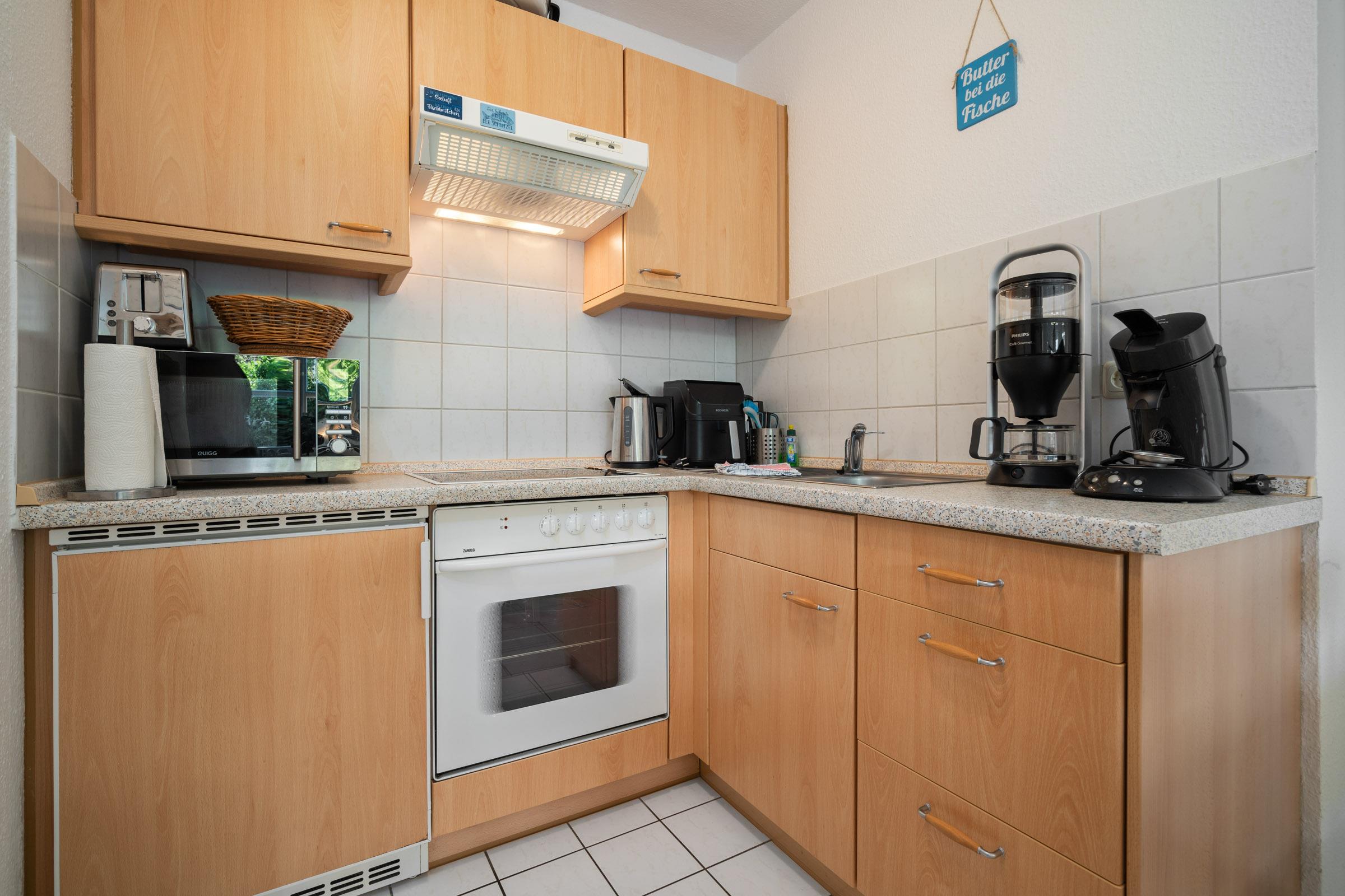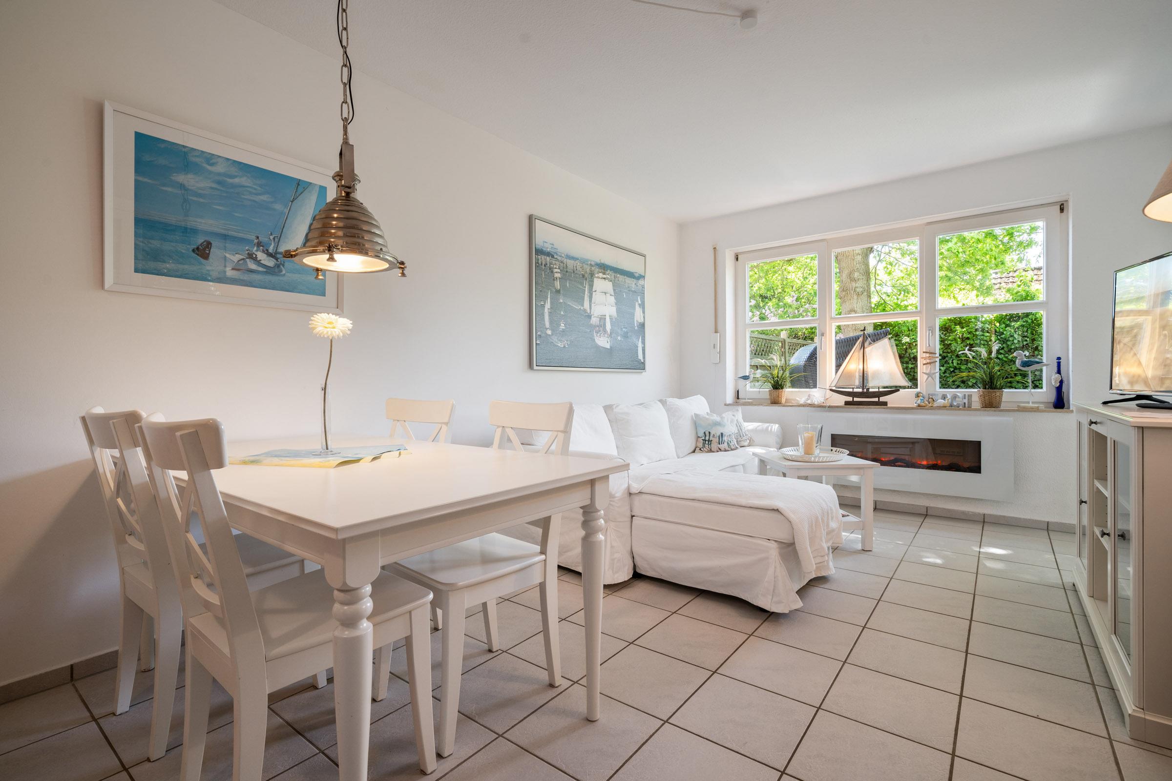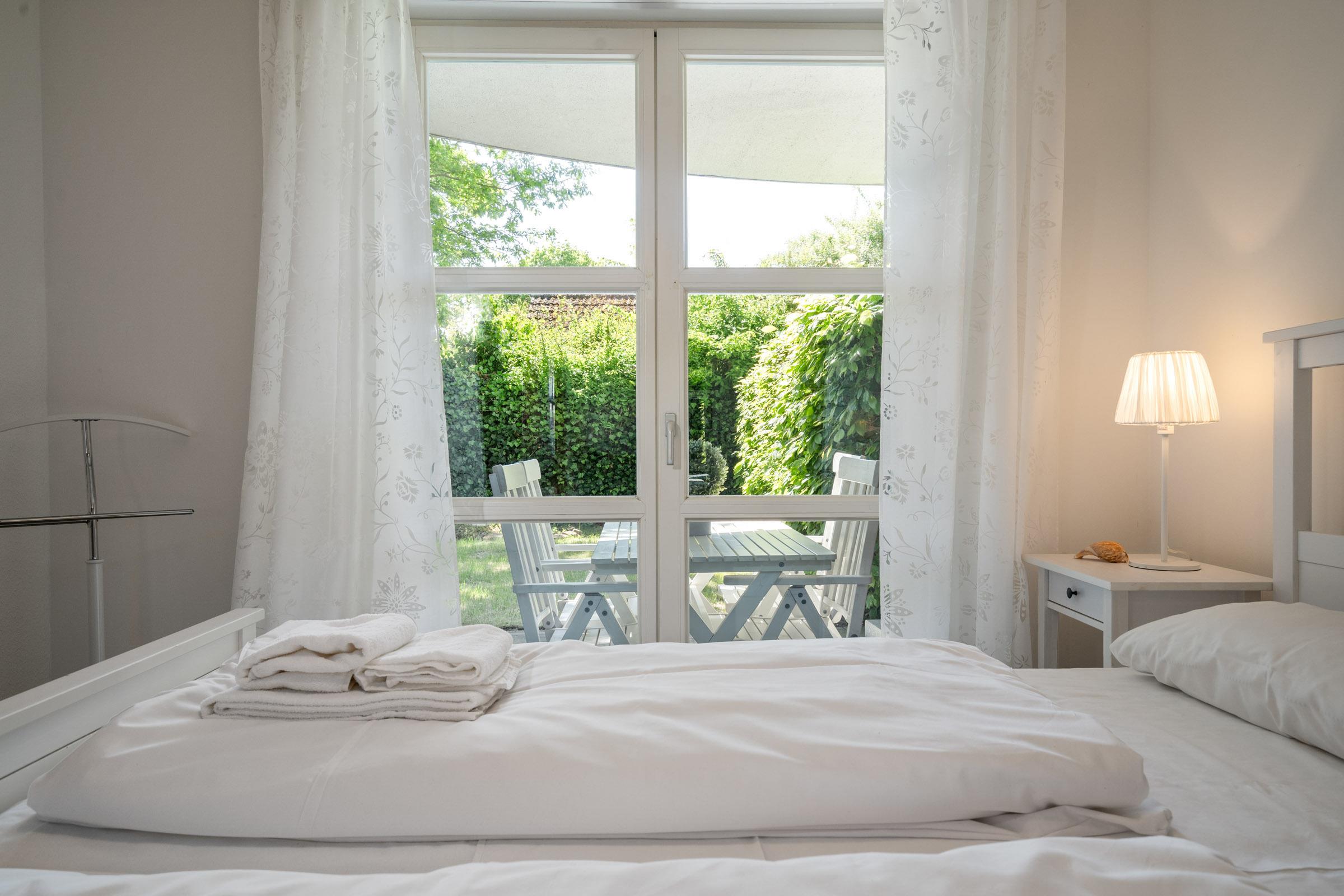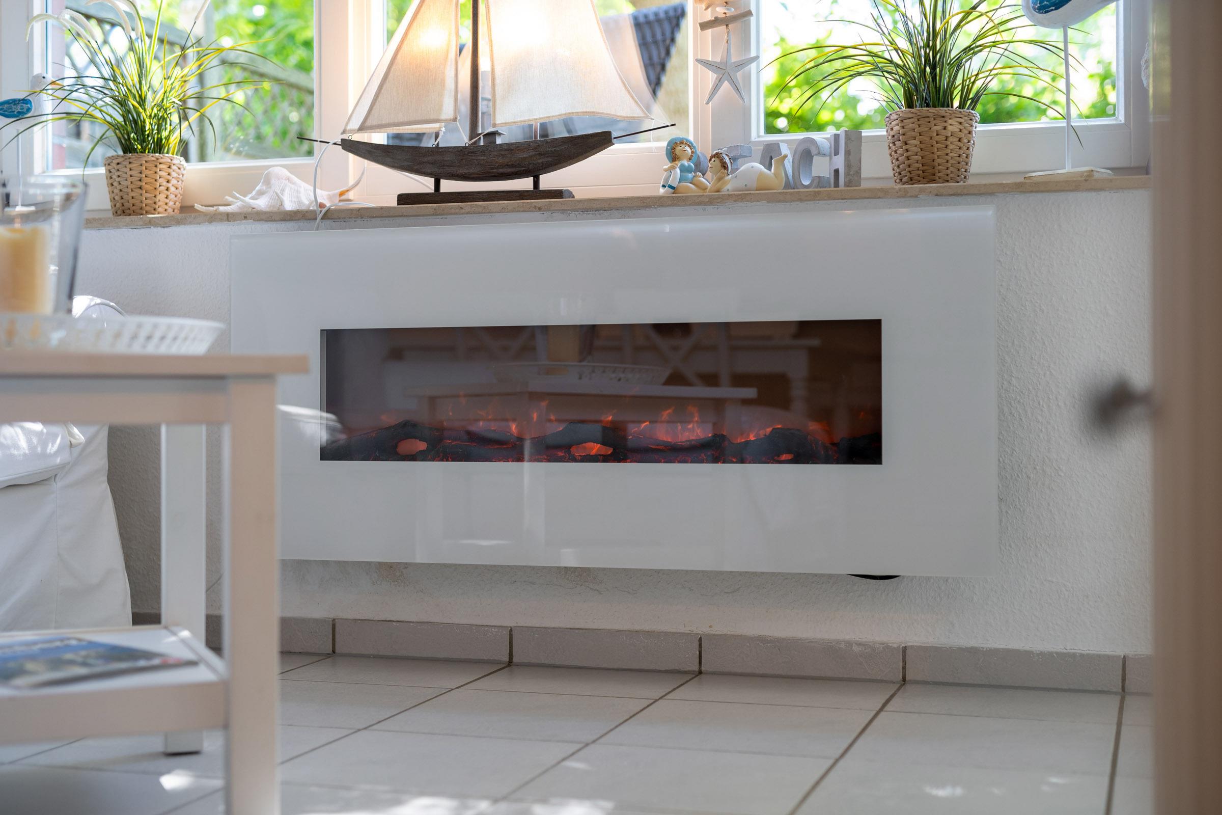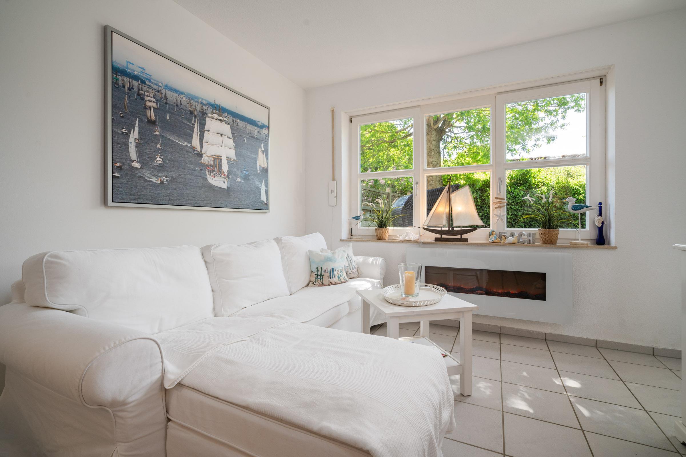 Der Wohn-/ Essbereich mit offener Küche lädt zu entspannten Urlaubsstunden vor dem elektrischen Kamin ein, der auch an kühlen Tagen eine warme und gemütliche Atmosphäre entstehen lässt. Vom Wohnzimmer können Sie direkt auf die sonnige Terrasse mit kleinem Garten treten, die mit bequemen Gartenmöbeln und einem Strandkorb ausgestattet ist. Das erste Schlafzimmer ist mit einem Doppelbett (160x200 cm), das zweite Schlafzimmer mit 2 Einzelbetten (je 90x200 cm) ausgestattet. In den Kleiderschränken verstauen Sie Ihre Urlaubsgarderobe und zur Nacht können Sie die Räume durch Außenjalousien angenehm verdunkeln.