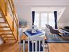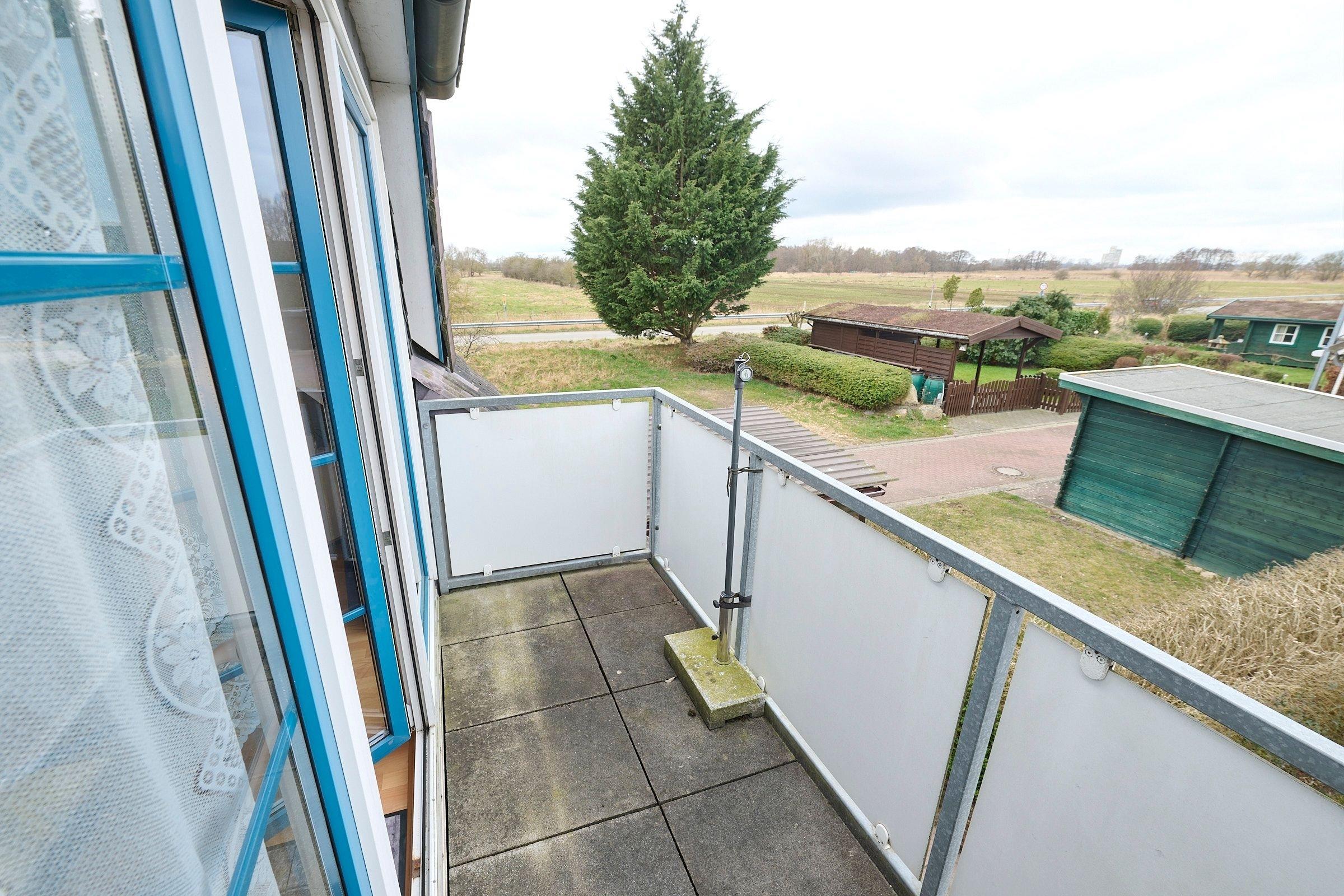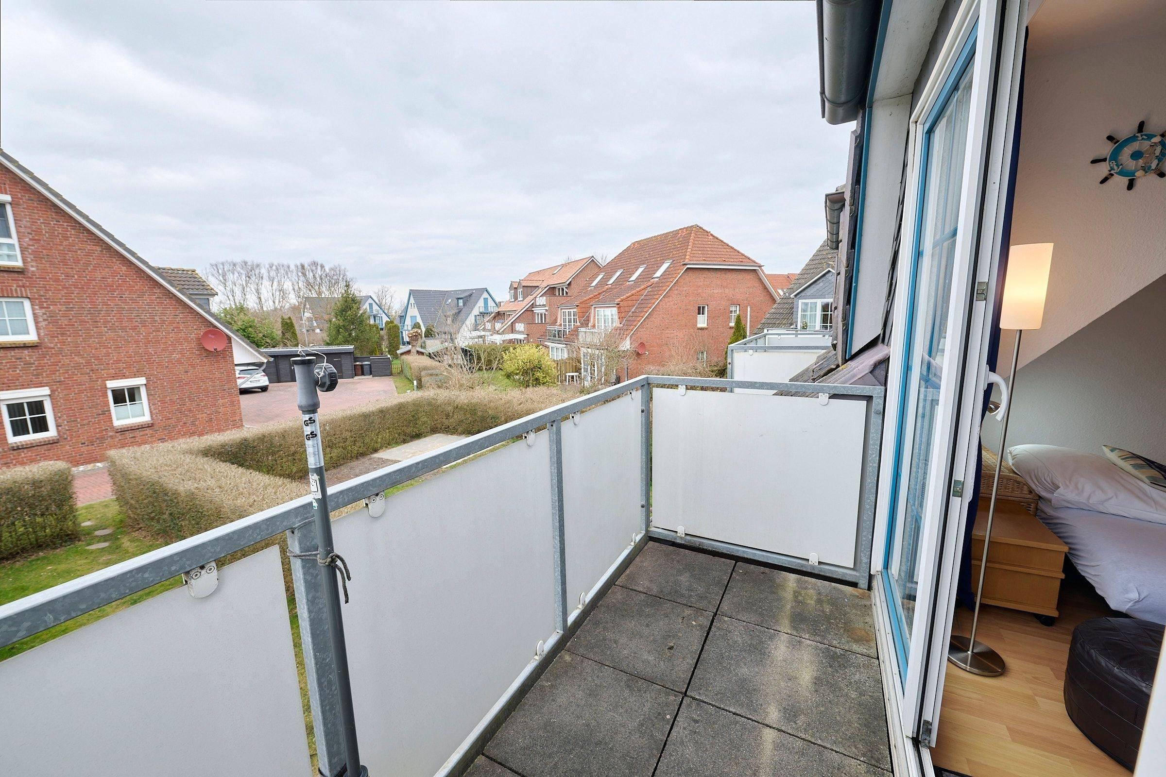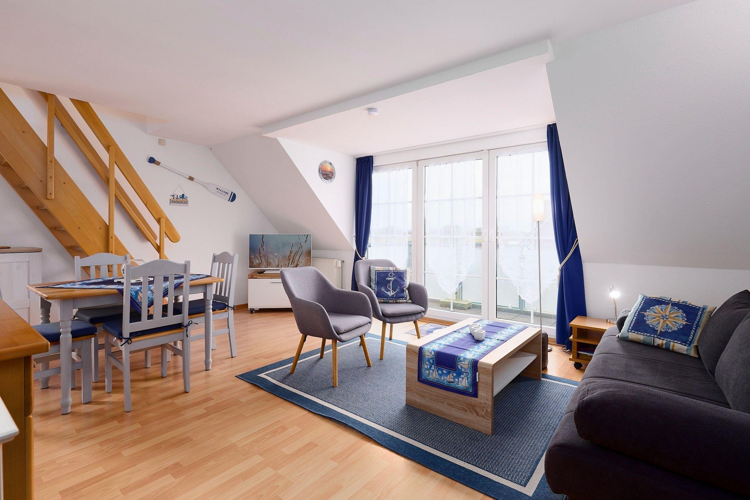 Der Wohnbereich mit gemütlicher Schlafcouch, offener Einbauküche, Duschbad mit WC und ein Balkon mit Blick auf die Salzwiesen, laden zu einem entspannten Urlaubserlebnis ein. Das Schlafzimmer befindet sich im Dachgeschoss und ist mit einem großen Kleiderschrank, zwei Nachttischen und einem Doppelbett (180x200 cm) eingerichtet. Hier befindet sich auch ein 2. WC. Ein kostenloser WLAN-Anschluss ist inklusive.