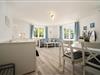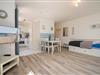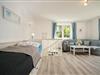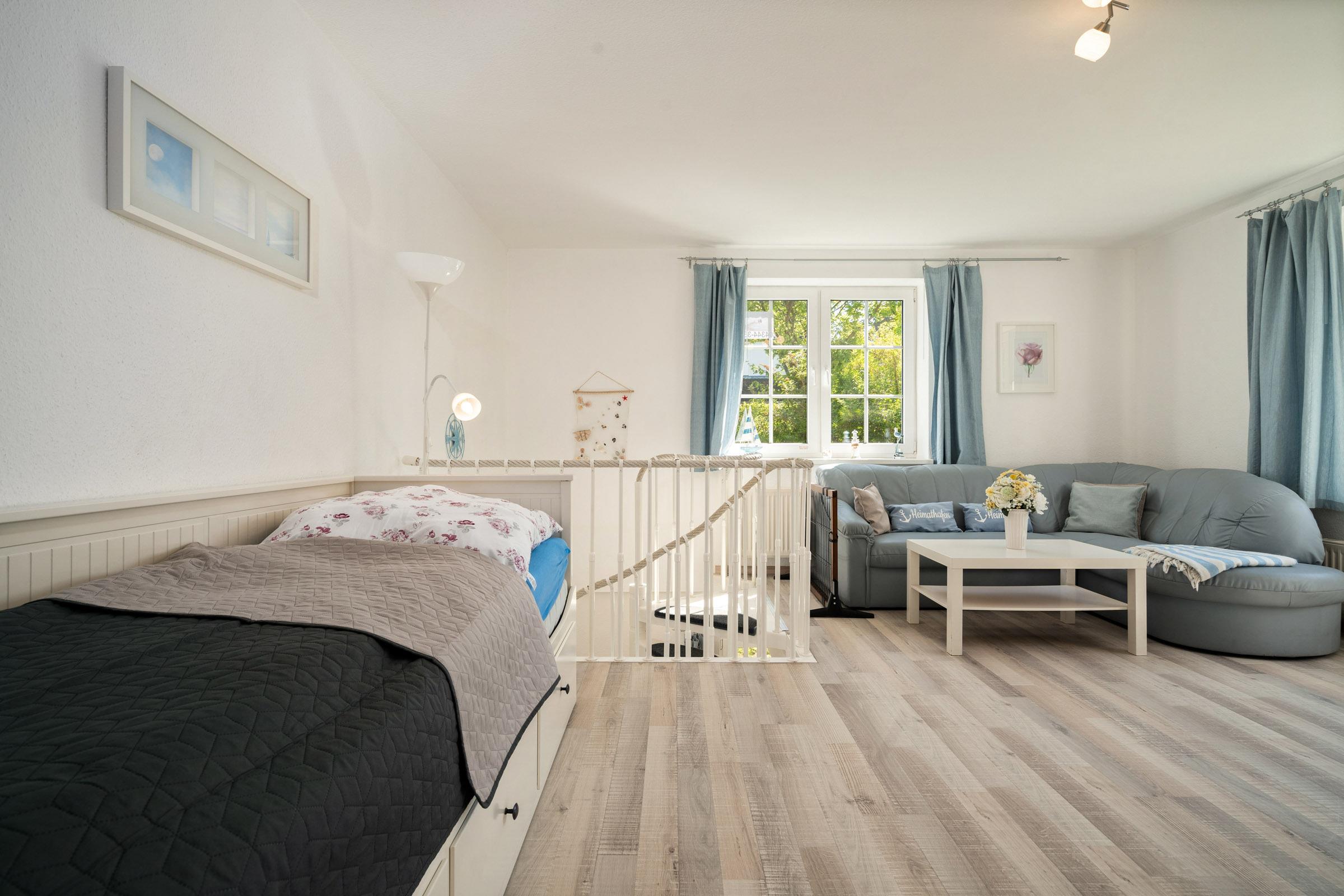 Der Wohnbereich mit bequemer Couch und Einzelbett, die offene Küche sowie das Duschbad befinden sich im Erdgeschoss. Von dem Wohnzimmer aus haben Sie die Möglichkeit, die Terrasse mit kleinem Gartenteil zu nutzen.