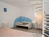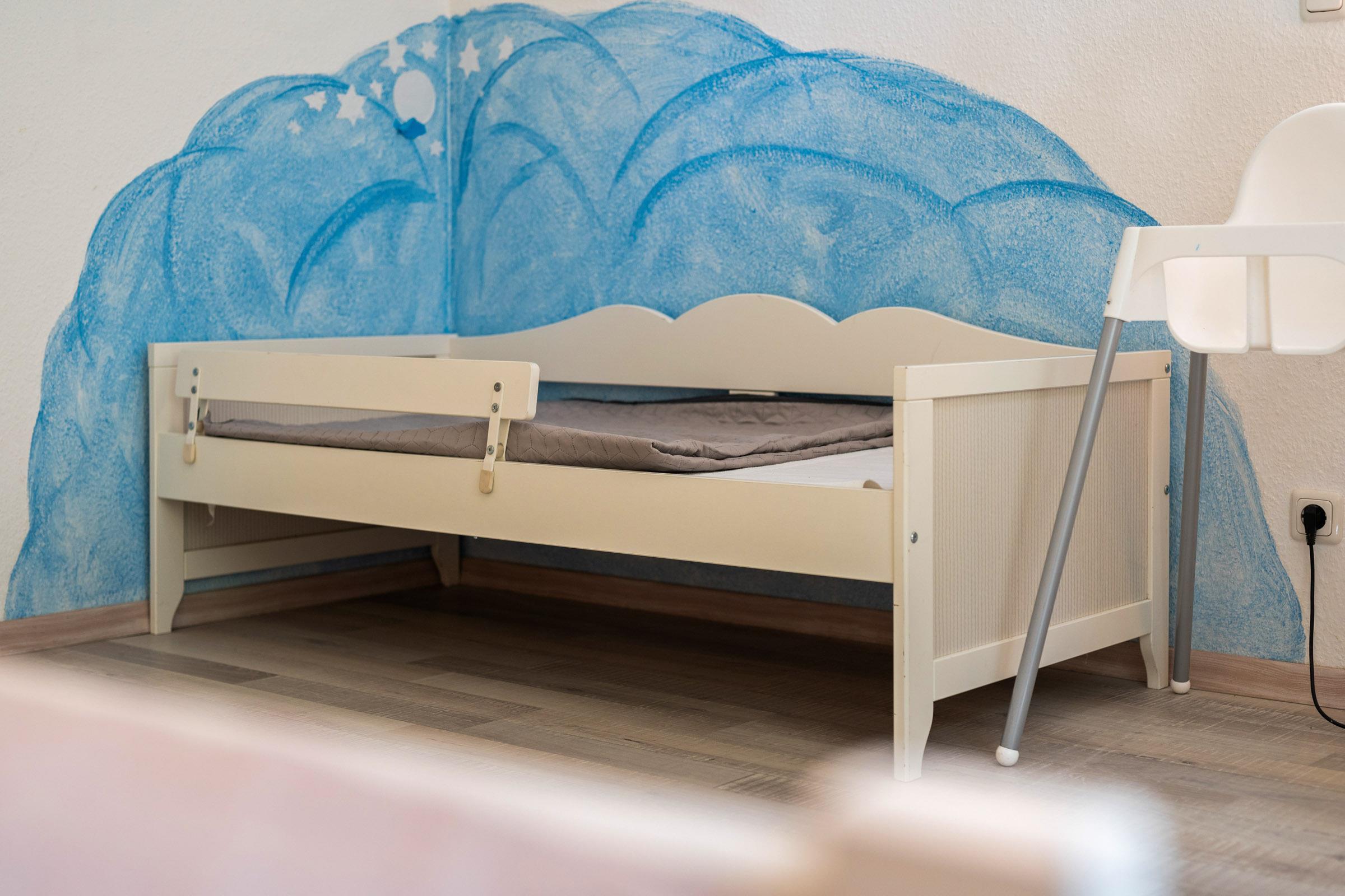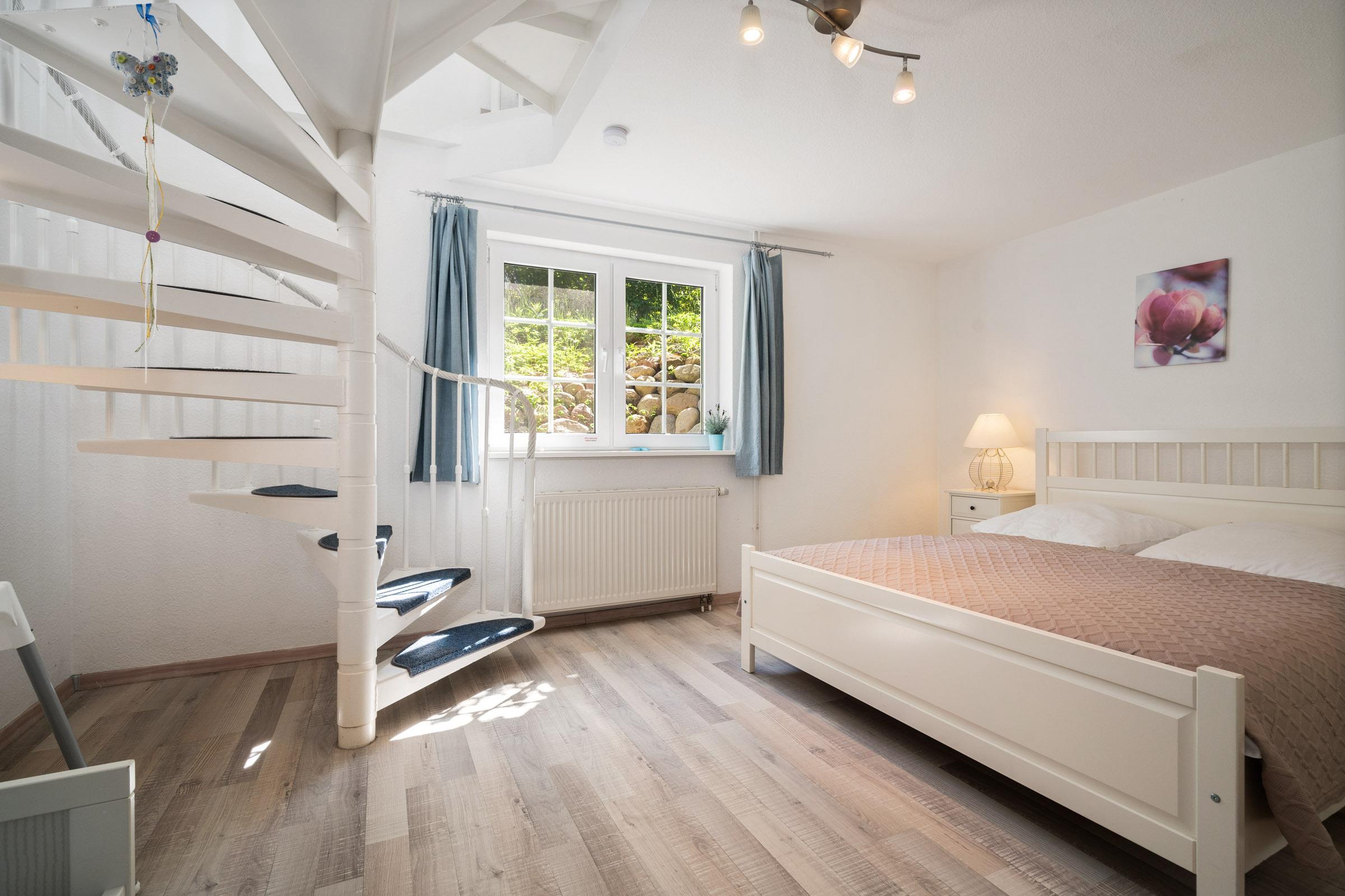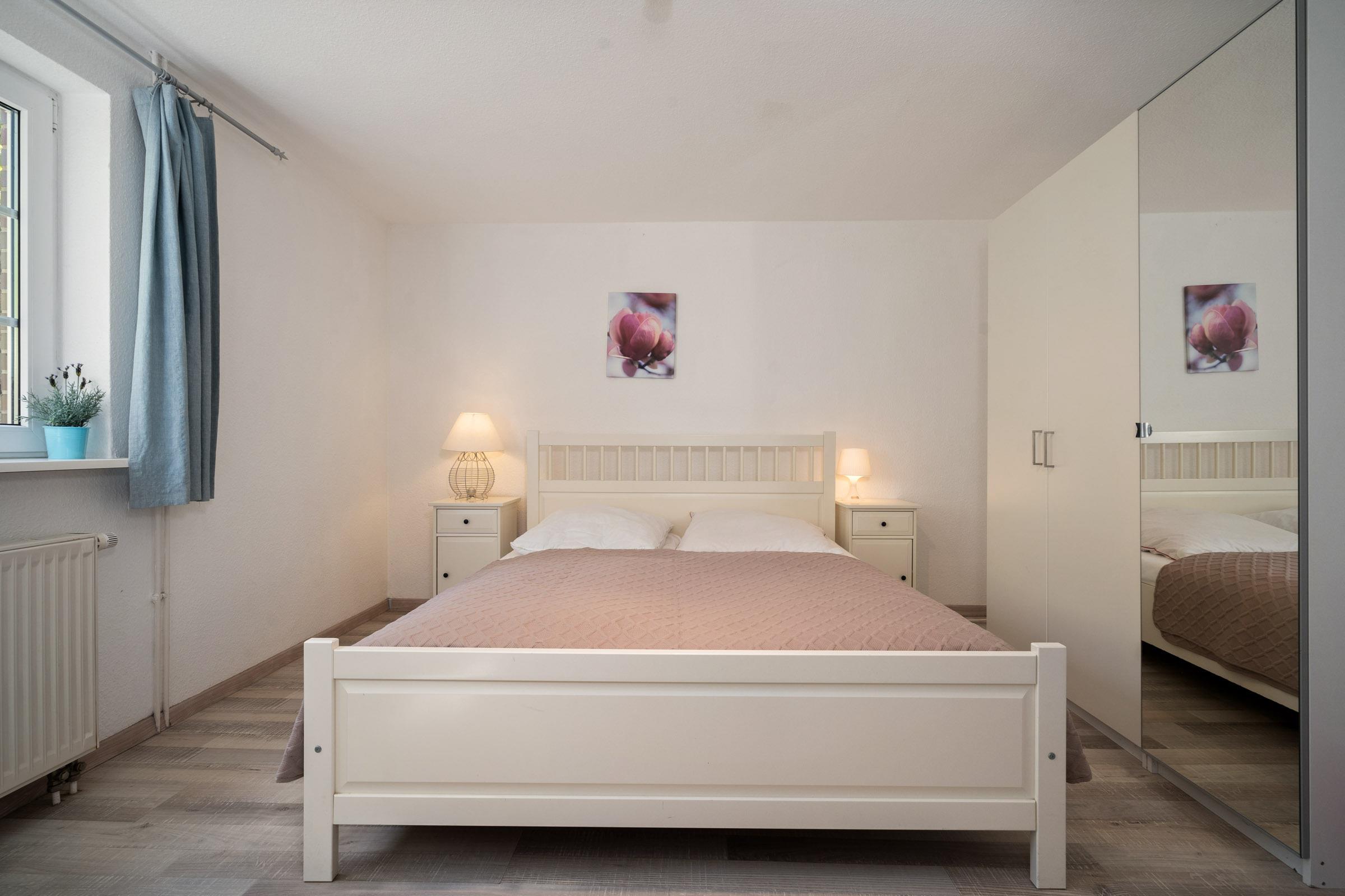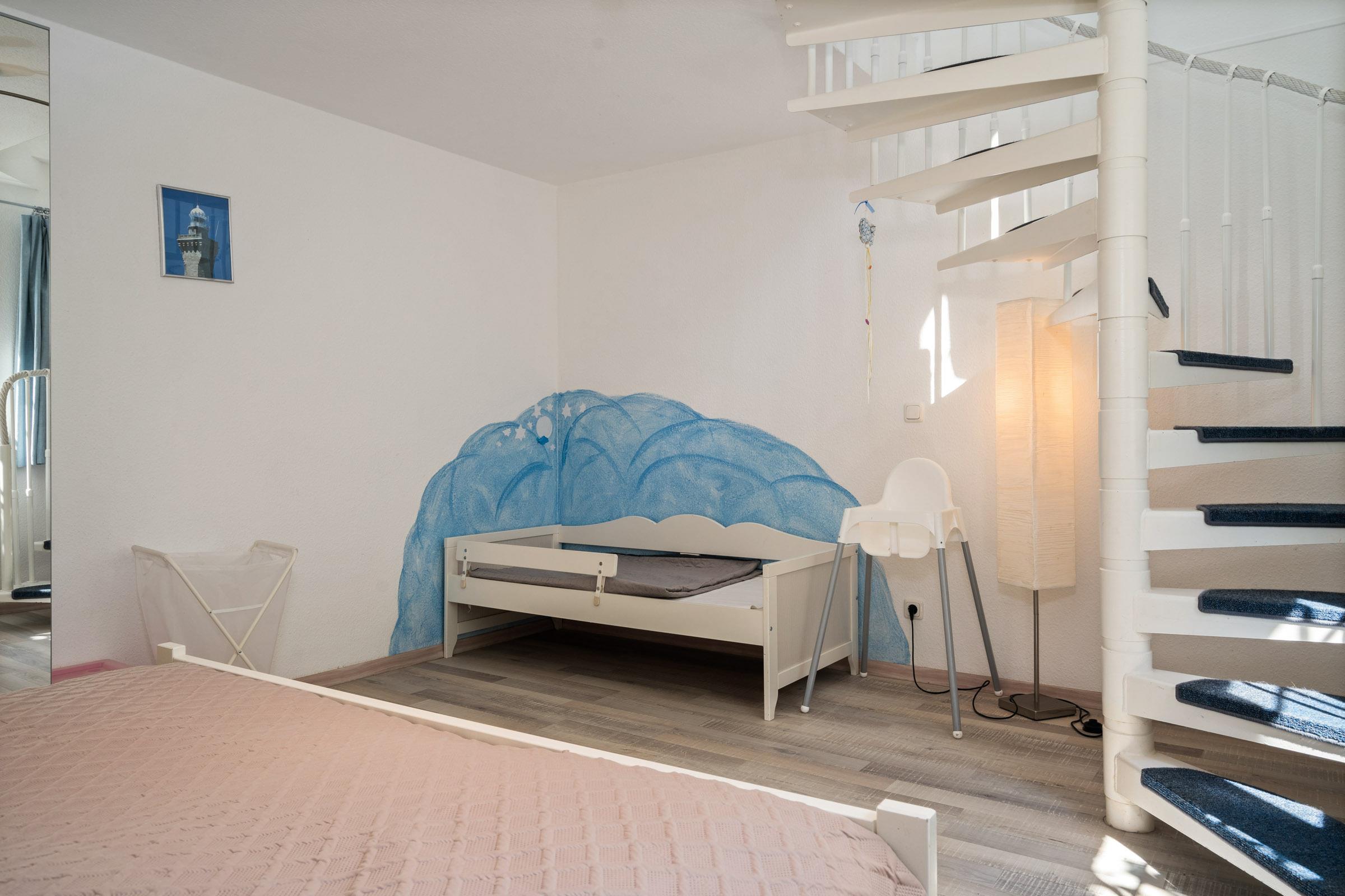 Das Schlafzimmer im Souterrain ist mit einem großen Kleiderschrank, einem Doppelbett und Kinderbett ausgestattet.