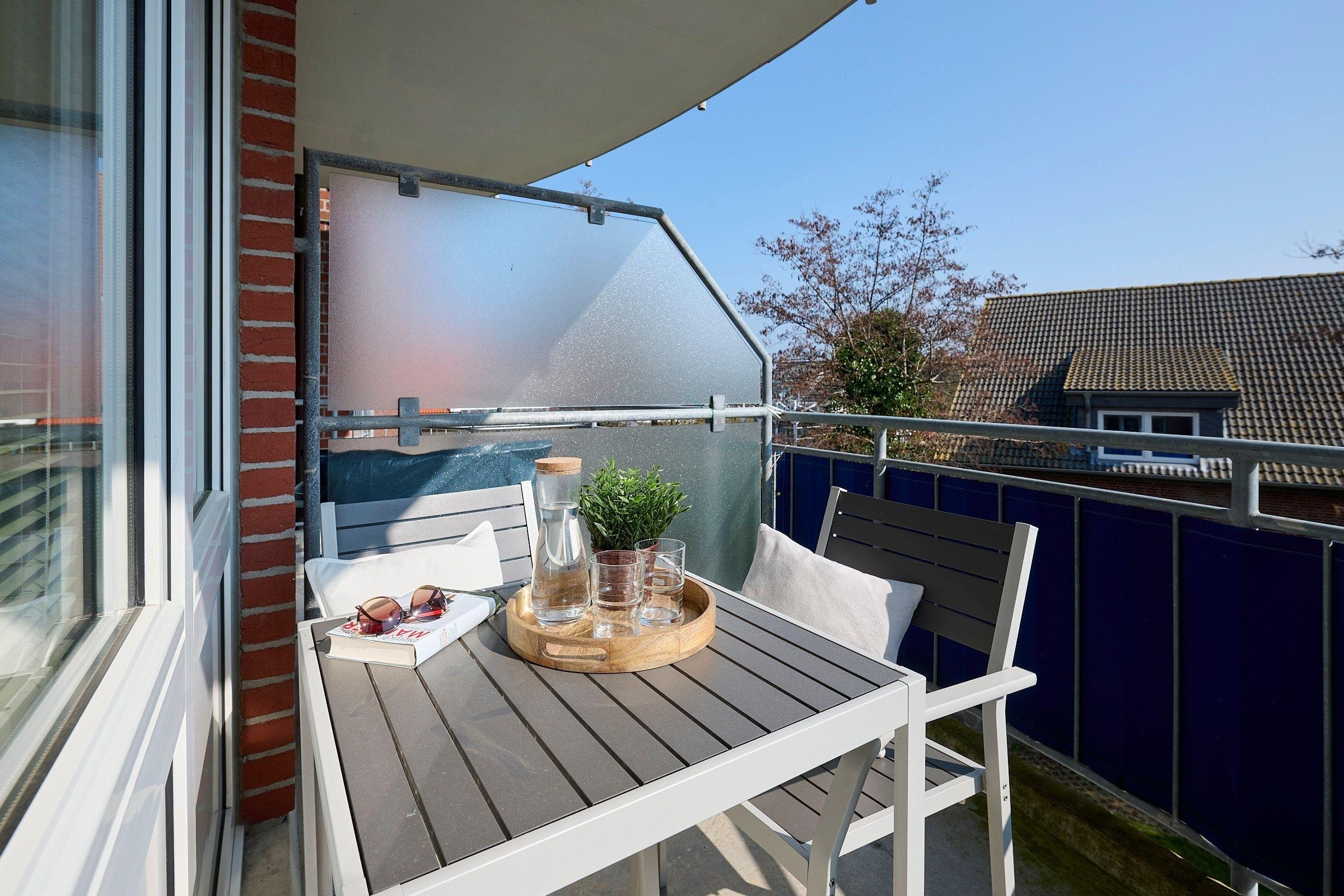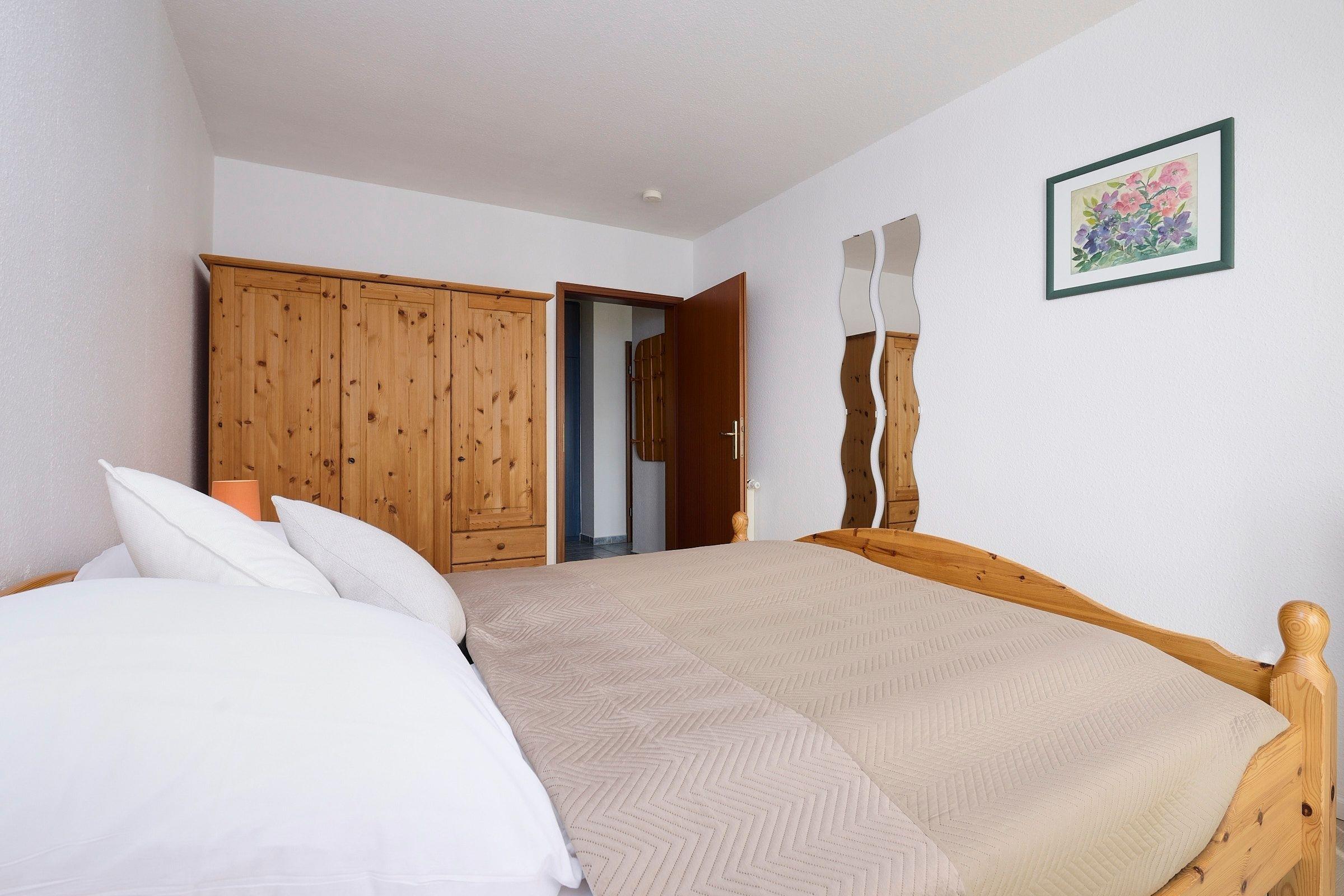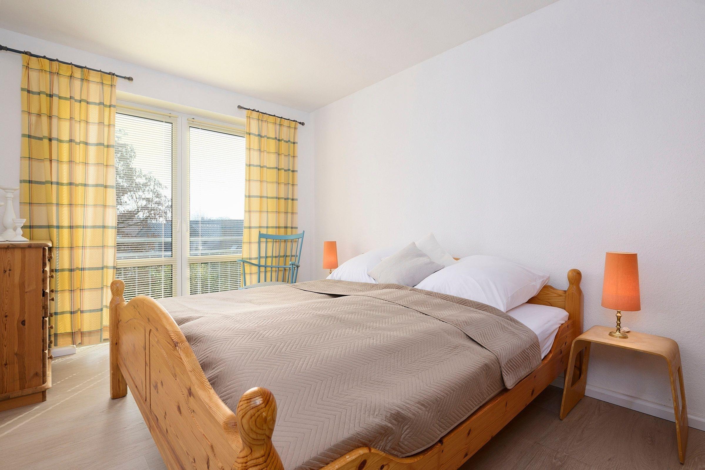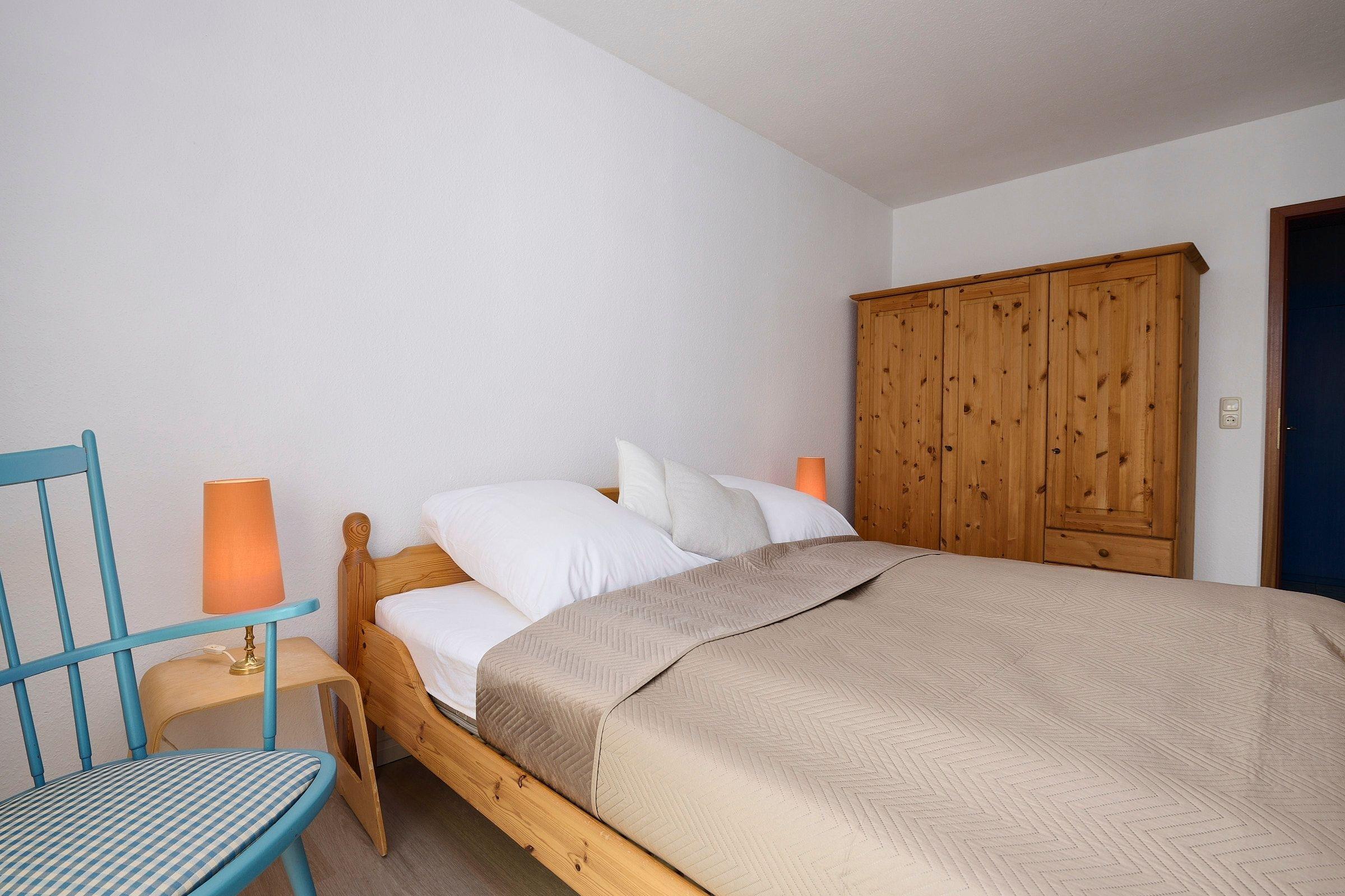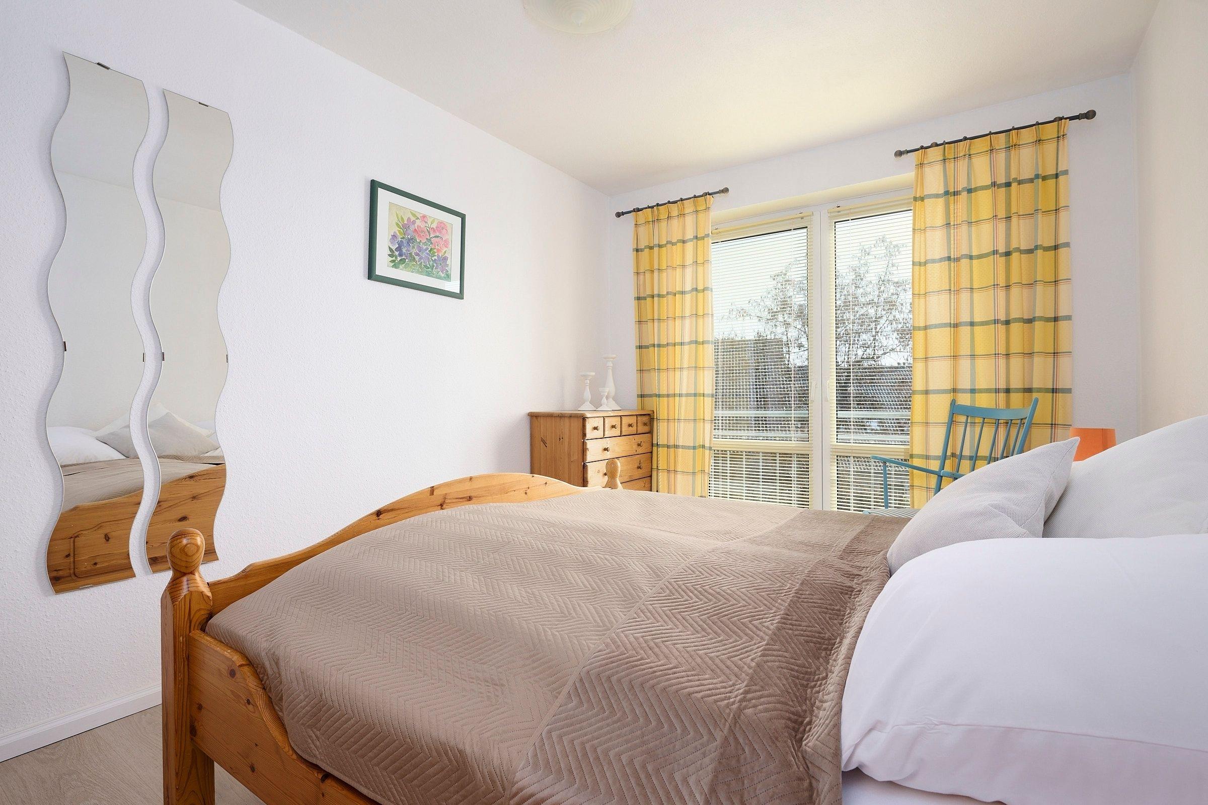 Vom Wohnzimmer haben Sie einen direkten Zugang auf den Balkon. Genießen Sie hier die Sonne bis zum frühen Nachmittag. Das Schlafzimmer ist mit einem Doppelbett, großem Kleiderschrank, 2 Nachttischen und Leselampen ausgestattet. Ein kostenfreier WLAN-Anschluss ist inklusive.