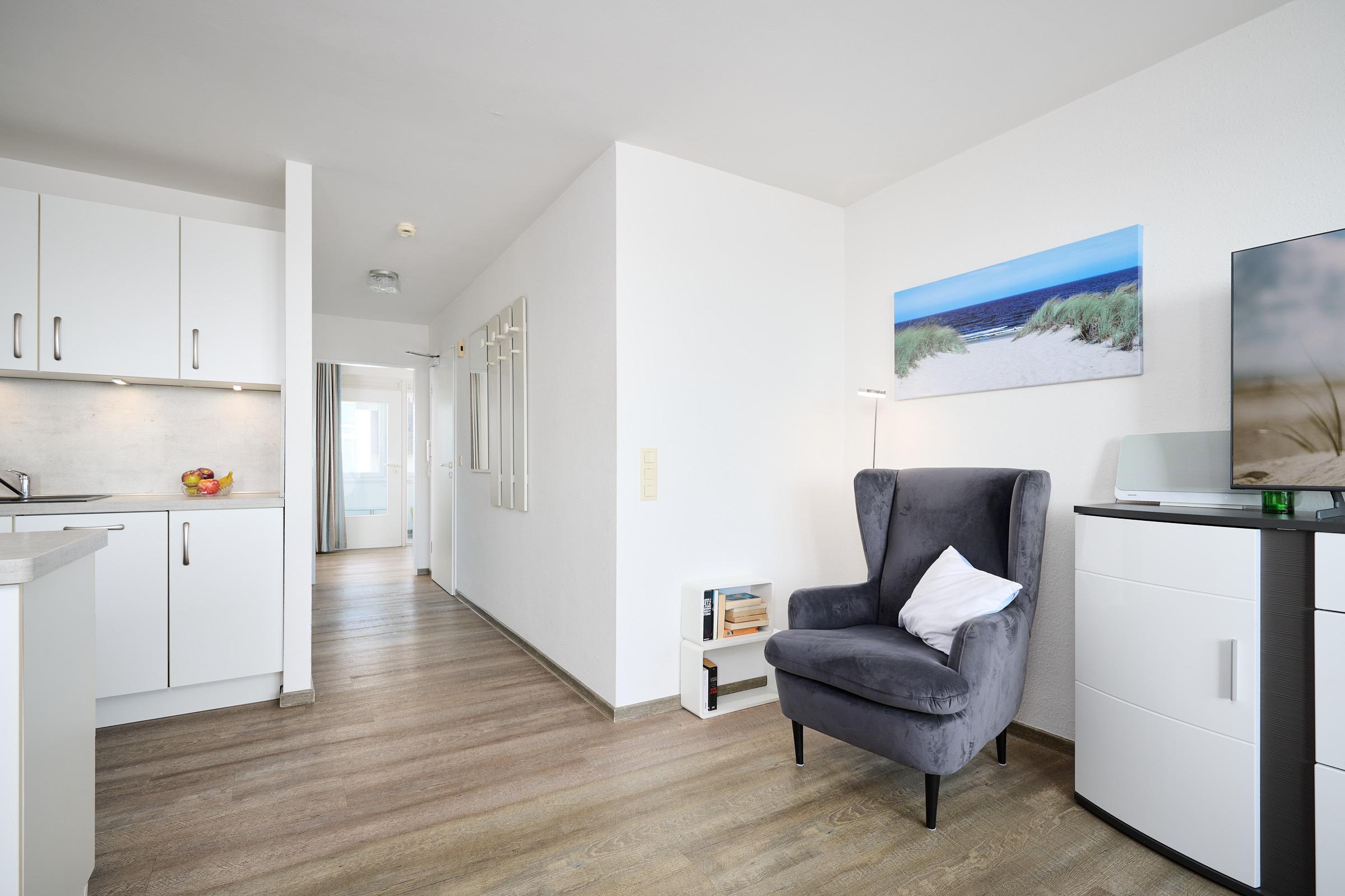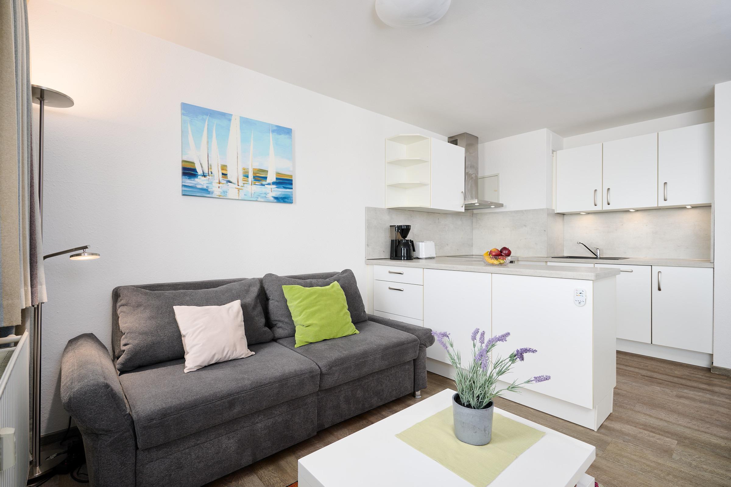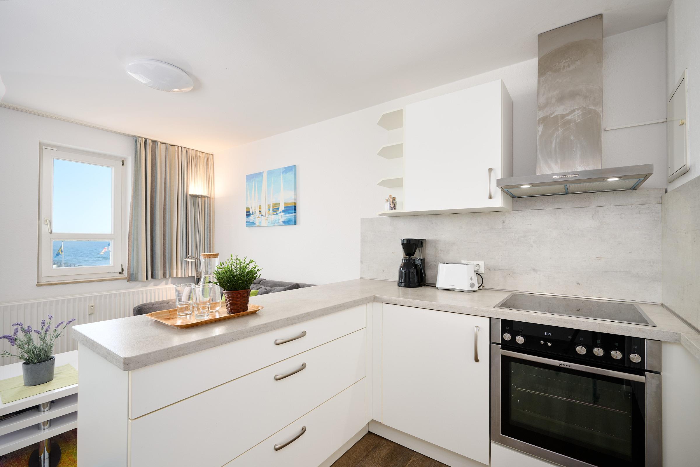 Die Fläche von ca. 43m² verteilt sich auf ein separates Schlafzimmer, ein Duschbad, ein Wohnzimmer mit offener Küche und zwei verglaste Balkone mit traumhaftem Ostseeblick (die Fenster lassen sich weit öffnen).