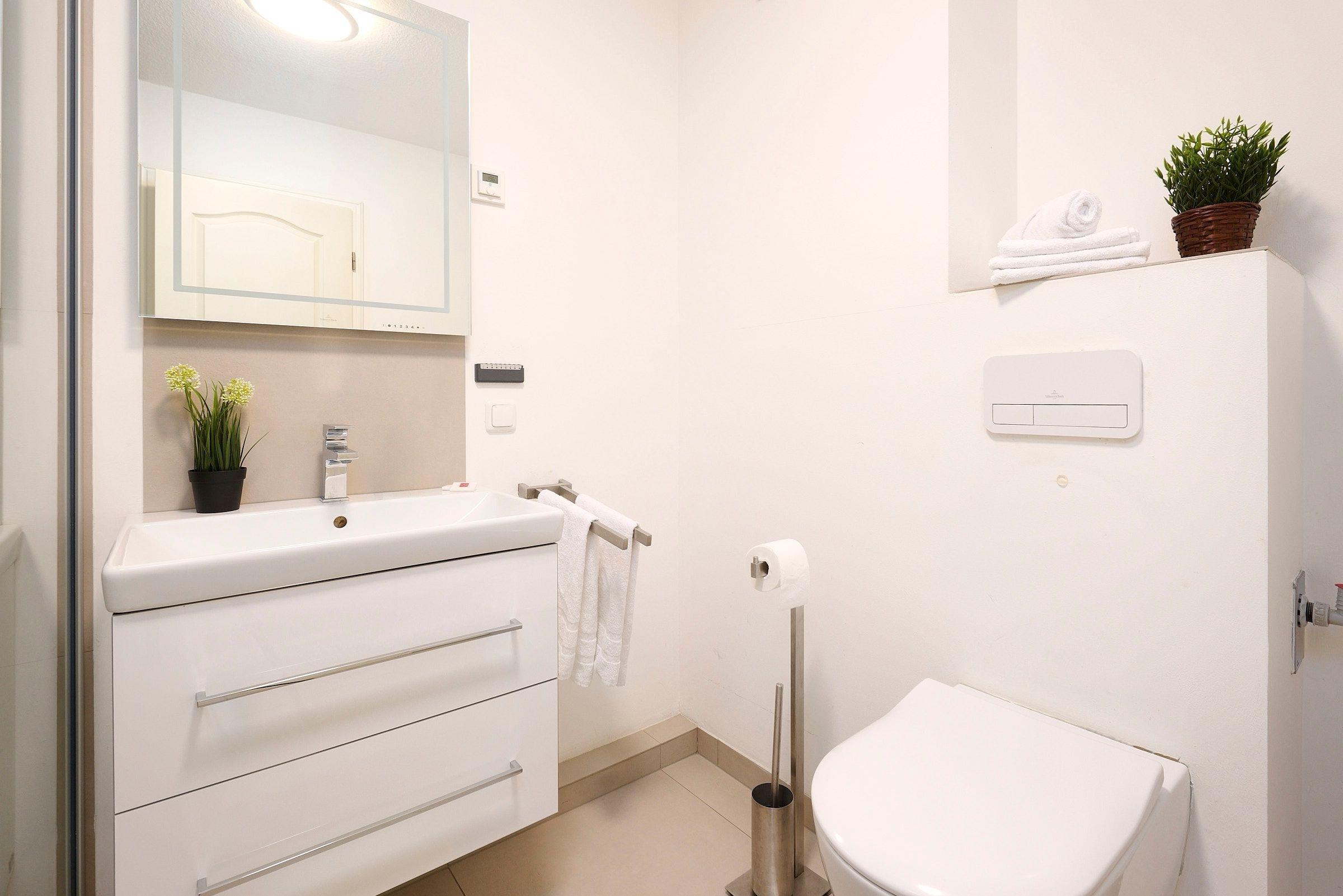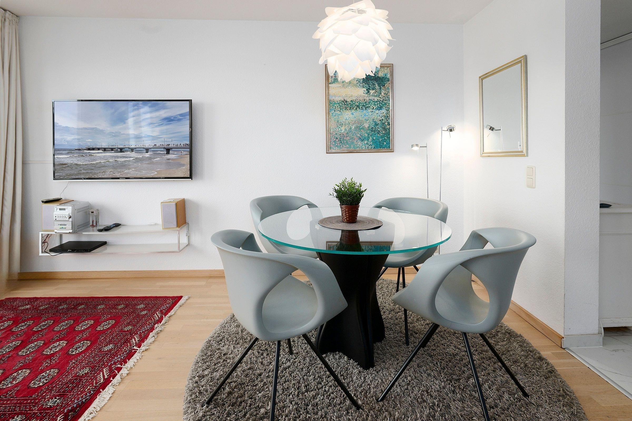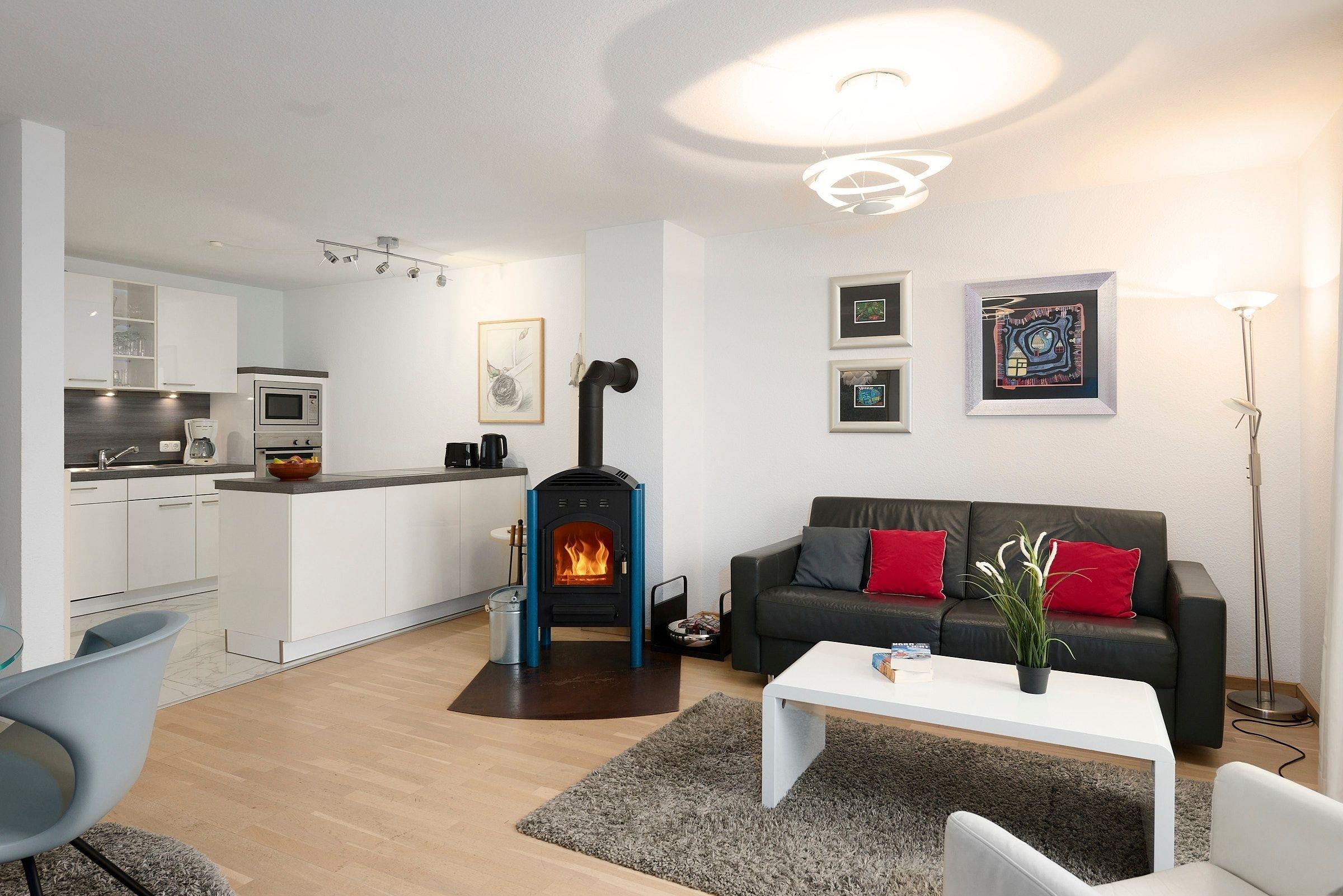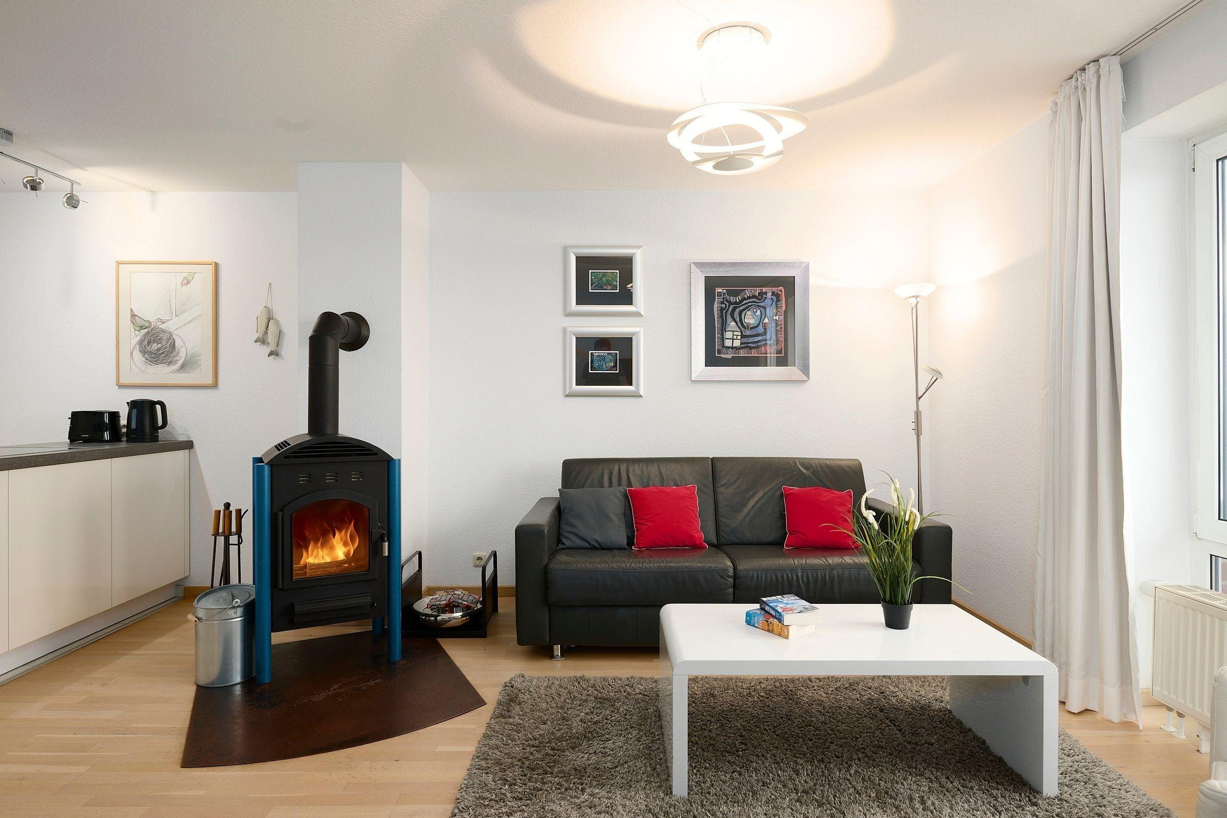 Das Wohnzimmer ist mit einer Schlafcouch (160x200cm), einem grossen modernen Flachbildfernseher, Mini-Stereoanlage, DVD-Player und einem kostenfreien Wlan-Anschluss ausgestattet. Die wohlige Wärme aus dem Kaminofen sorgt für Gemütlichkeit und ist ein weiteres Highlight Ihrer Ferienwohnung. Das Duschbad verfügt über eine Regendusche, Handtuchwärmer und Fön.