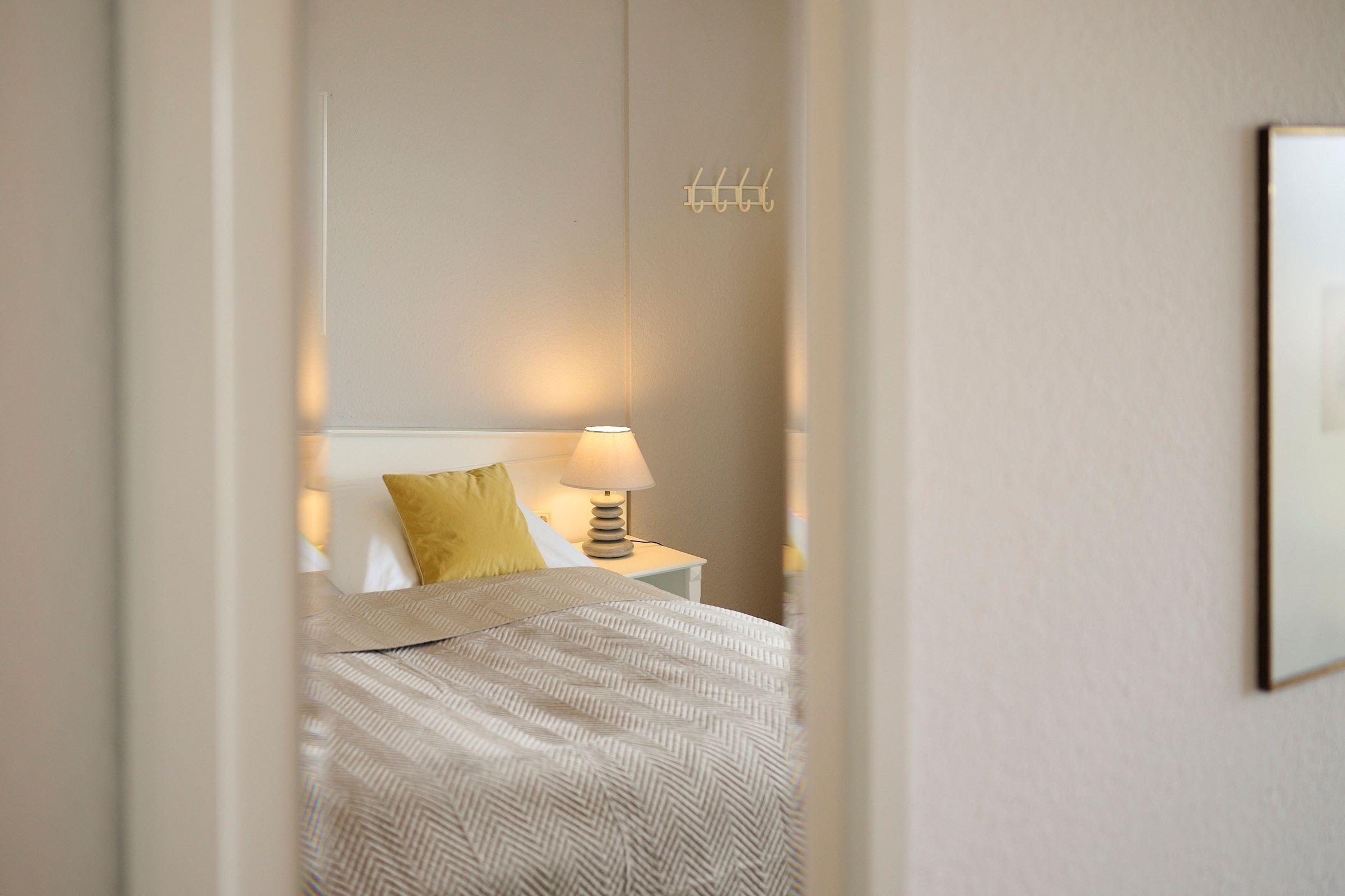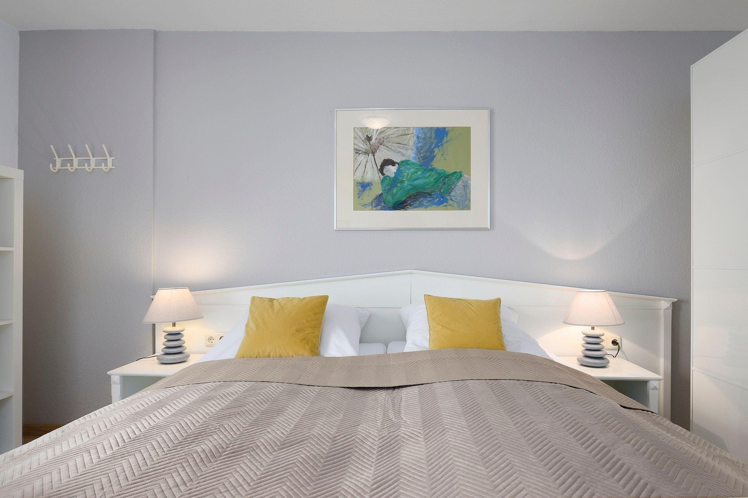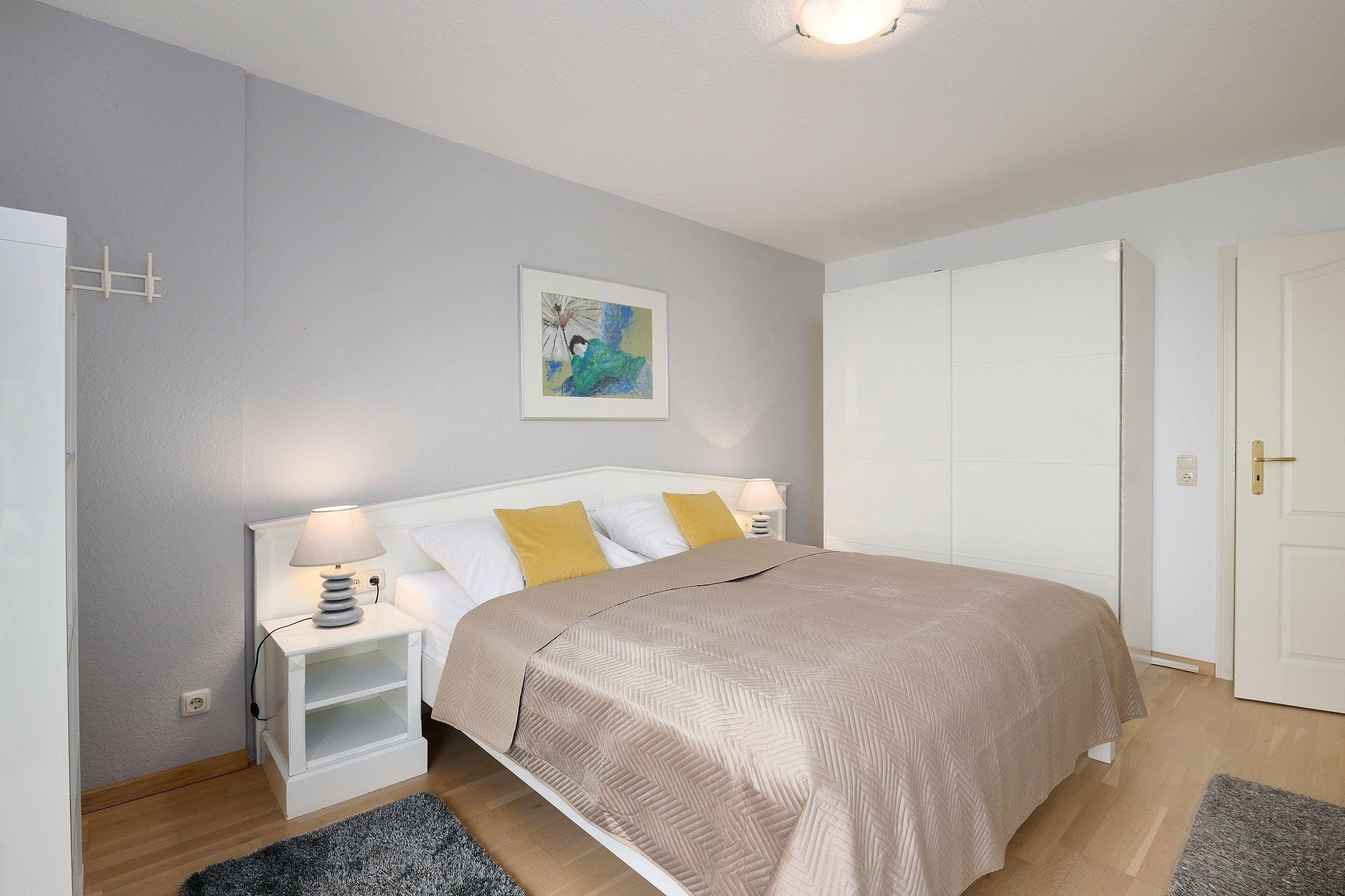 Schlafzimmer: 1 Doppelbett (2x 90x200 cm), Kleiderschrank, Verdunkelung: Gardinen