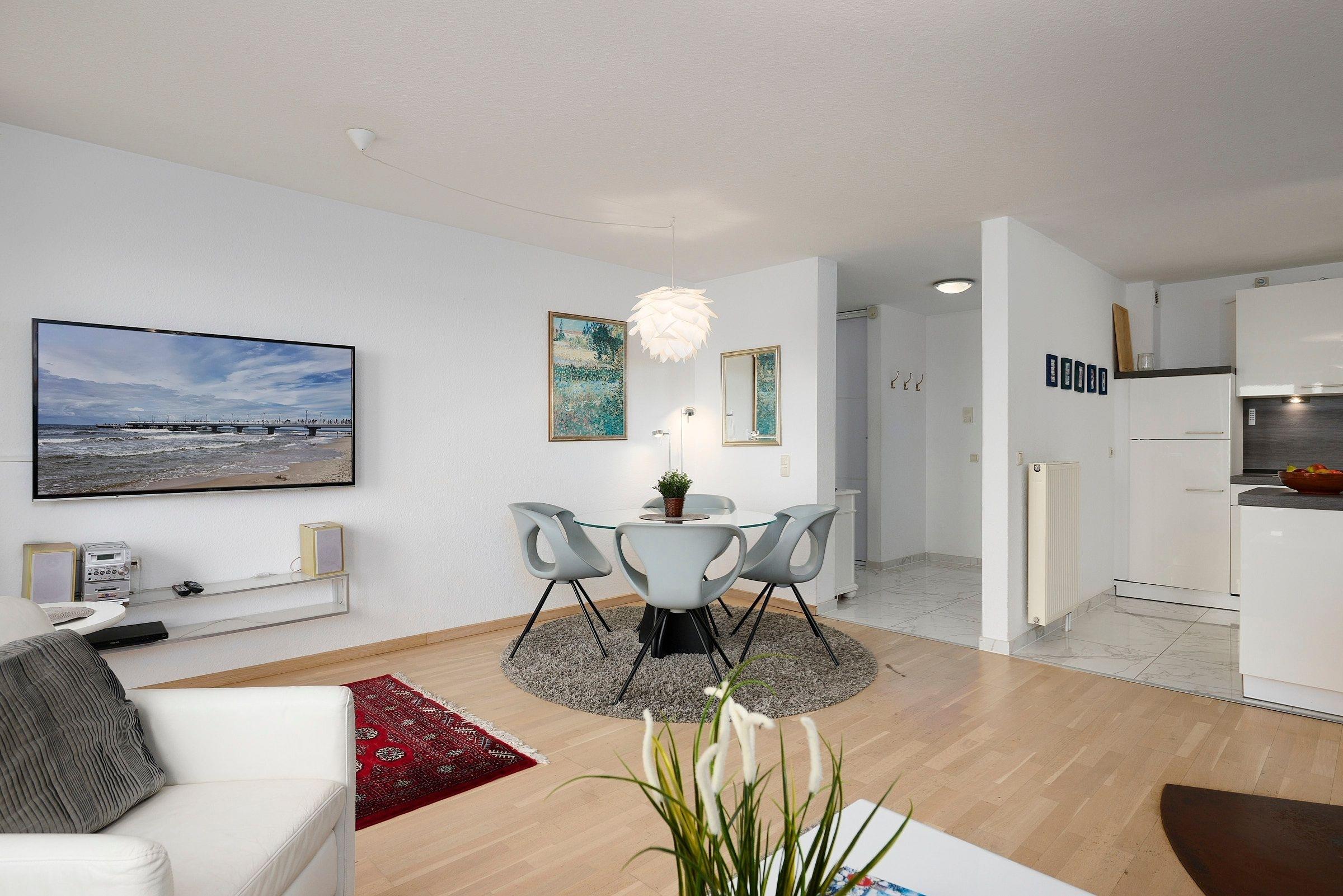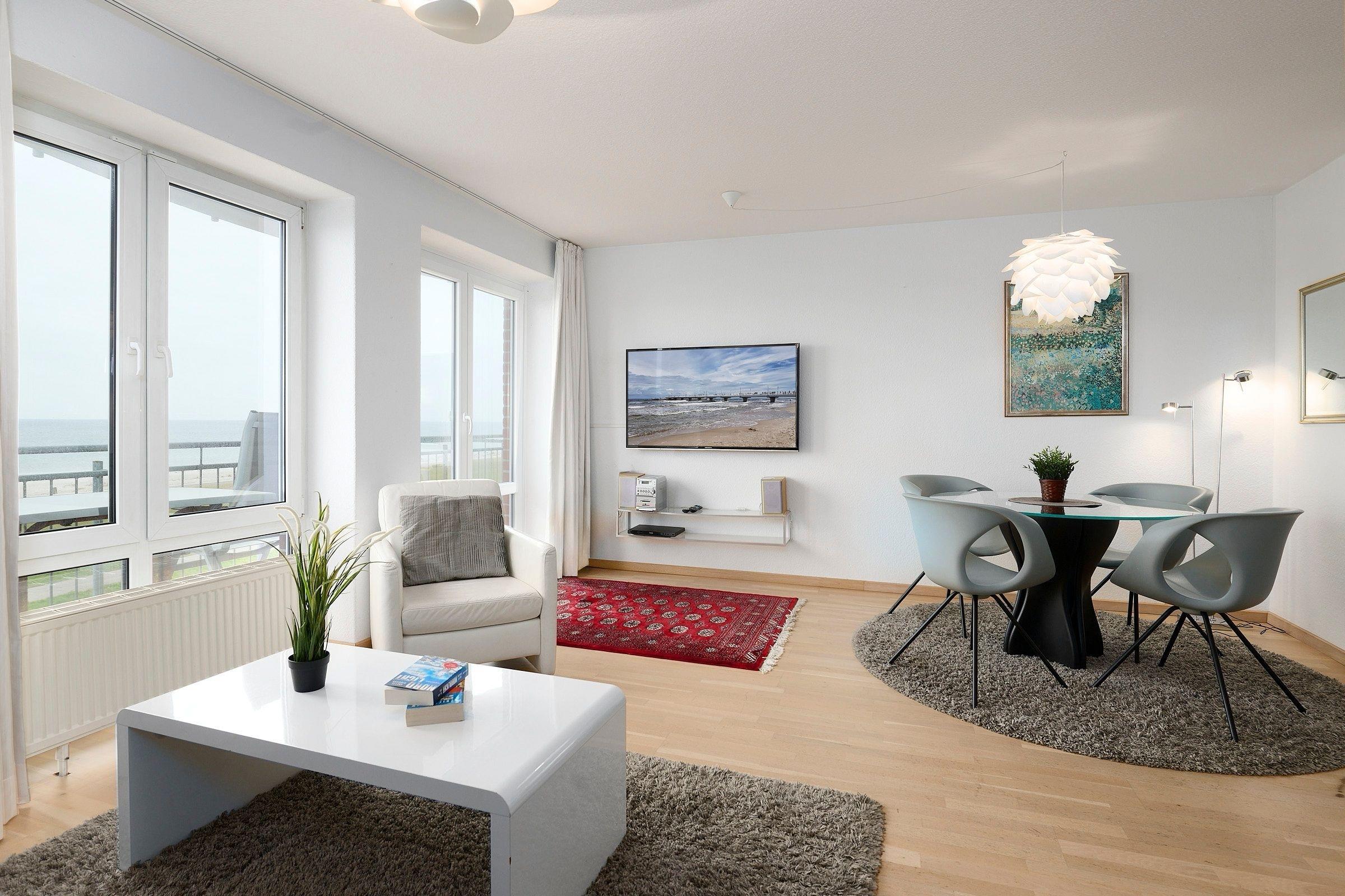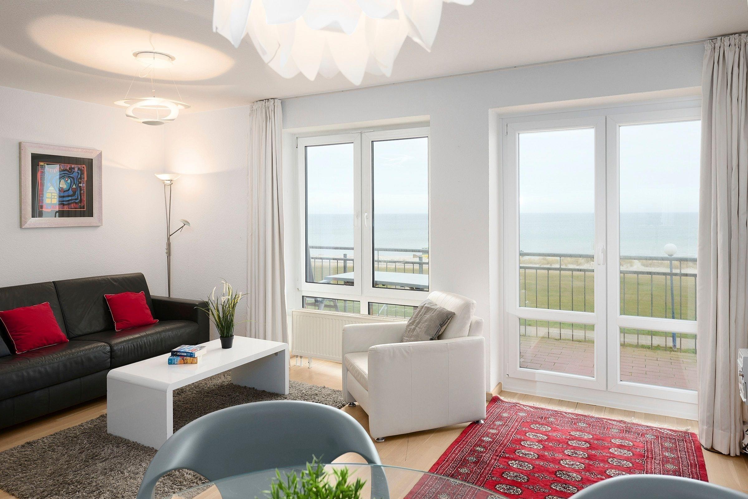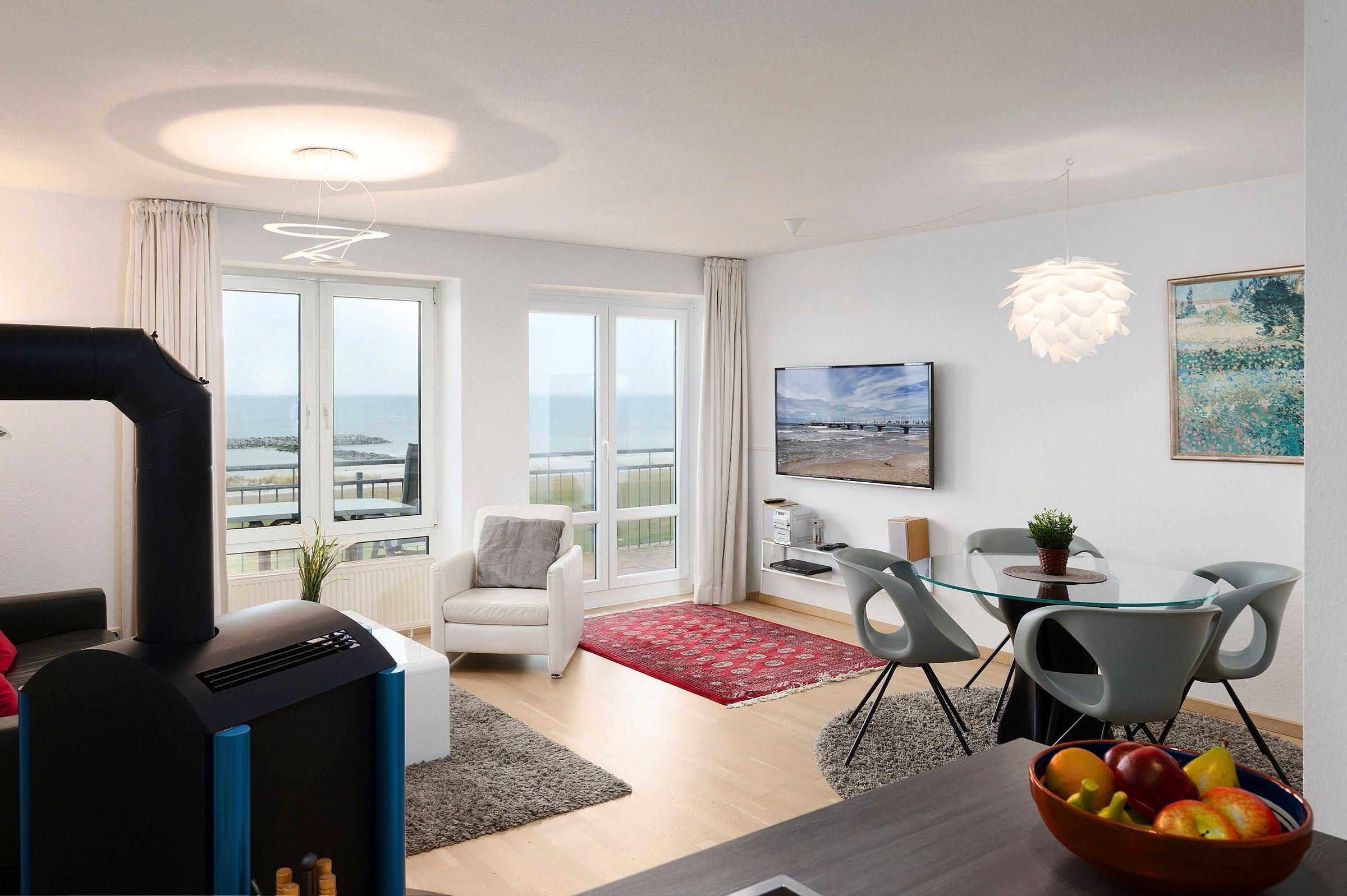 In traumhafter Lage direkt in 1.Reihe am Schönberger Strand befindet sich im 1. OG die 2-Zimmer-Ferienwohung Seaside mit einem wunderschönen Meerblick. Die Wohnfläche von ca.63 m² mit Platz für 4 Personen verteilt sich auf ein Schlafzimmer, Duschbad und ein Wohnzimmer mit offener Küche und Essbereich.