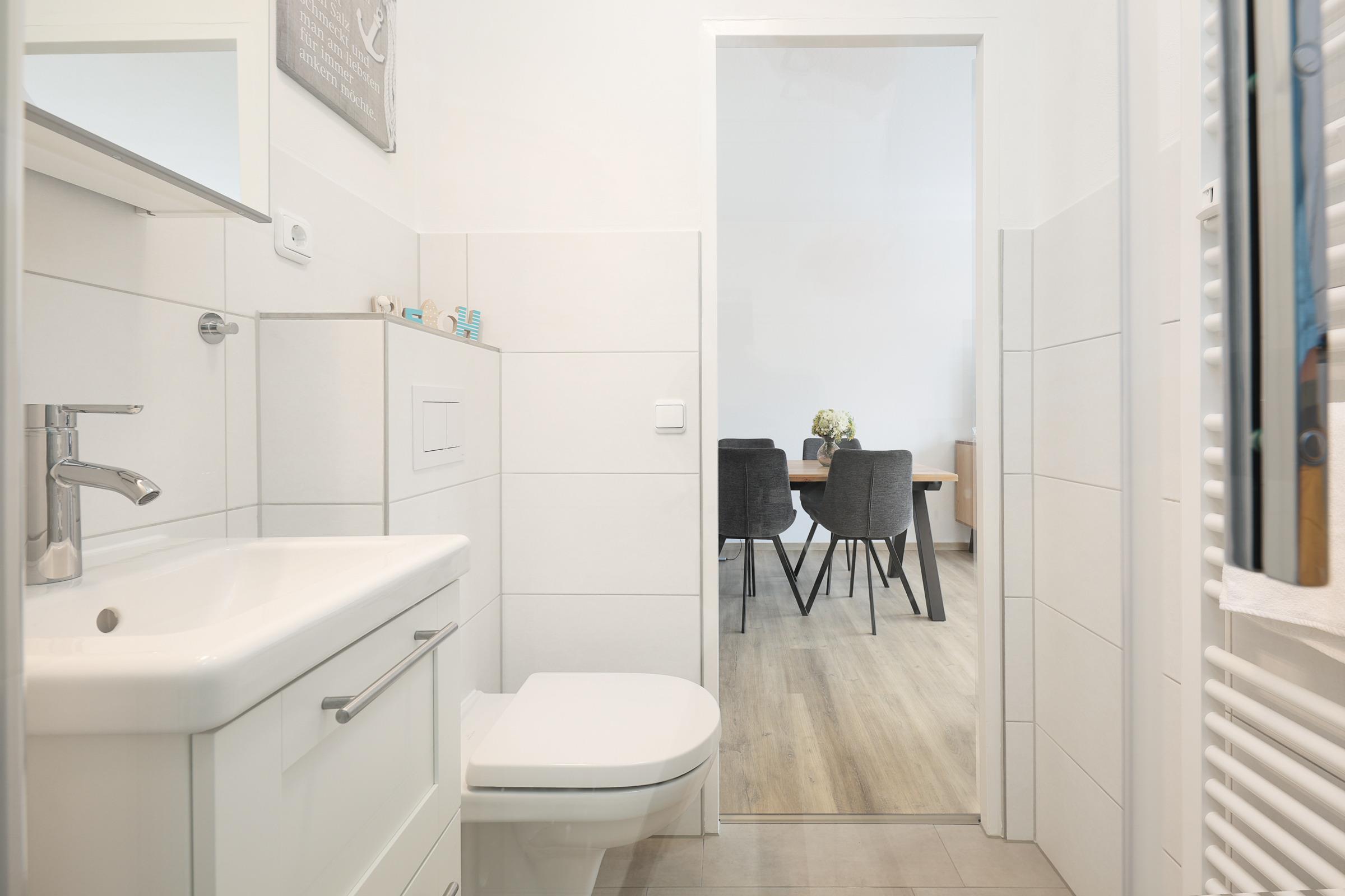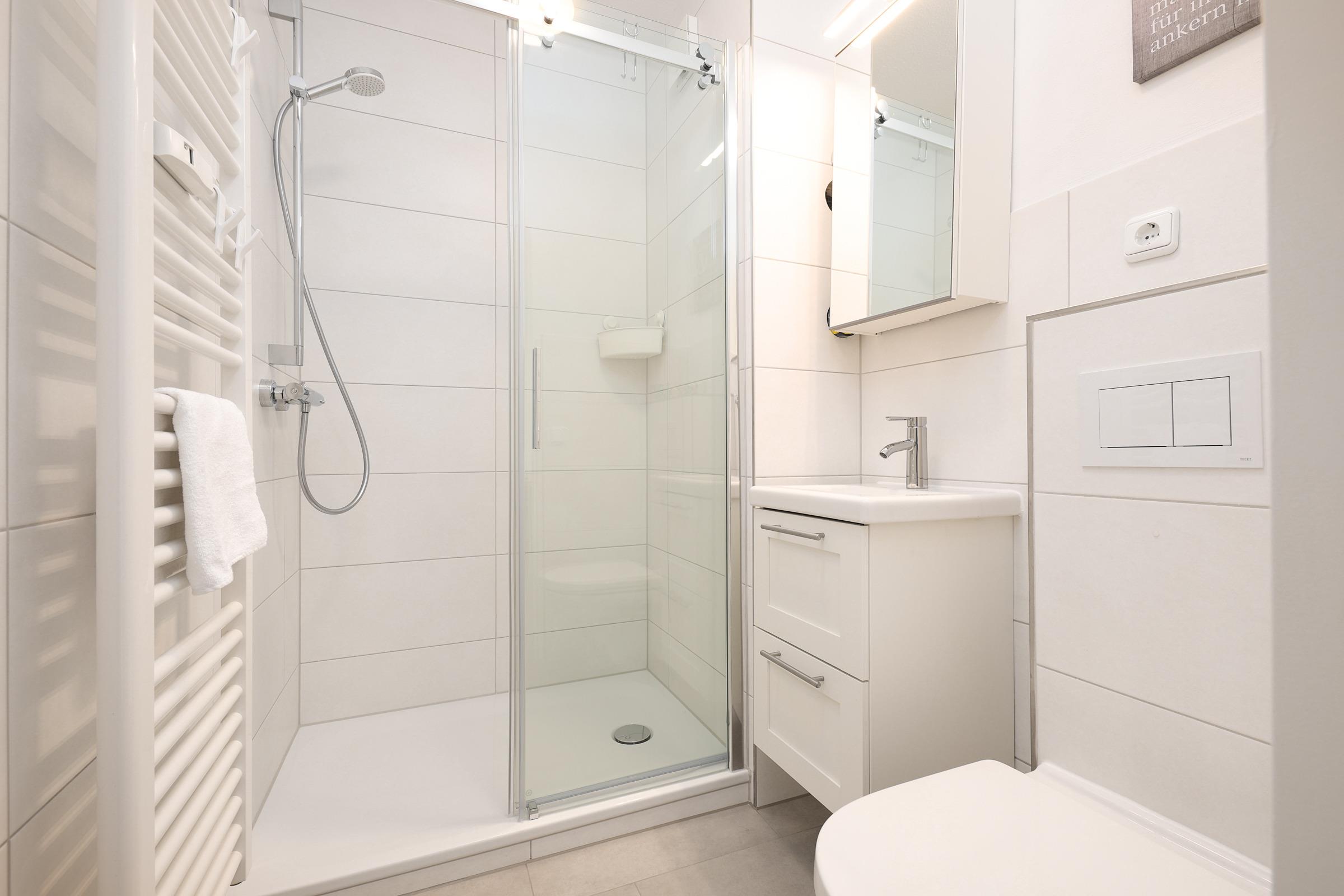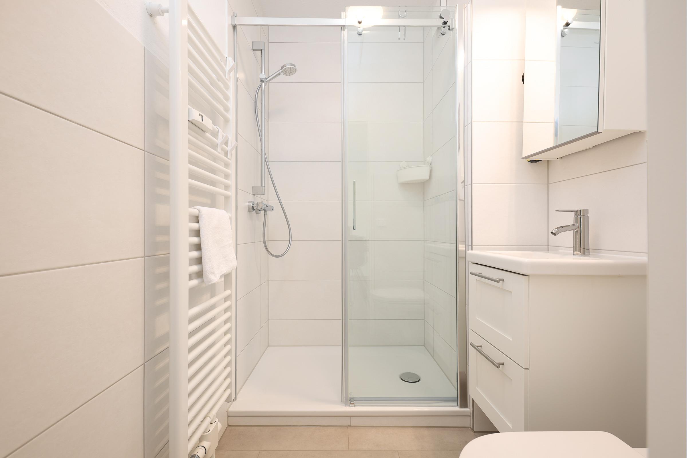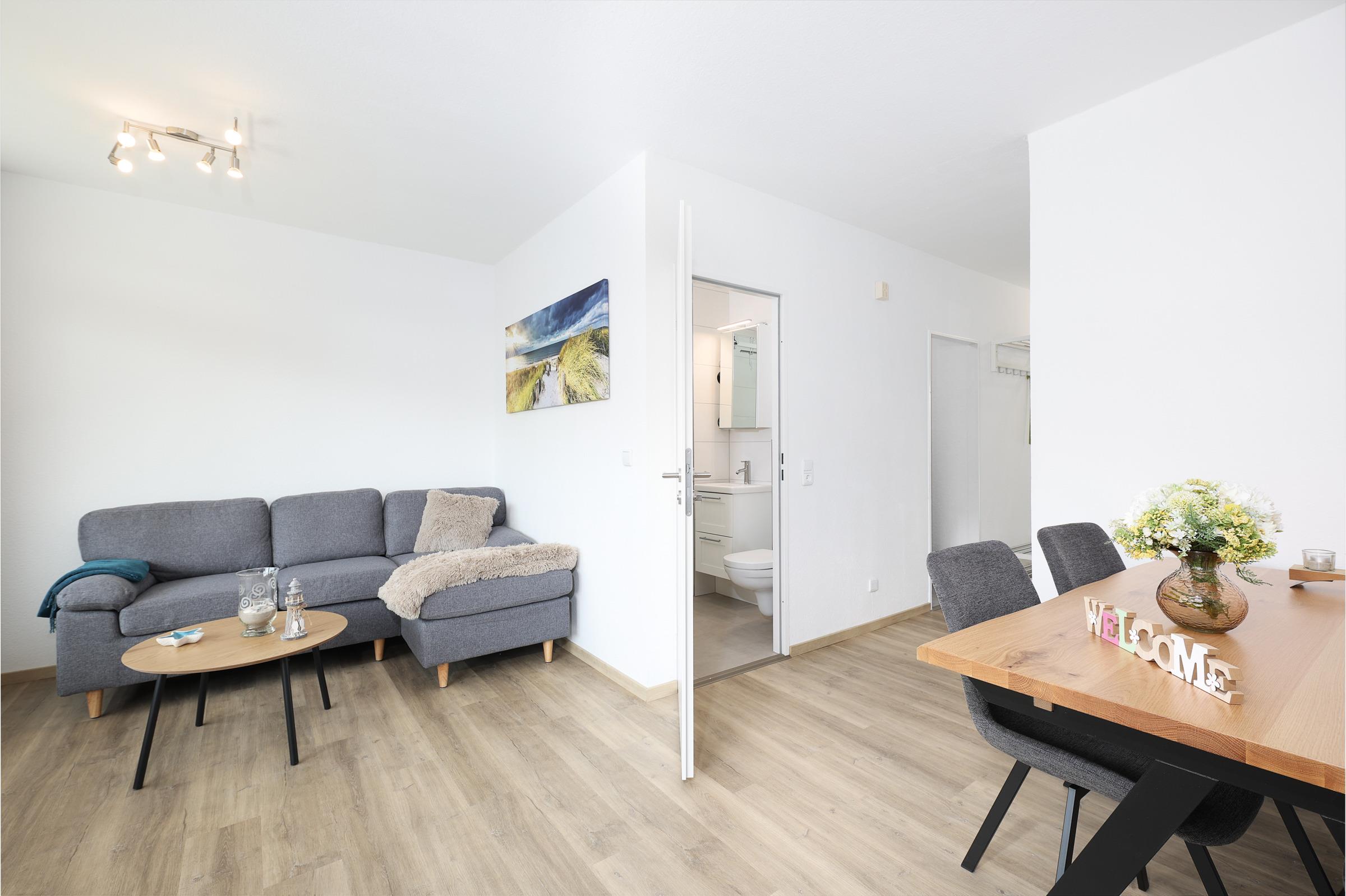 Der Wohnbereich, ausgestattet mit einen Flachbildschirm, verfügt über eine schöne Essecke und ein großes gemütliches Sofa. WLAN ist selbstverständlich in allen Räumen verfügbar. Das erste Schlafzimmer ist mit einem Doppelbett (140x200 cm) und einem Kleiderschrank ausgestattet, während das zweite Schlafzimmer über zwei Einzelbetten (je 90x190 cm) verfügt. Das Badezimmer überzeugt mit einer großen Dusche. Somit können Sie den Tag erfrischend starten.