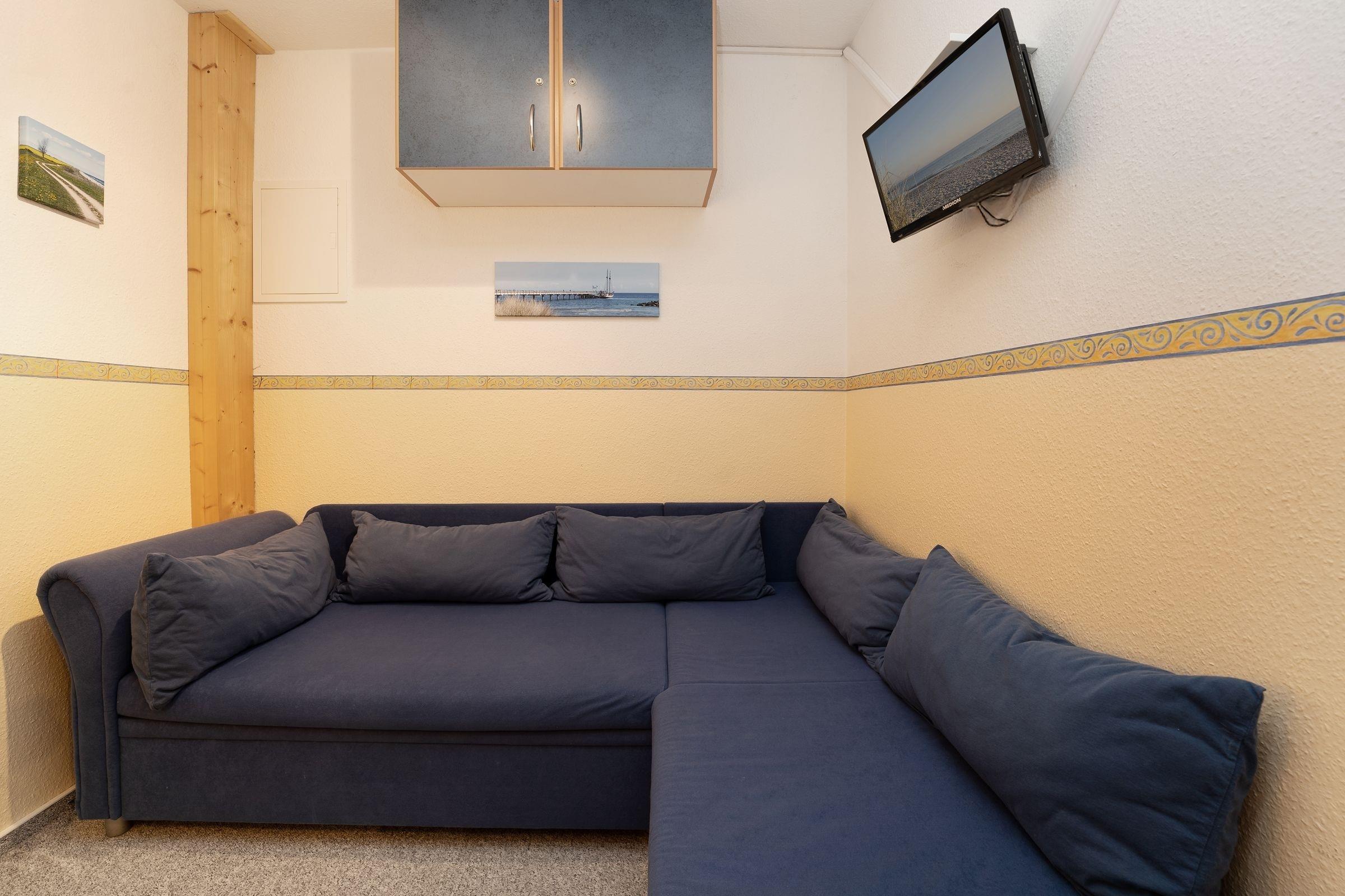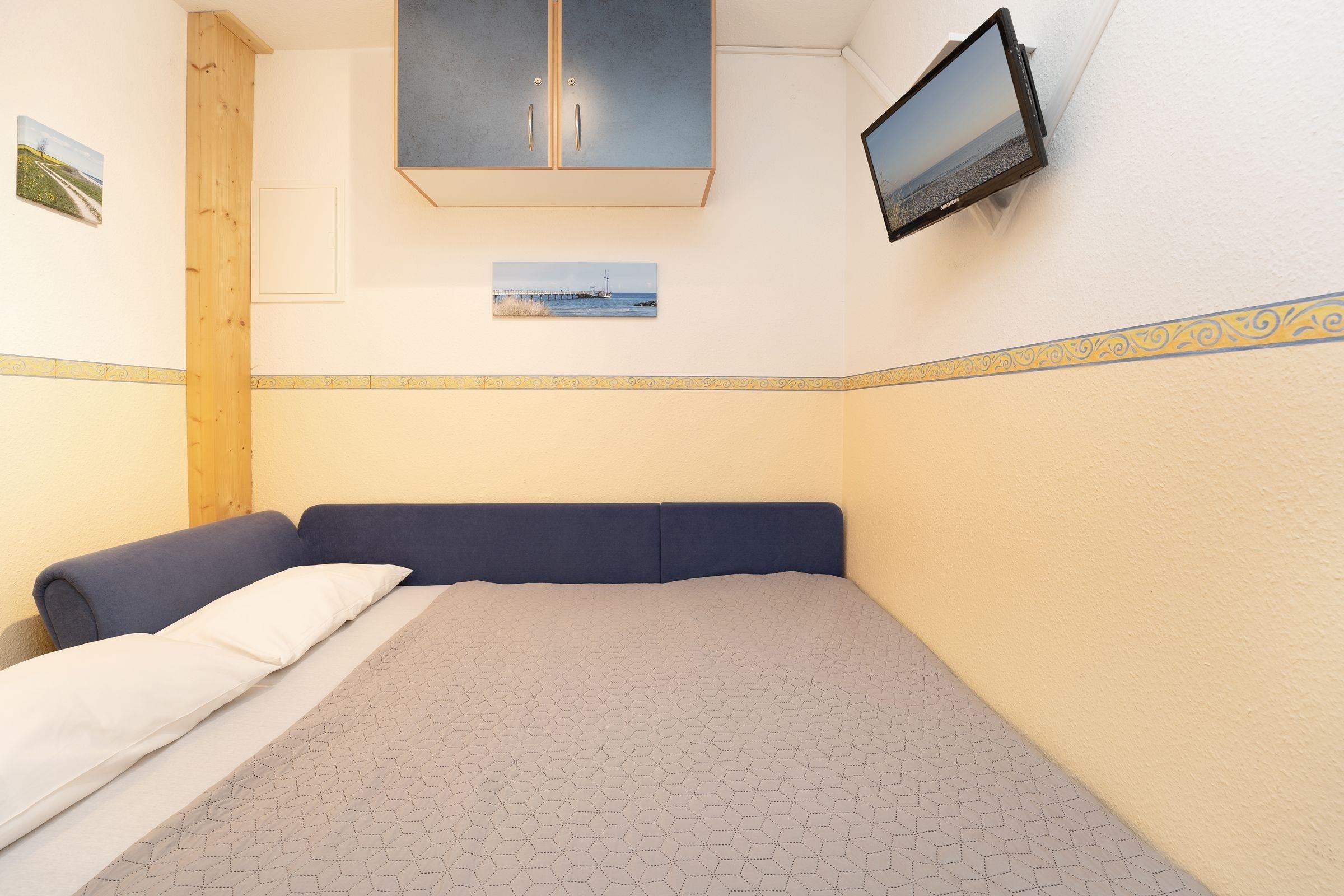 Schlafzimmer 2: Schlafsofa für 1 Person (ca. 150x200 cm), TV, Kommode, durch Schiebetür vom Wohnzimmer getrennt