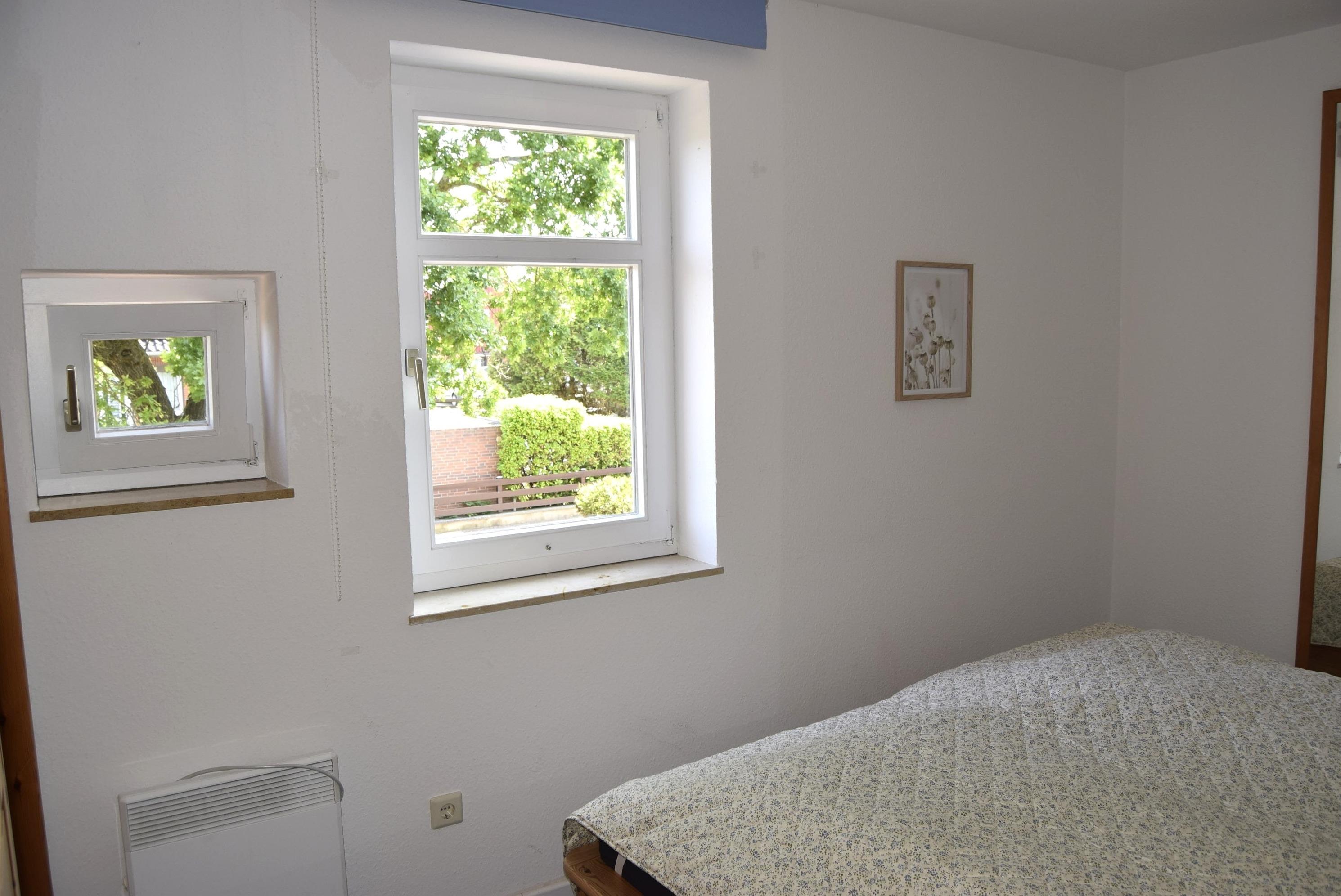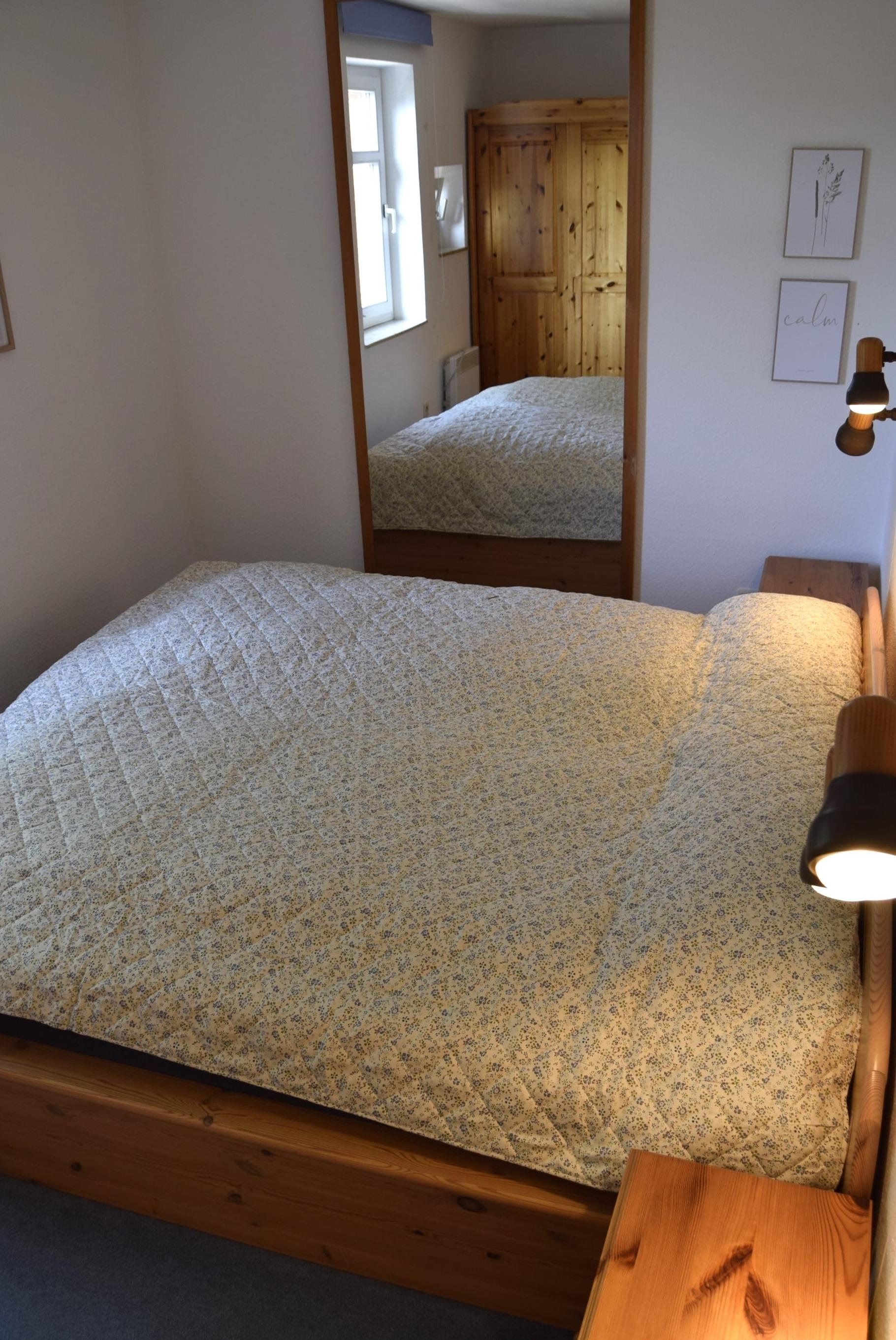 Ein behaglich gestaltetes Schlafzimmer mit einem Doppelbett (180 x 200 cm, bestehend aus zwei Matratzen) sowie reichlich Stauraum in einem großen Kleiderschrank rundet die Wohnung perfekt ab.