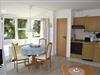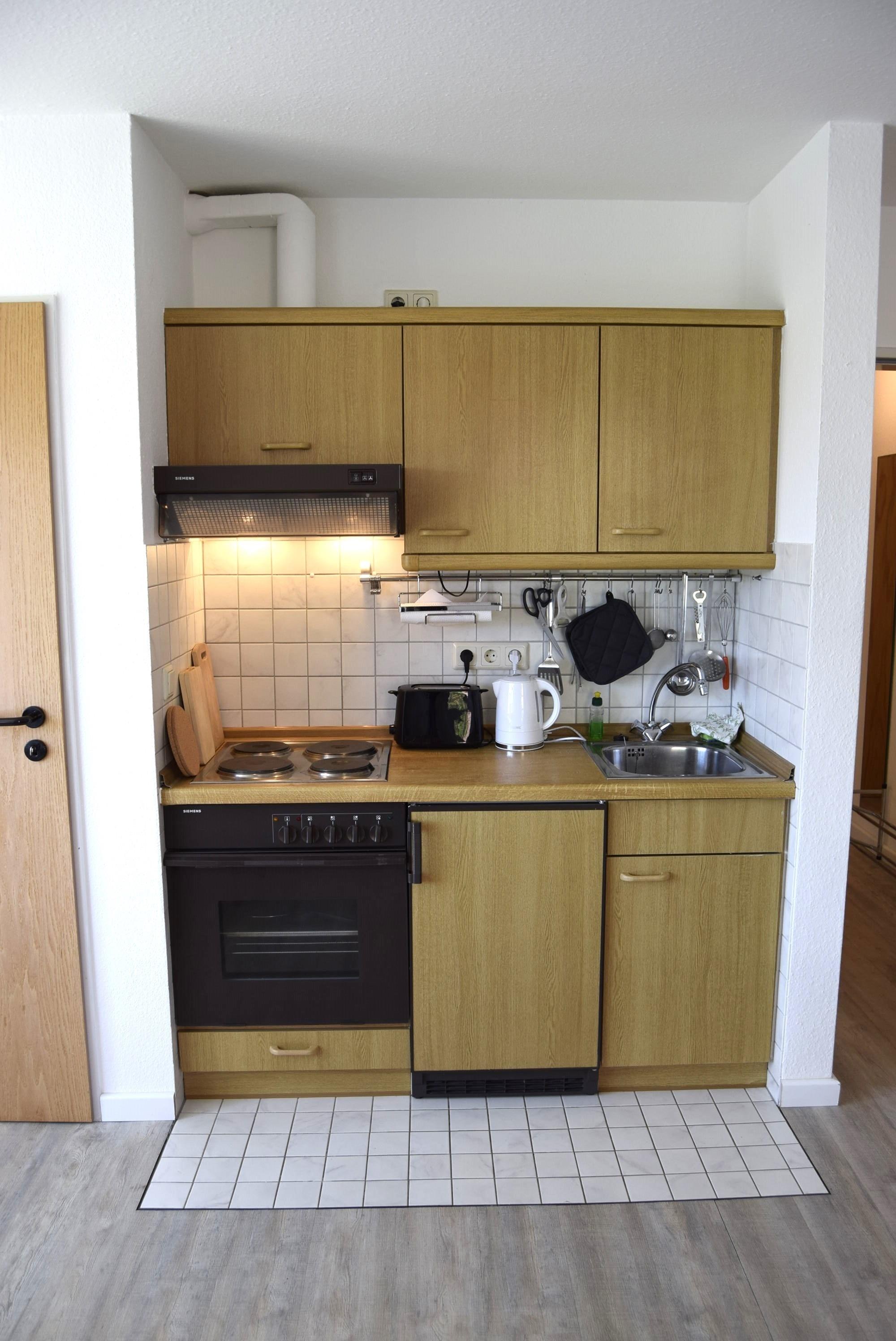 Die Wohnküche ist kompakt und funktional eingerichtet, verfügt über vier Herdplatten, einen Backofen sowie die gängigen Küchengeräte, die für eine komfortable Selbstversorgung sorgen.