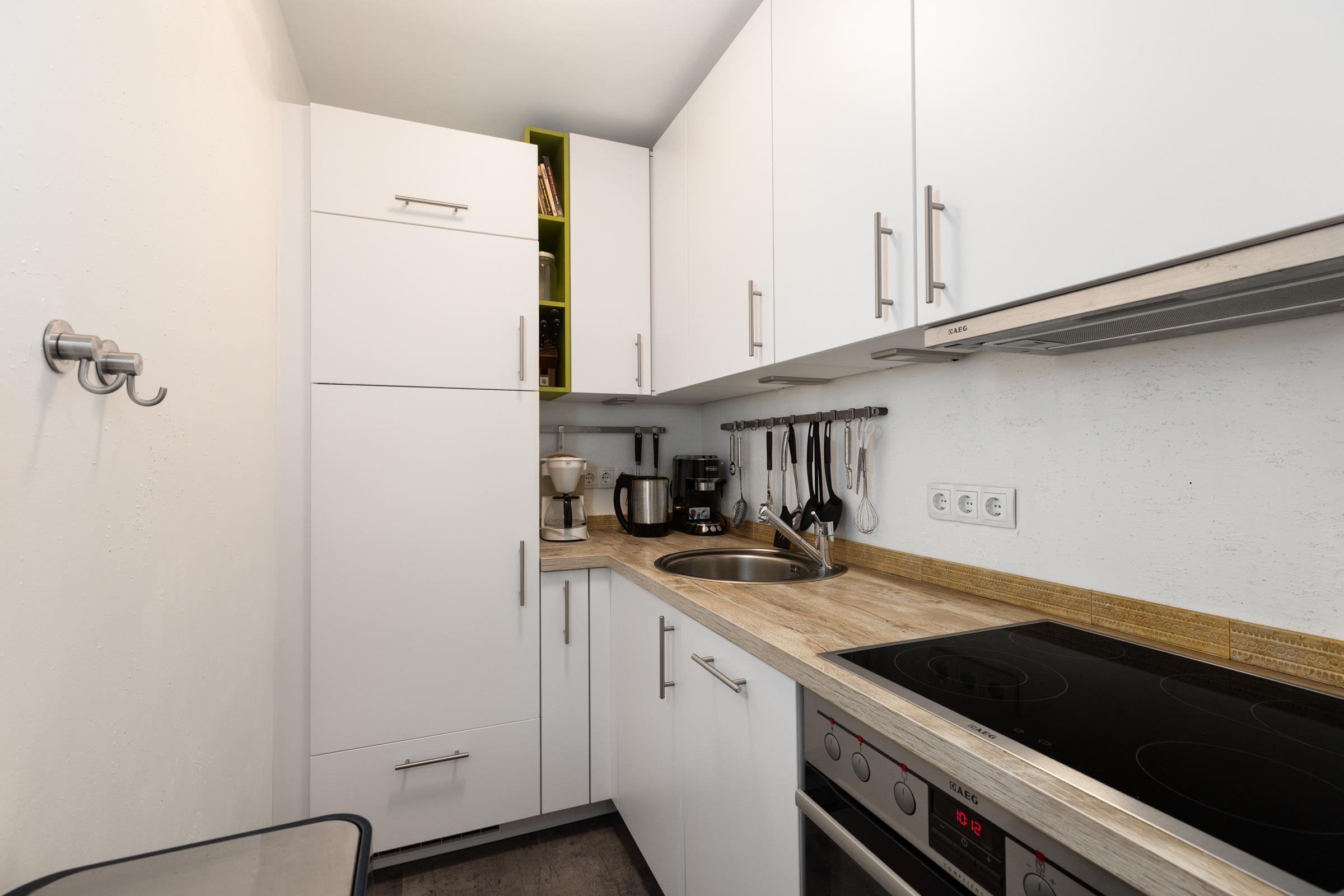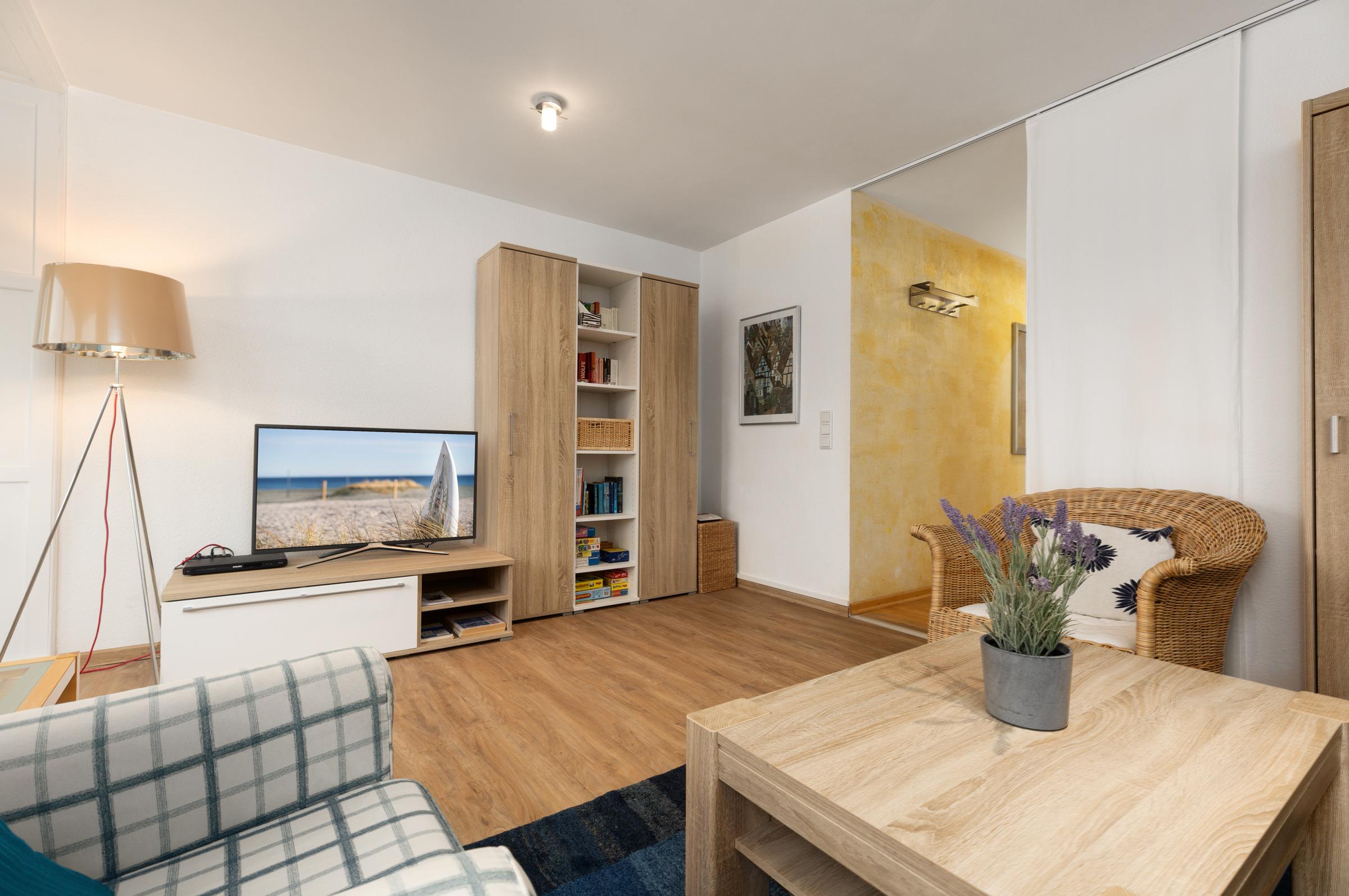 Die liebevoll eingerichtete Ferienwohnung besticht durch ihre helle, freundliche Atmosphäre und bietet alles, was man für einen entspannten Aufenthalt an der Ostsee benötigt. Im modernen Wohnbereich laden eine bequeme Couch, ein Flachbild-TV und WLAN zum Wohlfühlen ein. An den Wohnraum angrenzend befindet sich die Loggia – ideal, um den Tag ausklingen zu lassen. Die Küche ist mit Backofen, Cerankochfeld, Kühlschrank mit Gefrierfach, Wasserkocher, Mixer, Toaster und Geschirrspüler ausgestattet und lässt keine Wünsche offen. Ein absolutes Highlight ist die Siebträger-Kaffeemaschine und lässt jedes Kaffeeliebhaber-Herz höher schlagen. Der angrenzende Essbereich bietet Platz für gemeinsame Mahlzeiten. Im Schlafzimmer sorgt ein komfortables Boxspringdoppelbett für erholsame Nächte. Eine weitere Schlafmöglichkeit bietet das Schlafsofa im Wohnbereich. Das Badezimmer ist modern gestaltet und verfügt über einen Haartrockner.