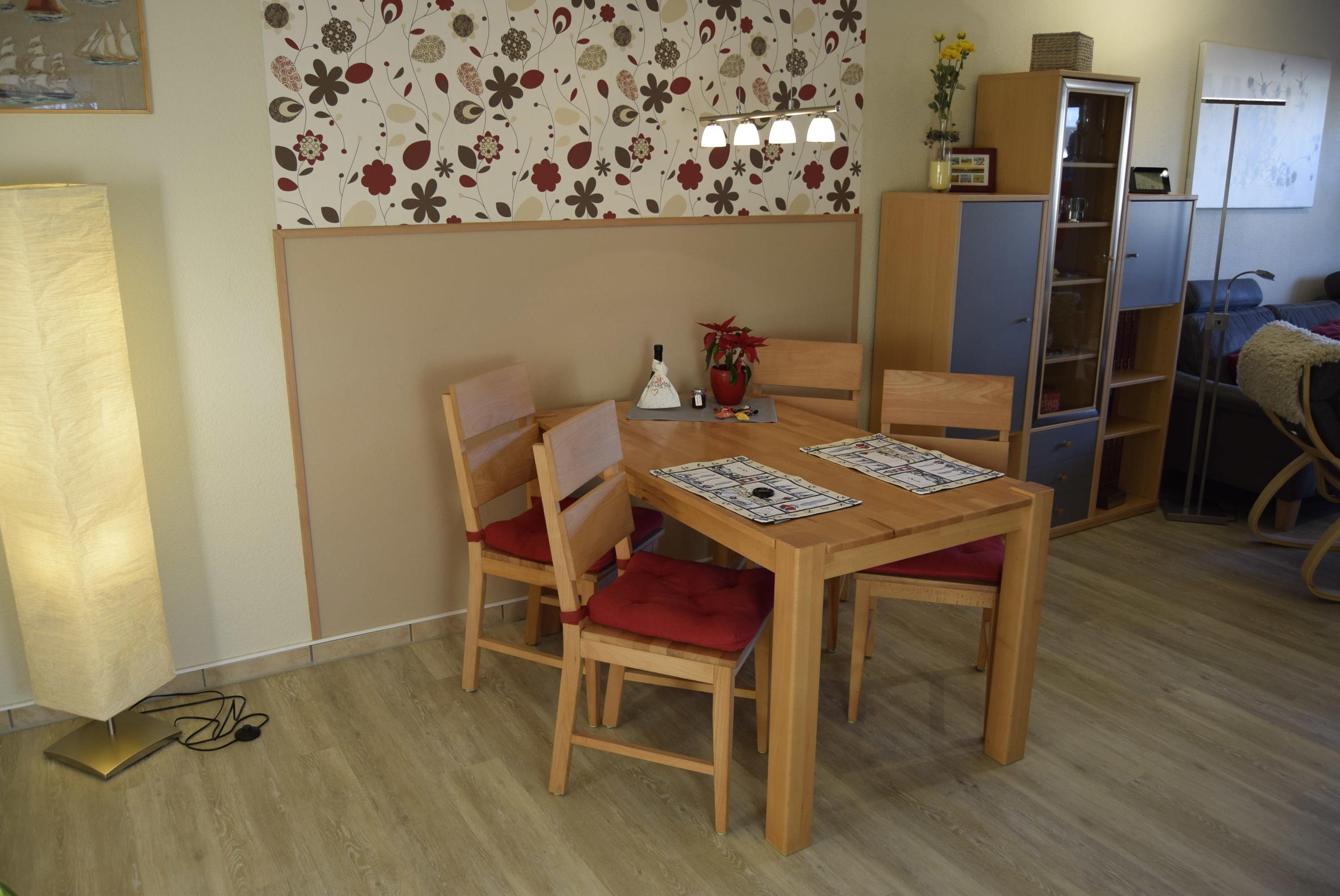 Im geräumigen Wohn- und Esszimmer haben sie genügend Platz. An dem großen Esstisch können Sie nicht nur essen, sondern auch spannende Spieleabende verbringen. In der gemütlichen Sofaecke lässt es sich herrlich relaxen, lesen, Musik hören, DVDs sehen oder die eine oder andere Lieblingssendung im TV verfolgen. Über Internet sind Mediatheken und Netflix verfügbar. Telefon und schnelles W-LAN stehen ebenso kostenfrei zur Verfügung.